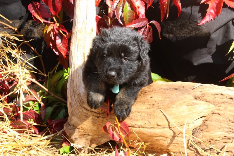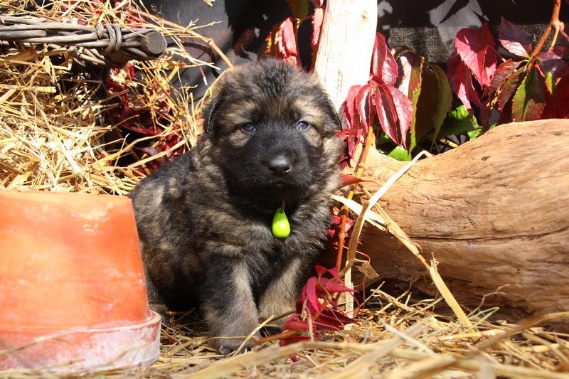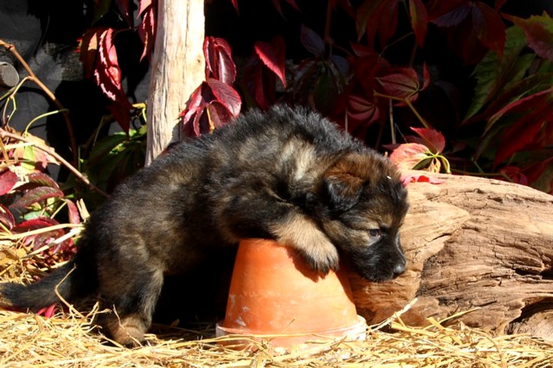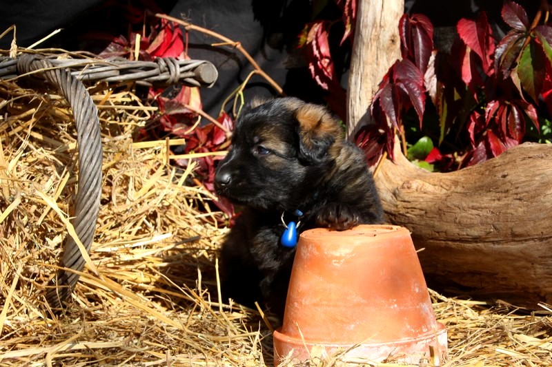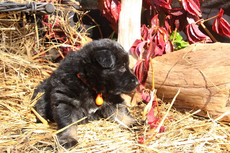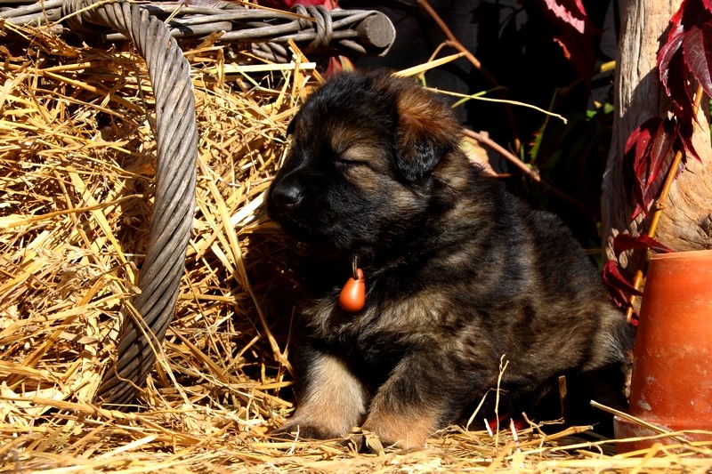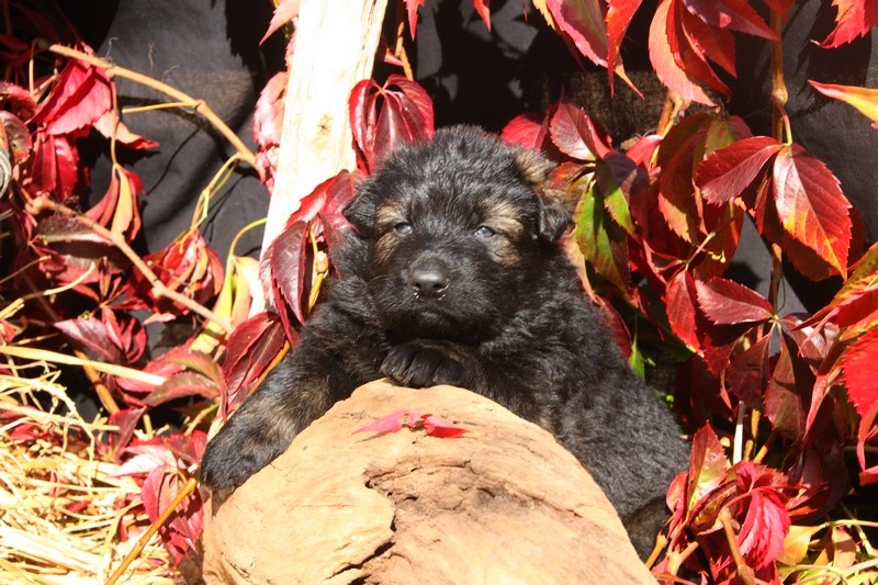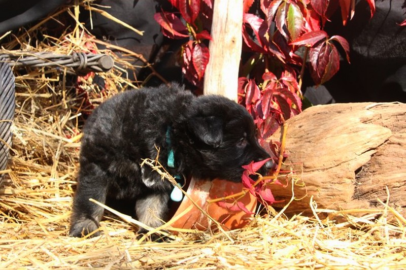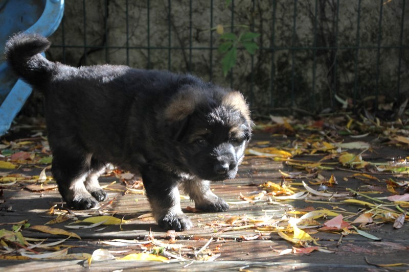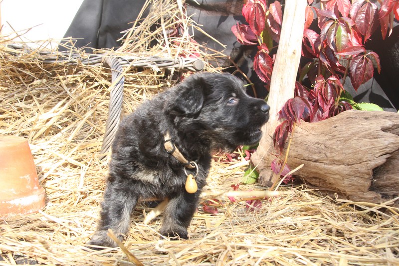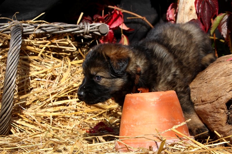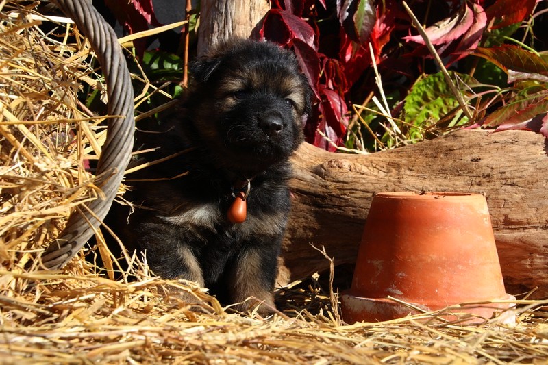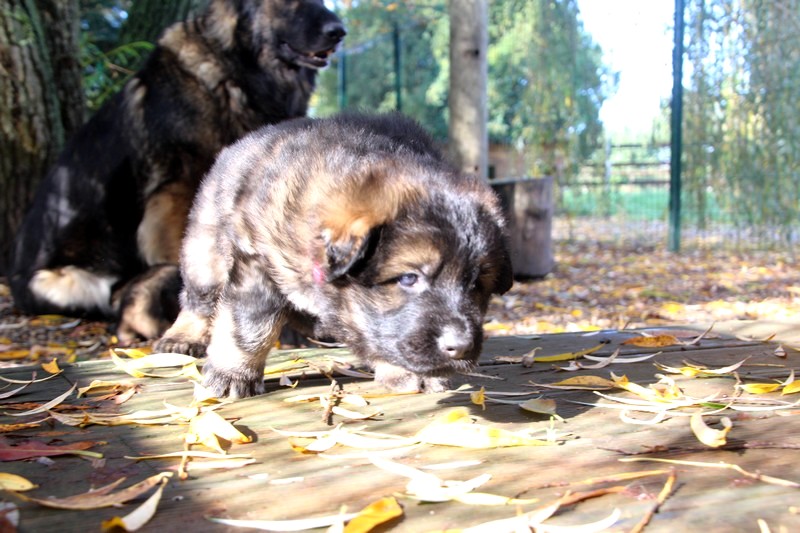 Notre première sortie s’est faite jeudi, dans le parc à chiots, sous un soleil automnale. Il semblerait que c’est là où nous allons apprendre à devenir autonomes et couper le cordon ombilical dans les futures semaines, cela ne nous inquiète pas trop, dès lors ou nous avons plus d’un cordon dans notre pelote… Hé oui ! tata Ice veut bien partager son lait avec nous et maman, elle donne aussi à manger à nos cousins. Si on rajoute à cela le restant de la meute qui nous materne, il va y avoir de quoi s’emmêler les cordons…