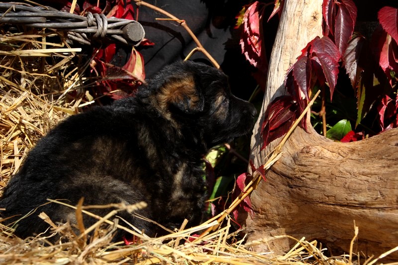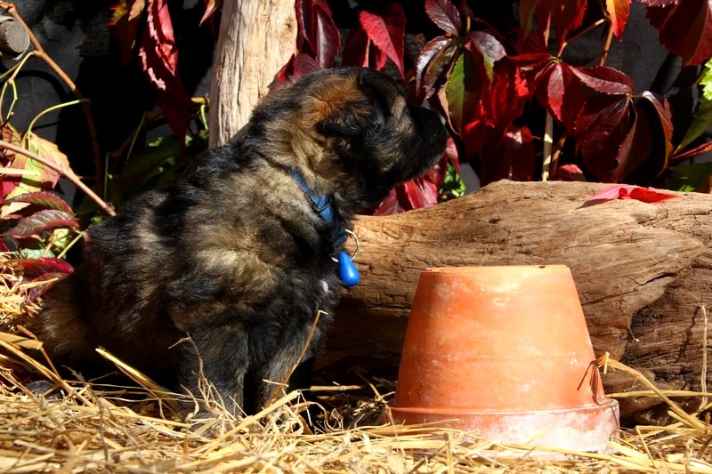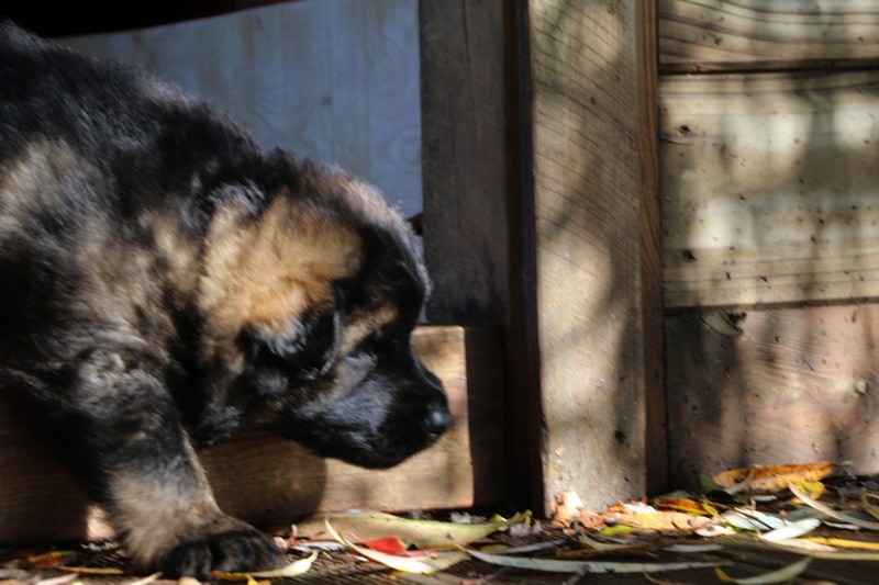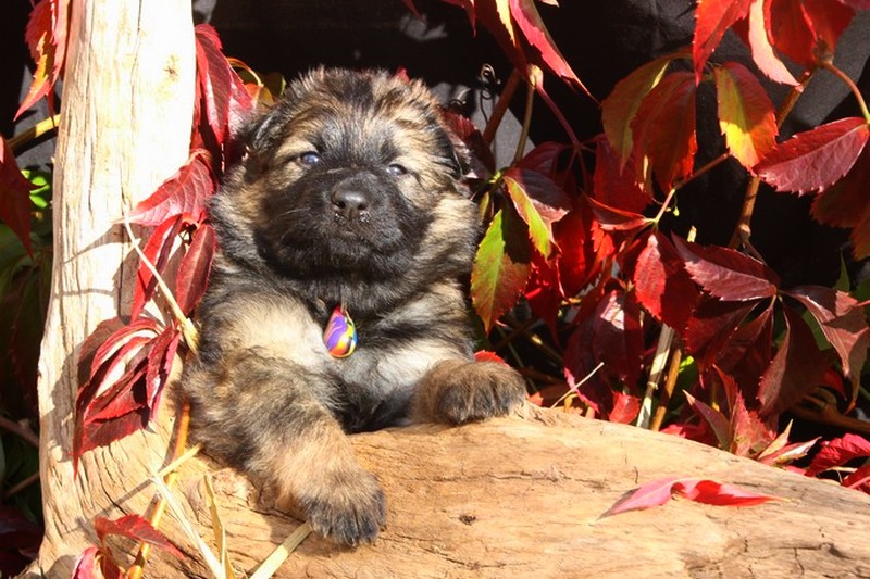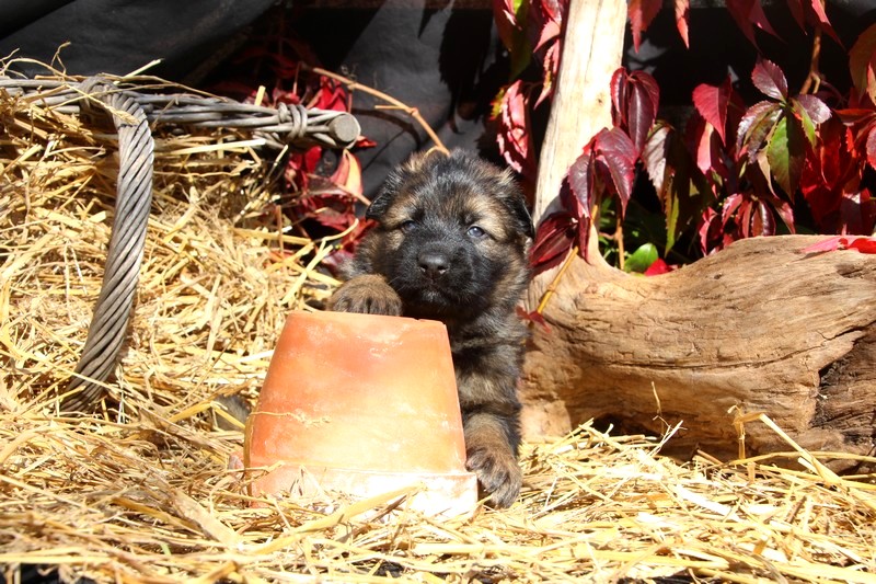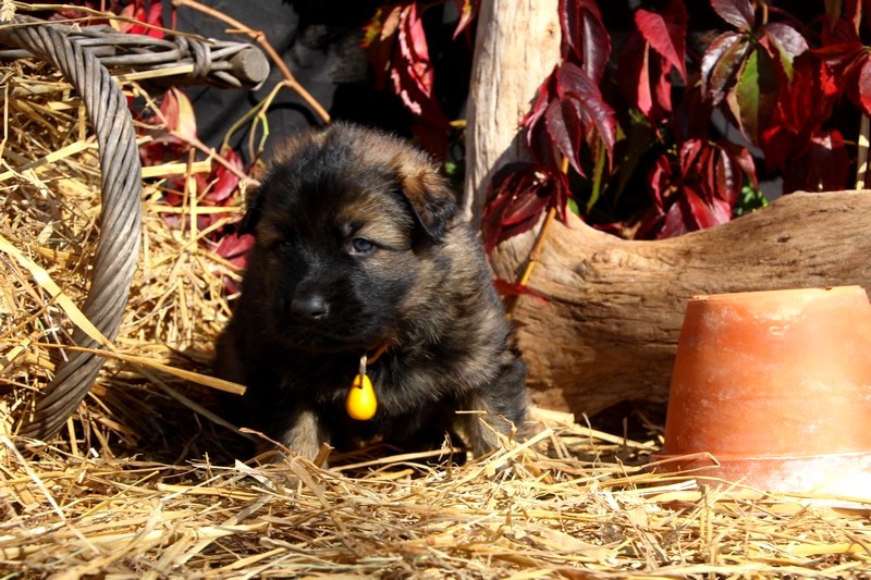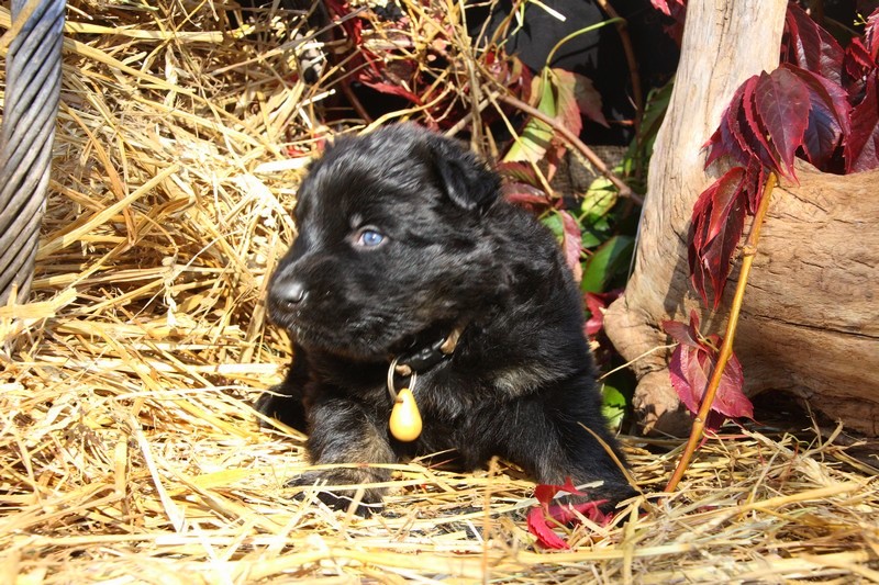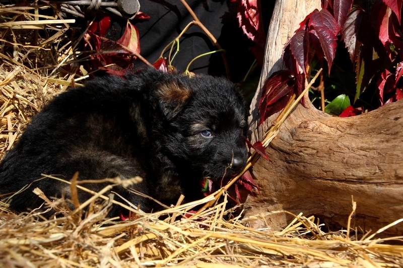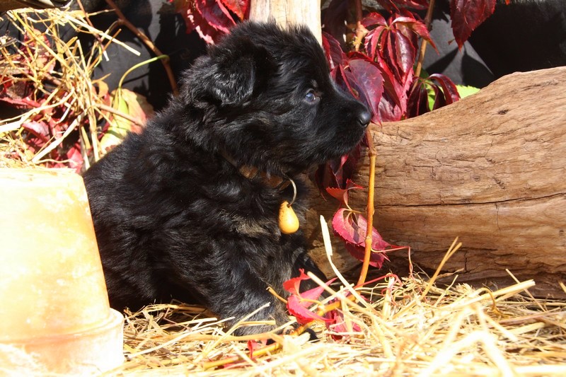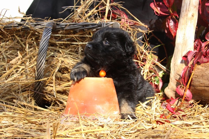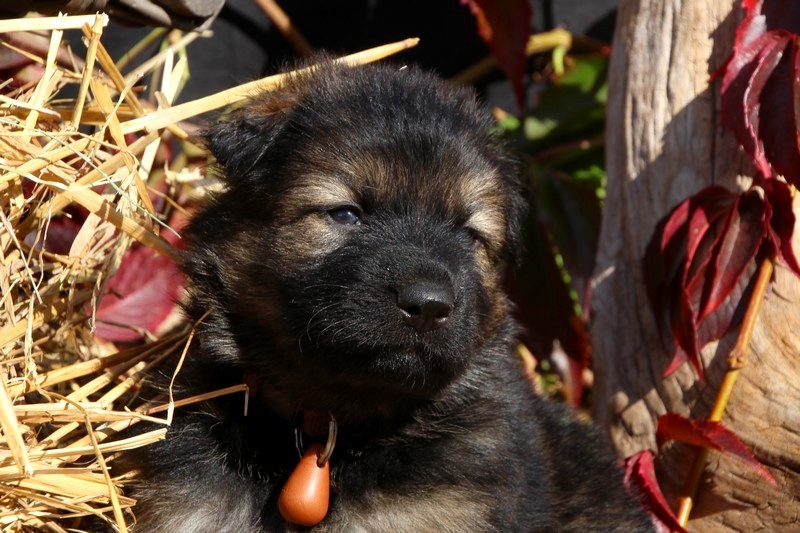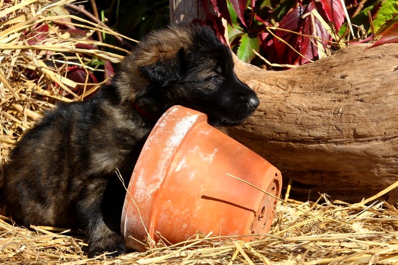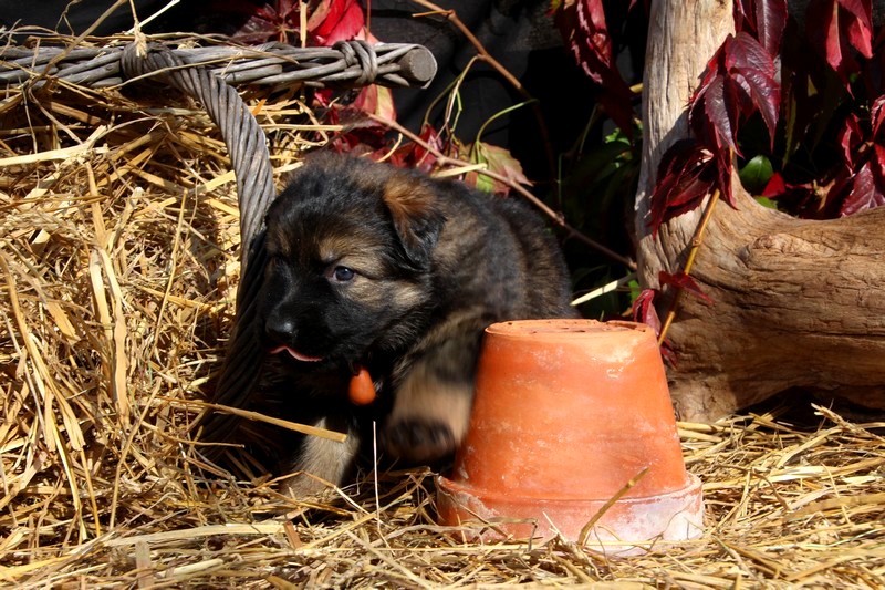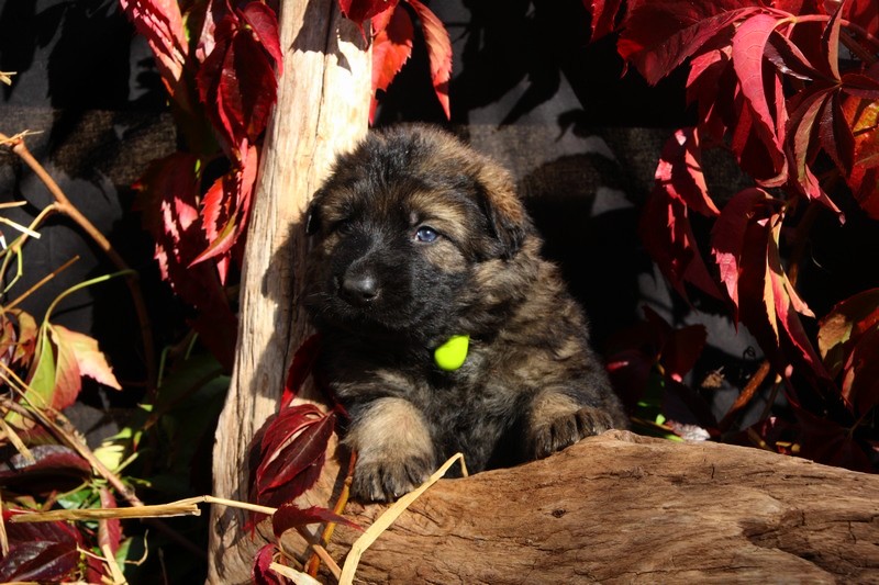 Notre première sortie s’est faite jeudi, dans le parc à chiots, sous un soleil automnale. Il semblerait que c’est là où nous allons apprendre à devenir autonomes et couper le cordon ombilical dans les futures semaines, cela ne nous inquiète pas trop, dès lors ou nous avons plus d’un cordon dans notre pelote… Hé oui ! tata Ice veut bien partager son lait avec nous et maman, elle donne aussi à manger à nos cousins. Si on rajoute à cela le restant de la meute qui nous materne, il va y avoir de quoi s’emmêler les cordons…