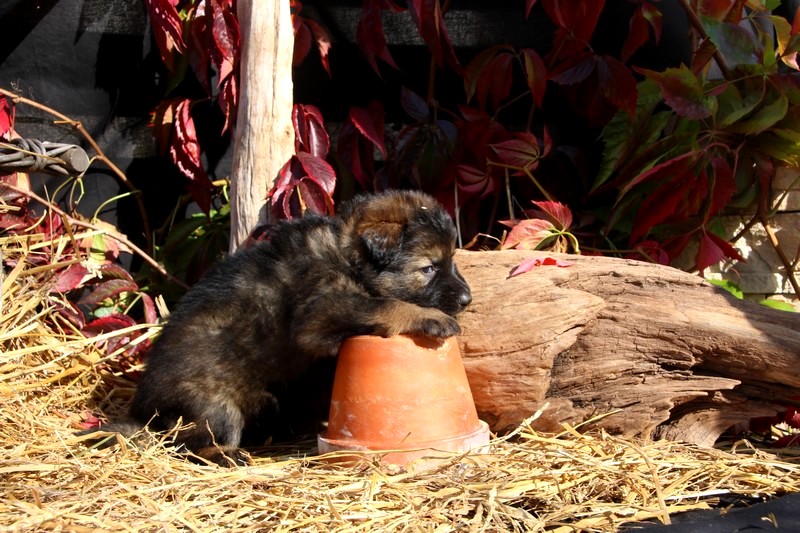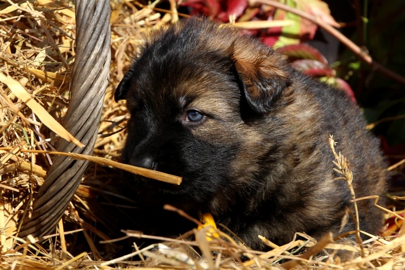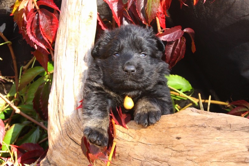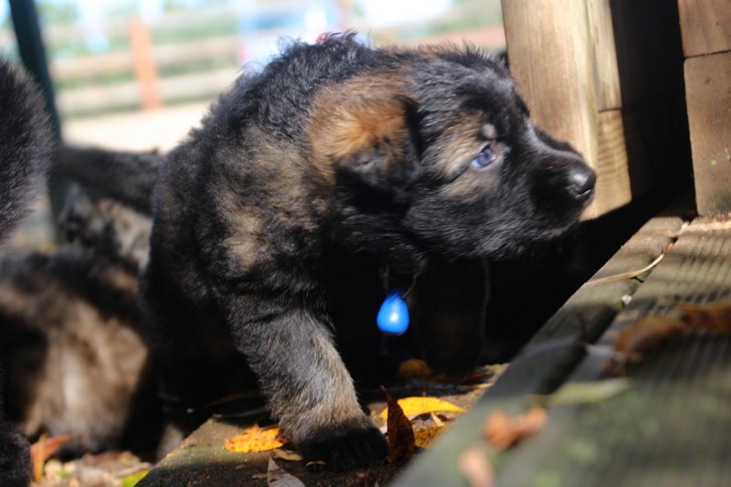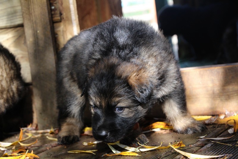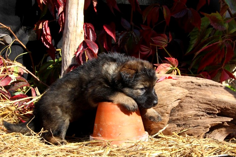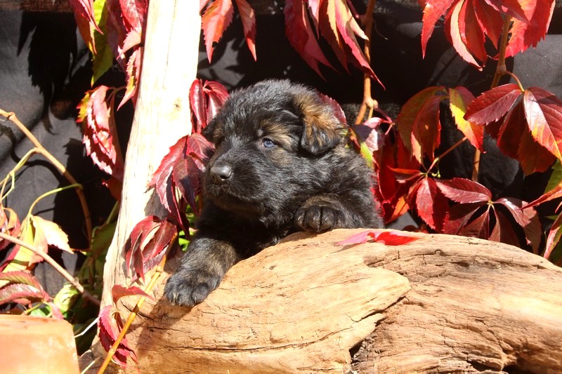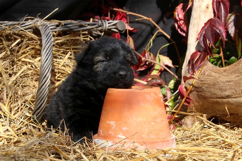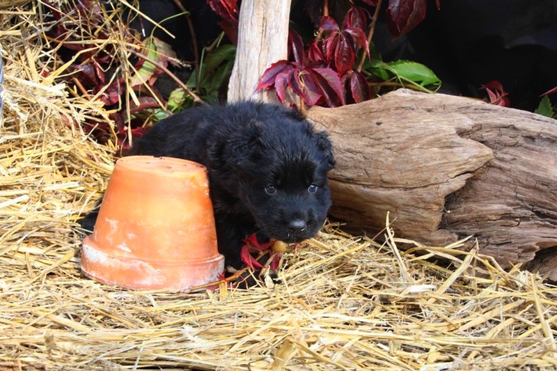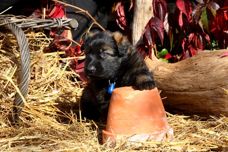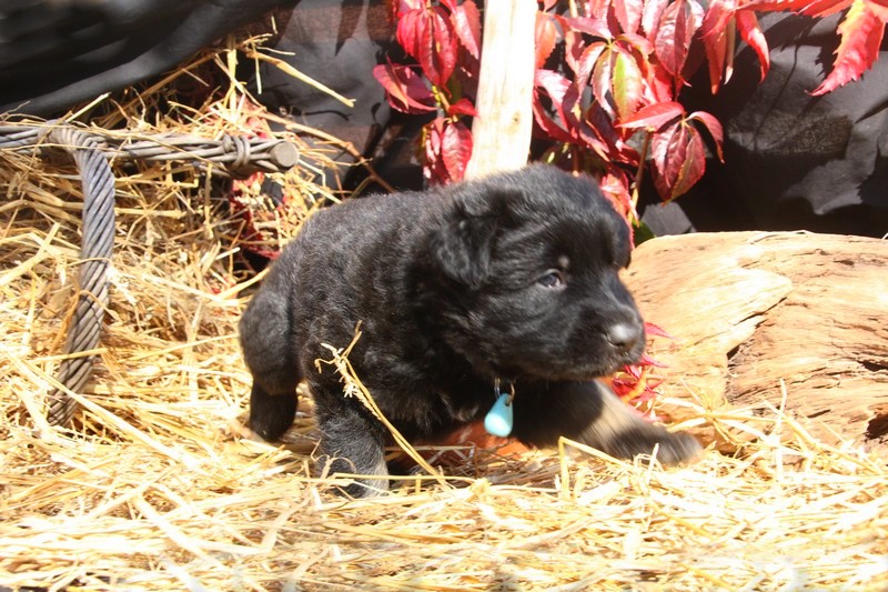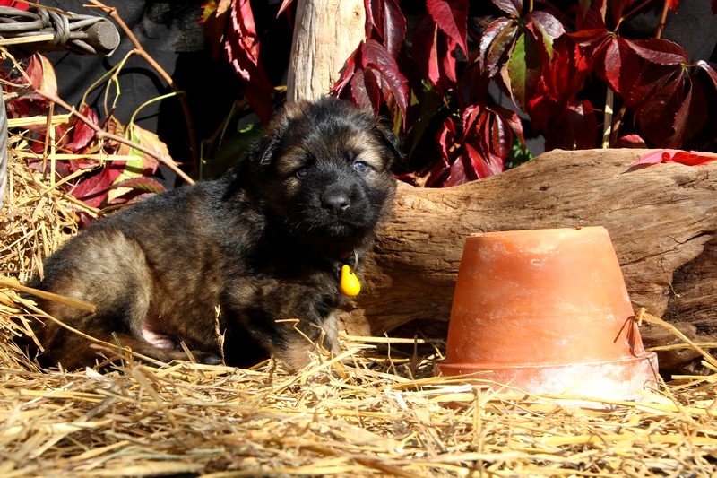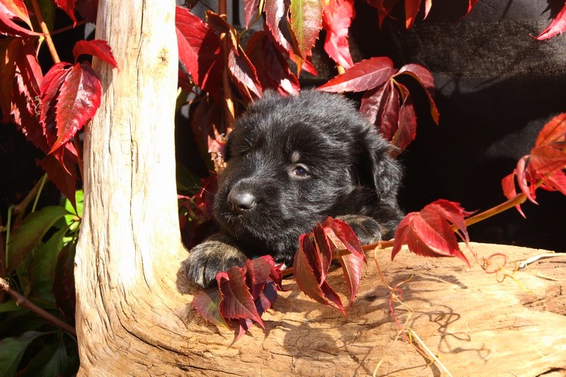 Notre première sortie s’est faite jeudi, dans le parc à chiots, sous un soleil automnale. Il semblerait que c’est là où nous allons apprendre à devenir autonomes et couper le cordon ombilical dans les futures semaines, cela ne nous inquiète pas trop, dès lors ou nous avons plus d’un cordon dans notre pelote… Hé oui ! tata Ice veut bien partager son lait avec nous et maman, elle donne aussi à manger à nos cousins. Si on rajoute à cela le restant de la meute qui nous materne, il va y avoir de quoi s’emmêler les cordons…