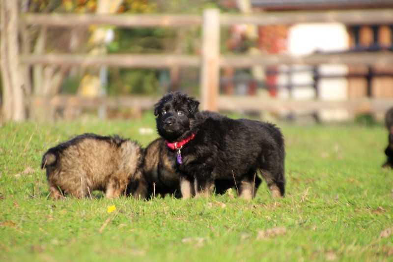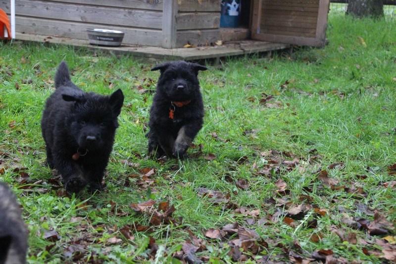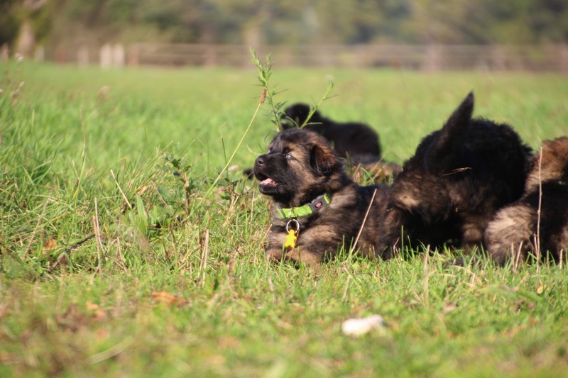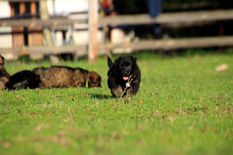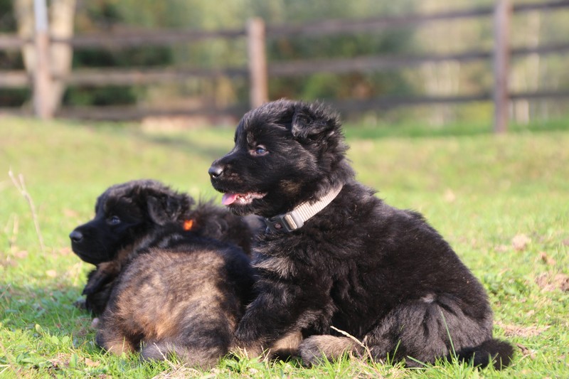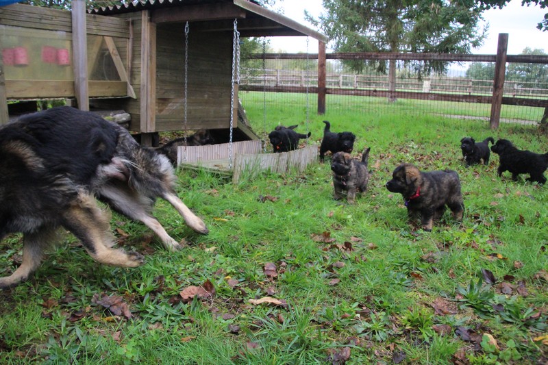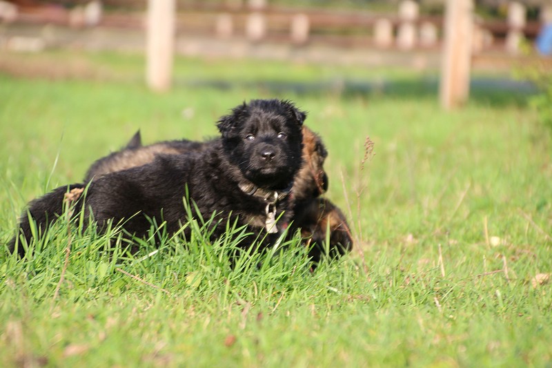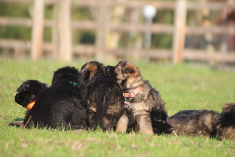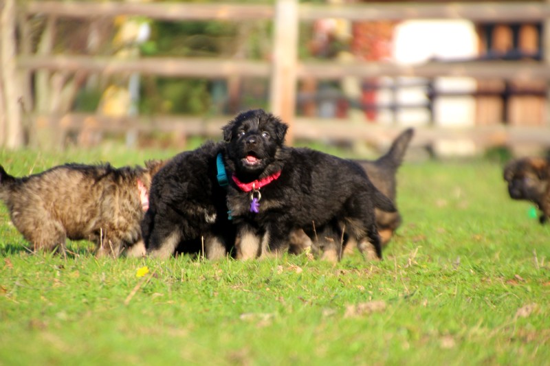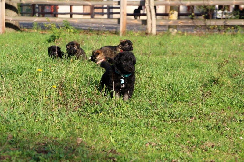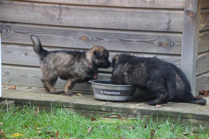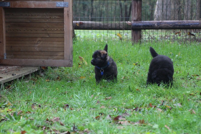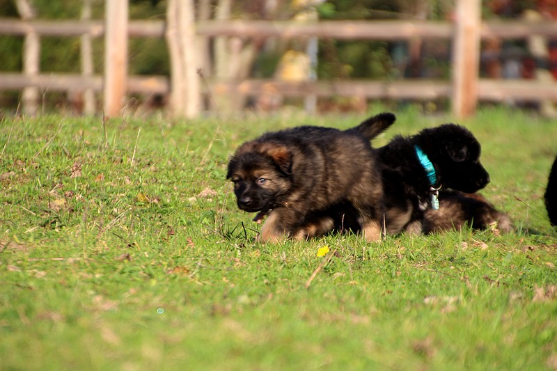 Hé coucou! c’est re nous, vous vous rendez compte ? Nous avons déjà 5 semaines et nous n’en finissons pas de découvrir la vie. Nous parlons très bien le langage canin grâce à la meute qui passe beaucoup de temps avec nous, nous arpentons le domaine par des petites promenades de-ci de-là et nous apprenons à nous repérer dans les grands espaces, bien sûr c’est toujours accompagnés de l’une de nos mamans voir les deux, mais aussi avec la meute entière. Nous savons également parfaitement faire les câlins aux humains et surtout réclamer les bras afin d’avoir nos petits moments privilégiés.