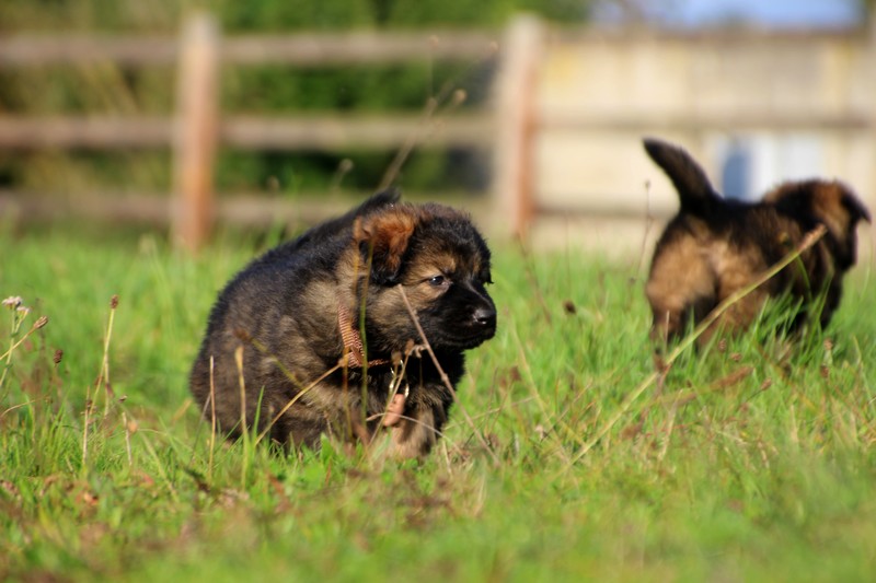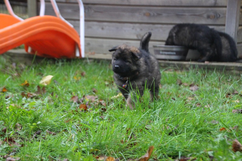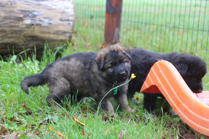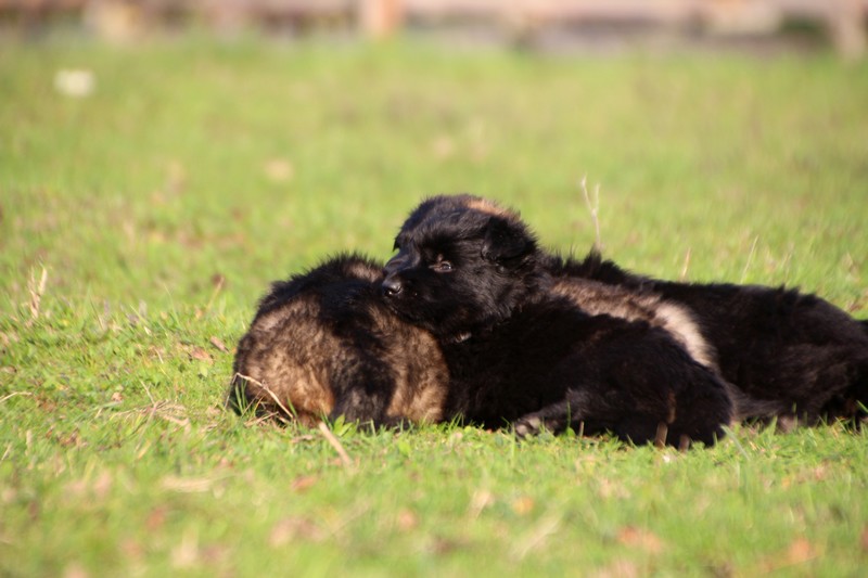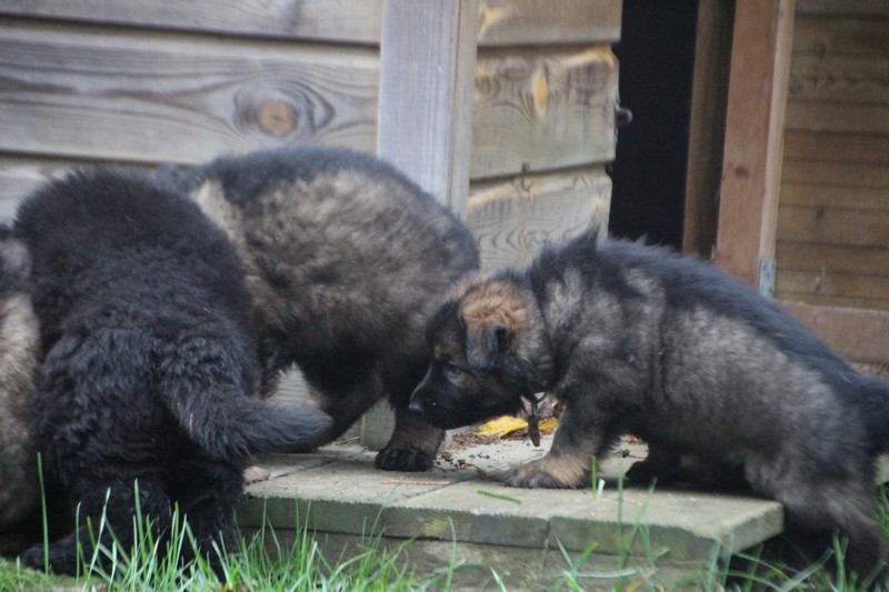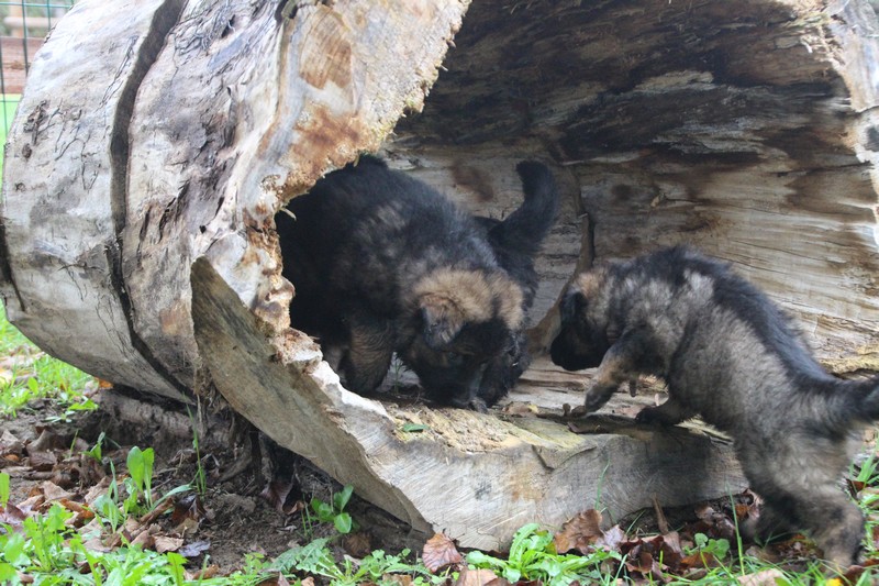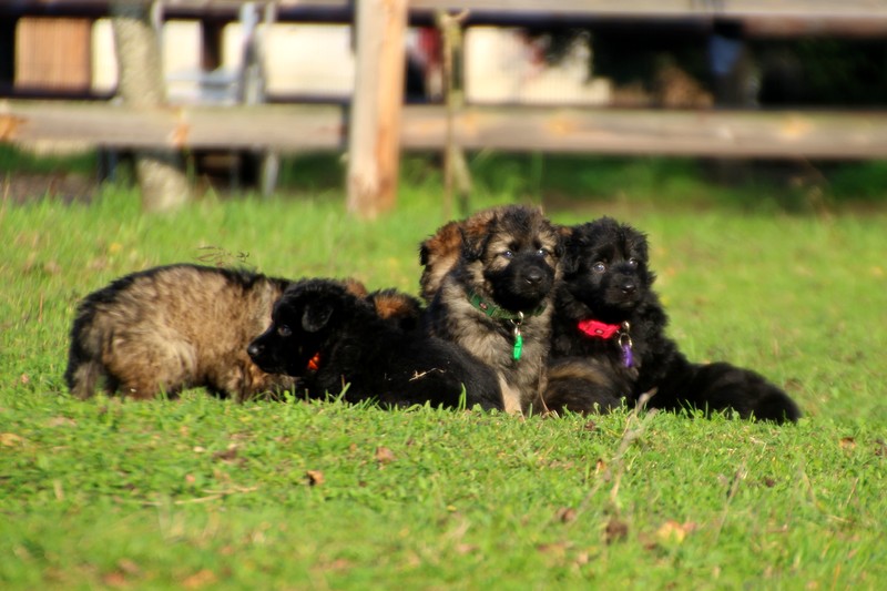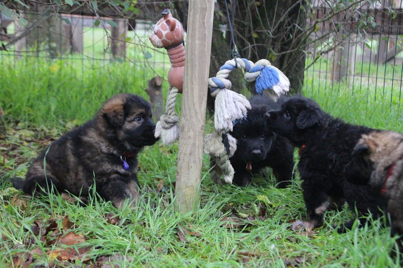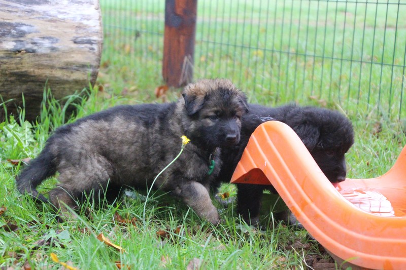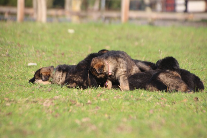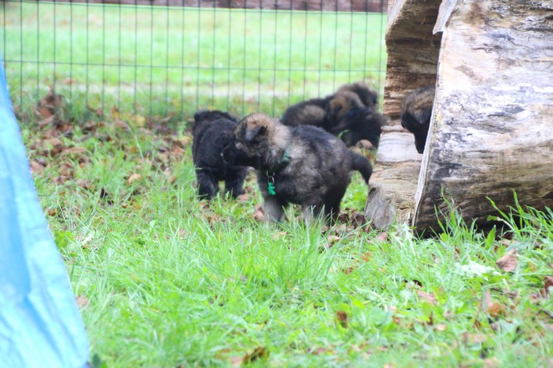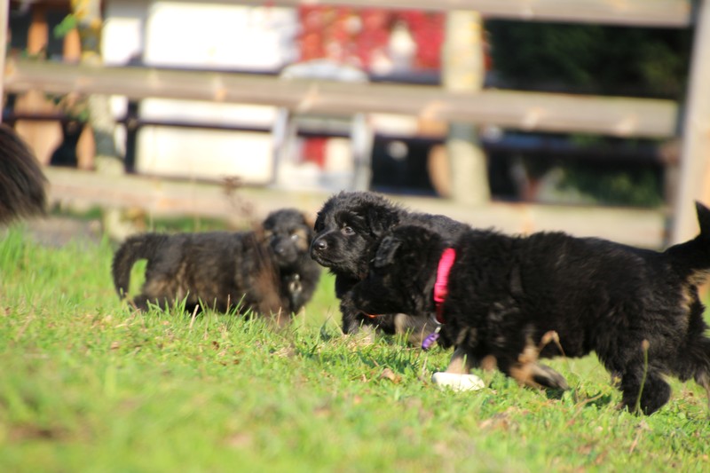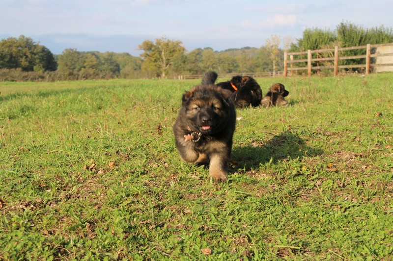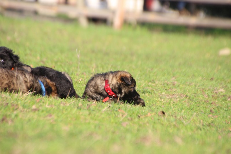 Hé coucou! c’est re nous, vous vous rendez compte ? Nous avons déjà 5 semaines et nous n’en finissons pas de découvrir la vie. Nous parlons très bien le langage canin grâce à la meute qui passe beaucoup de temps avec nous, nous arpentons le domaine par des petites promenades de-ci de-là et nous apprenons à nous repérer dans les grands espaces, bien sûr c’est toujours accompagnés de l’une de nos mamans voir les deux, mais aussi avec la meute entière. Nous savons également parfaitement faire les câlins aux humains et surtout réclamer les bras afin d’avoir nos petits moments privilégiés.