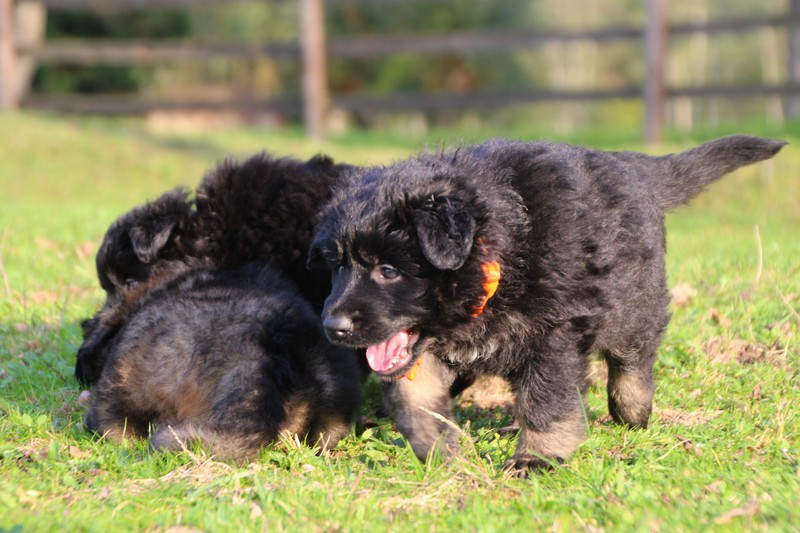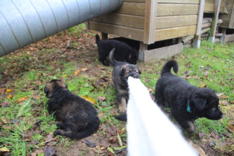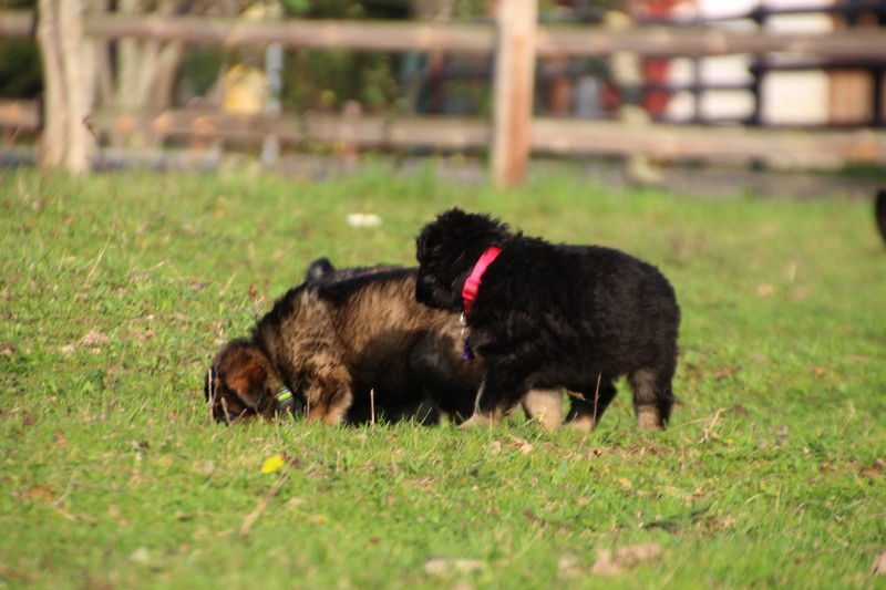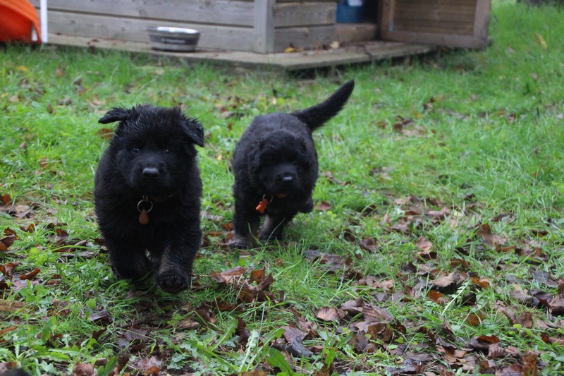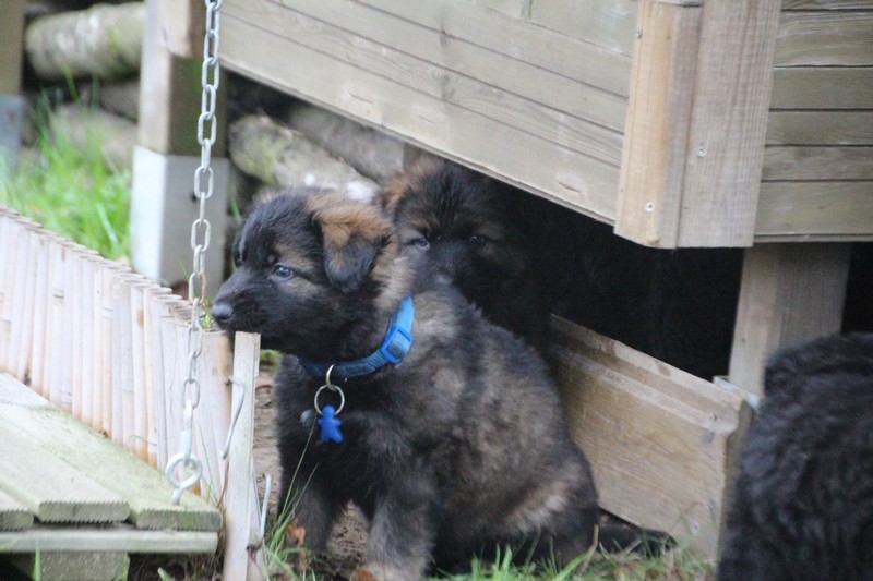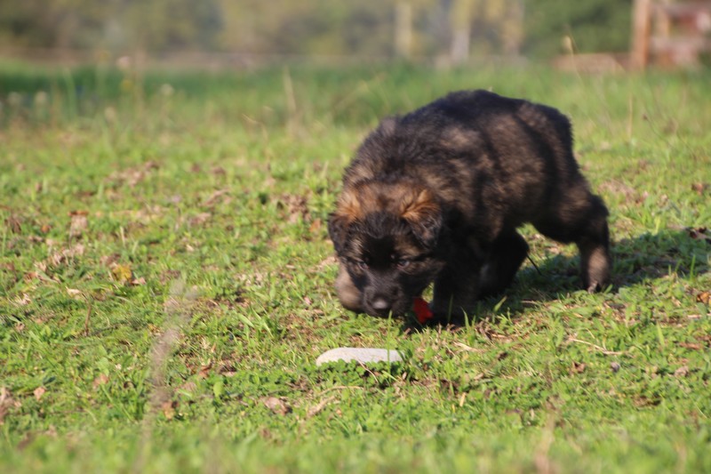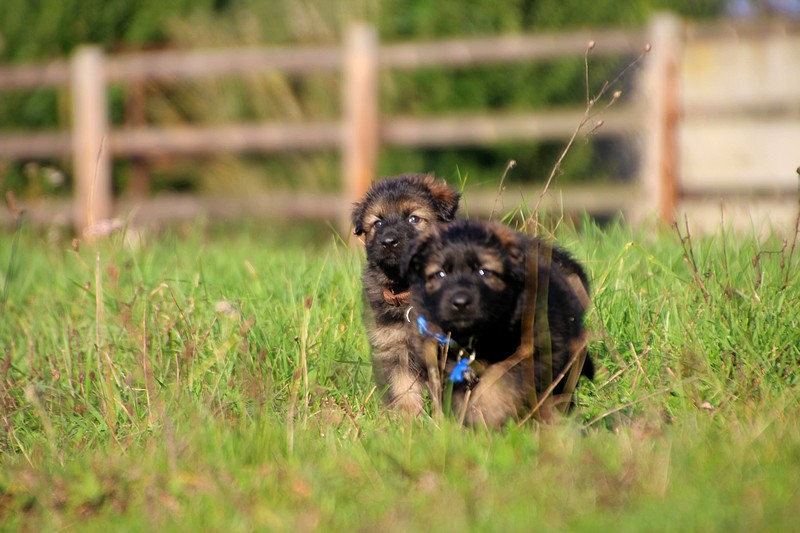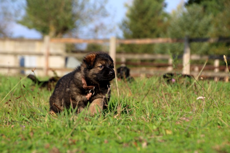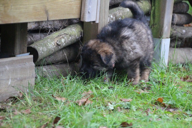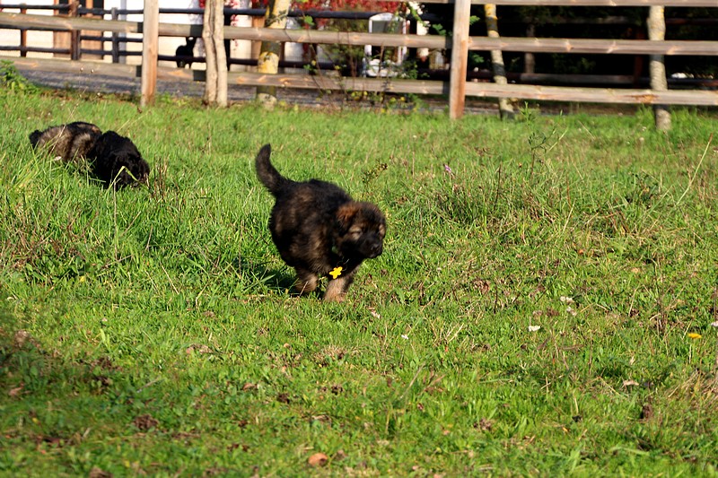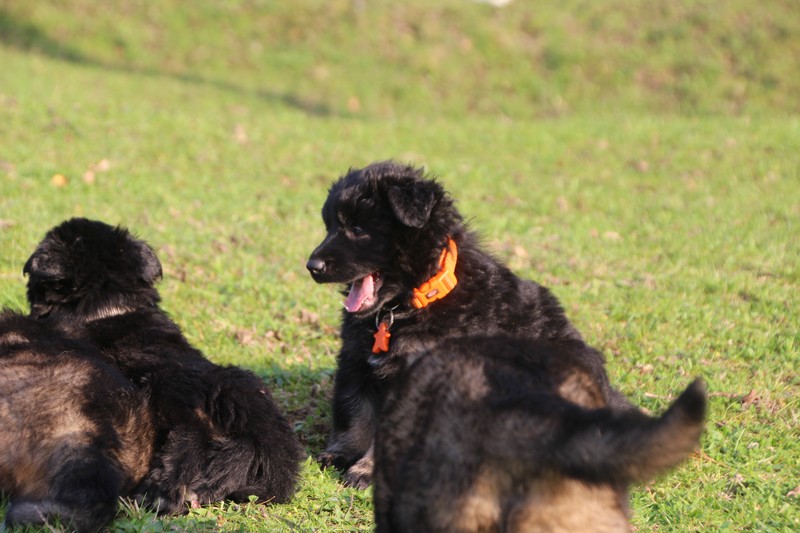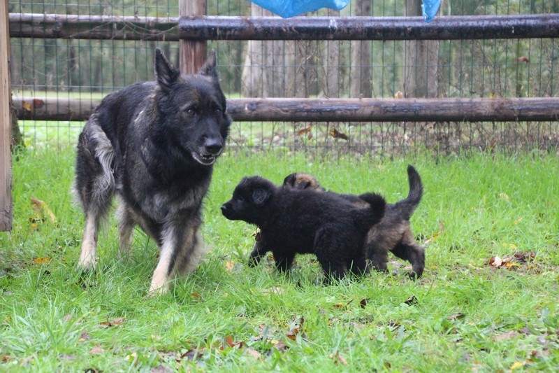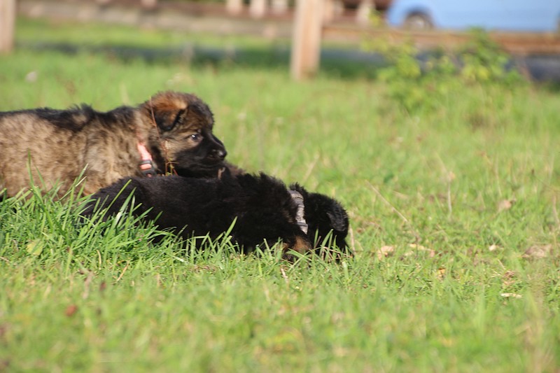 Hé coucou! c’est re nous, vous vous rendez compte ? Nous avons déjà 5 semaines et nous n’en finissons pas de découvrir la vie. Nous parlons très bien le langage canin grâce à la meute qui passe beaucoup de temps avec nous, nous arpentons le domaine par des petites promenades de-ci de-là et nous apprenons à nous repérer dans les grands espaces, bien sûr c’est toujours accompagnés de l’une de nos mamans voir les deux, mais aussi avec la meute entière. Nous savons également parfaitement faire les câlins aux humains et surtout réclamer les bras afin d’avoir nos petits moments privilégiés.