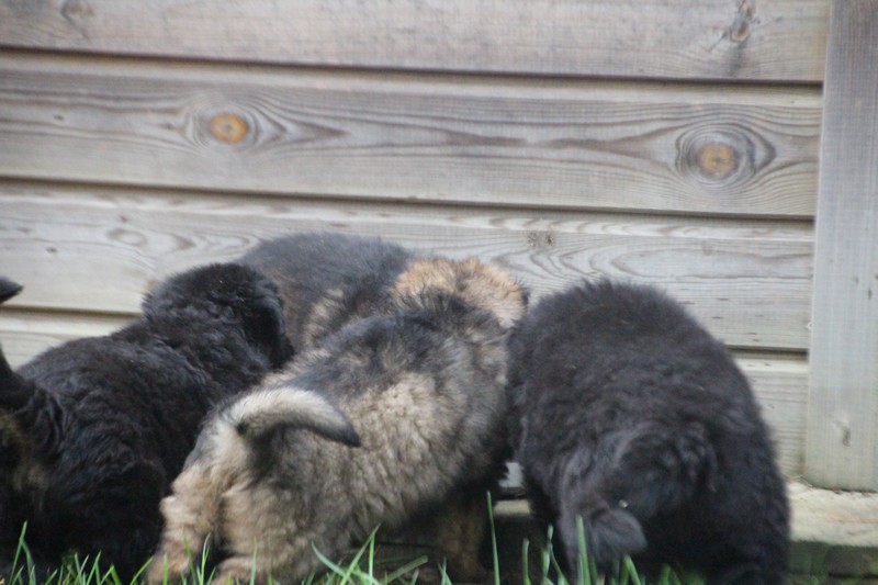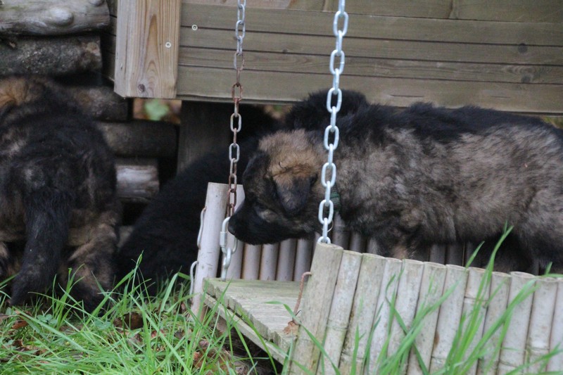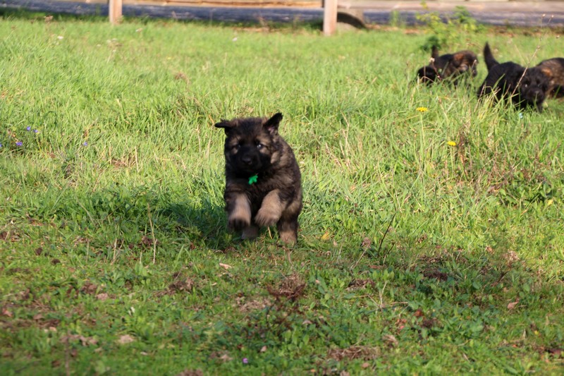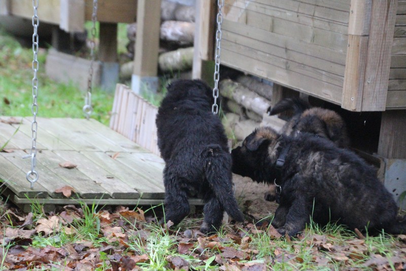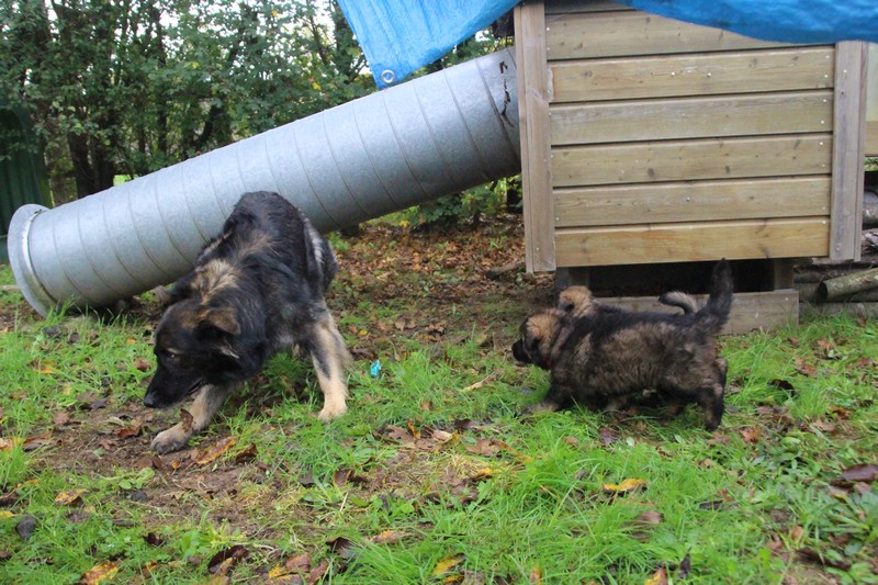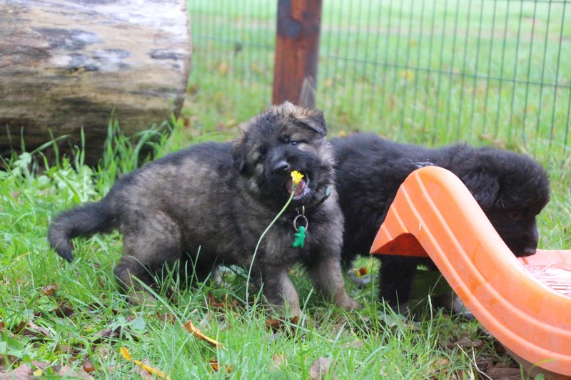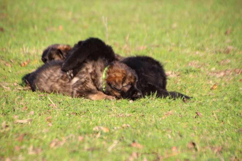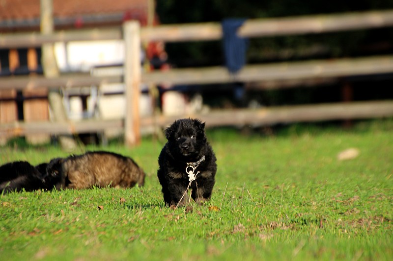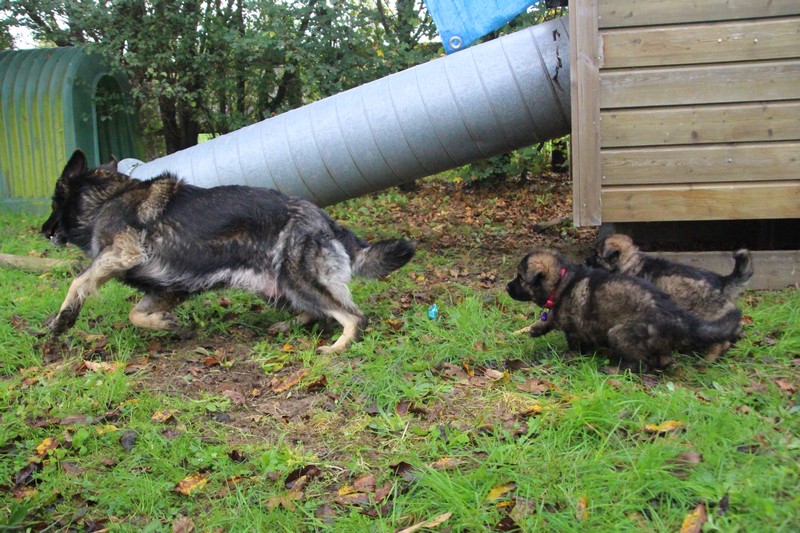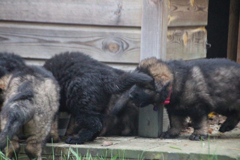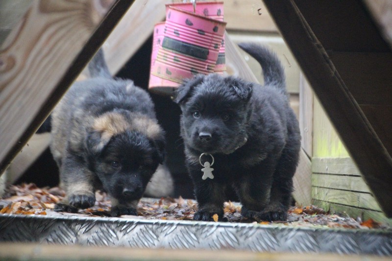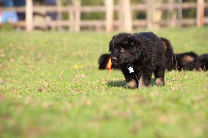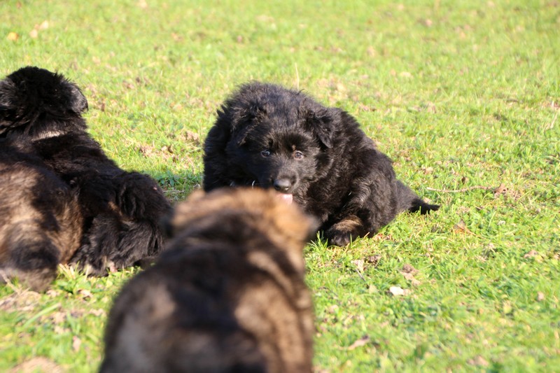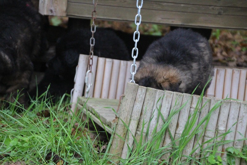 Hé coucou! c’est re nous, vous vous rendez compte ? Nous avons déjà 5 semaines et nous n’en finissons pas de découvrir la vie. Nous parlons très bien le langage canin grâce à la meute qui passe beaucoup de temps avec nous, nous arpentons le domaine par des petites promenades de-ci de-là et nous apprenons à nous repérer dans les grands espaces, bien sûr c’est toujours accompagnés de l’une de nos mamans voir les deux, mais aussi avec la meute entière. Nous savons également parfaitement faire les câlins aux humains et surtout réclamer les bras afin d’avoir nos petits moments privilégiés.