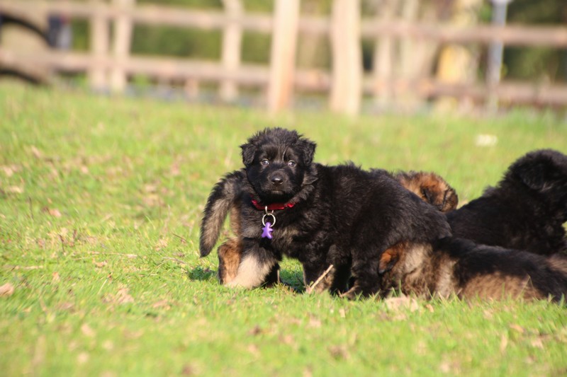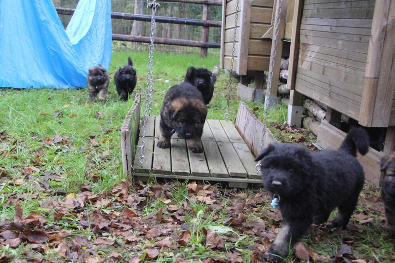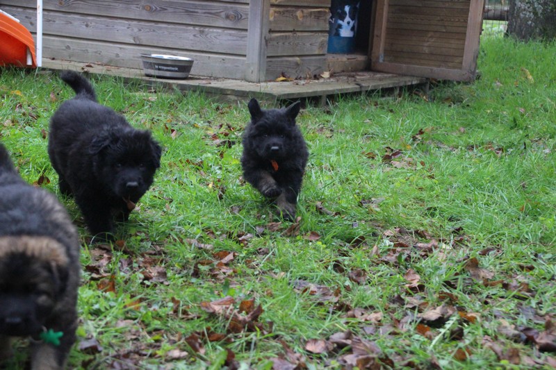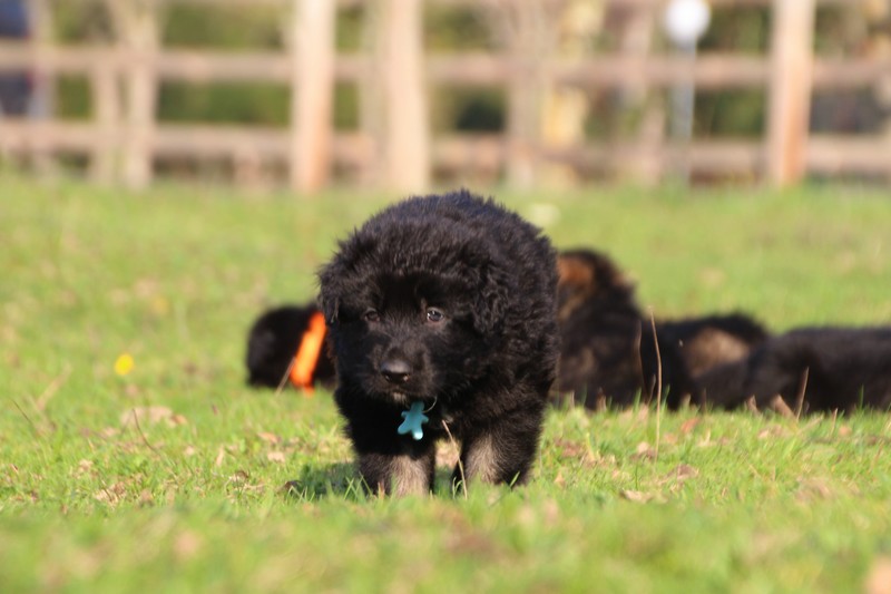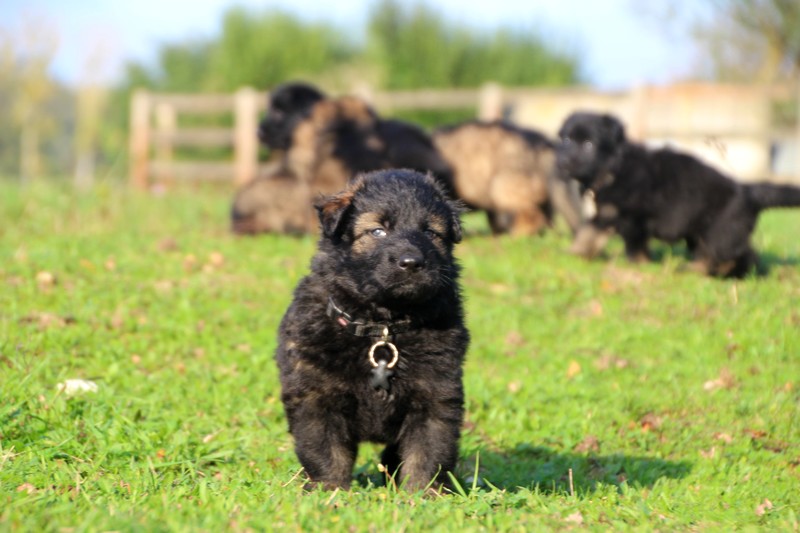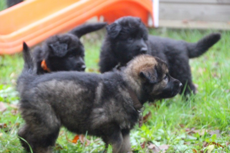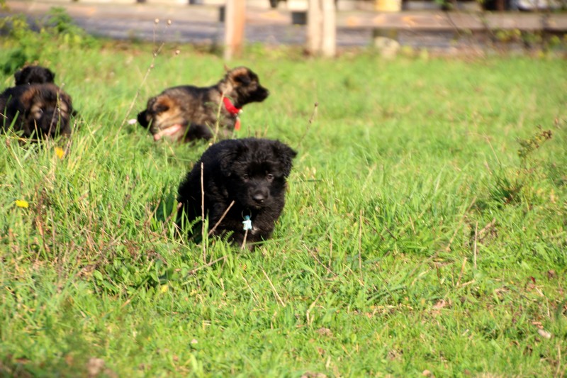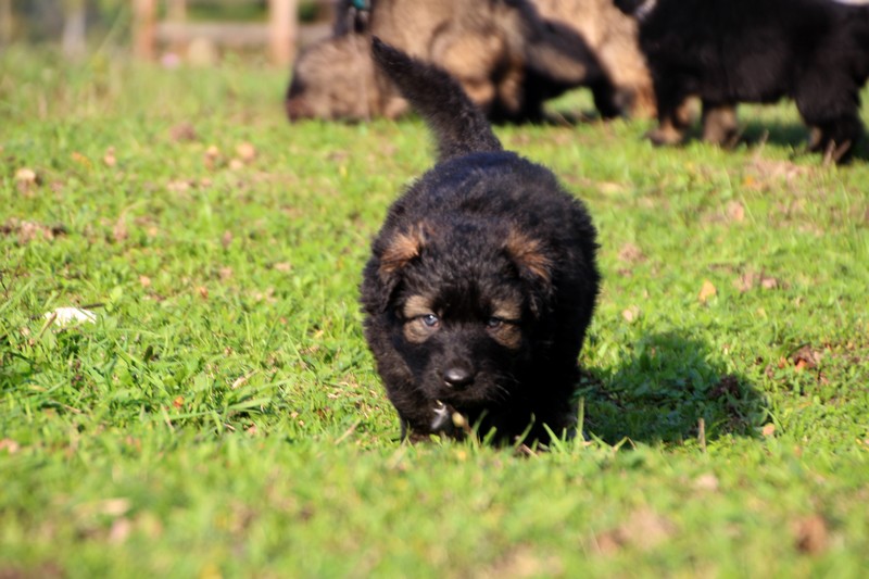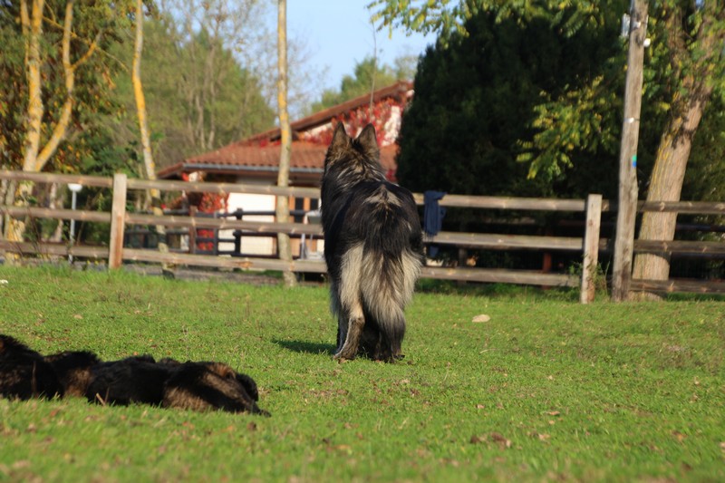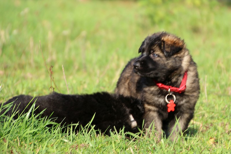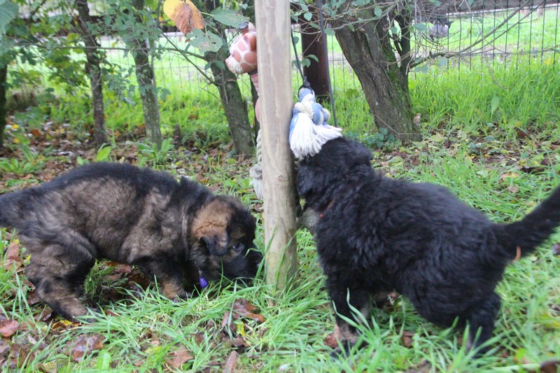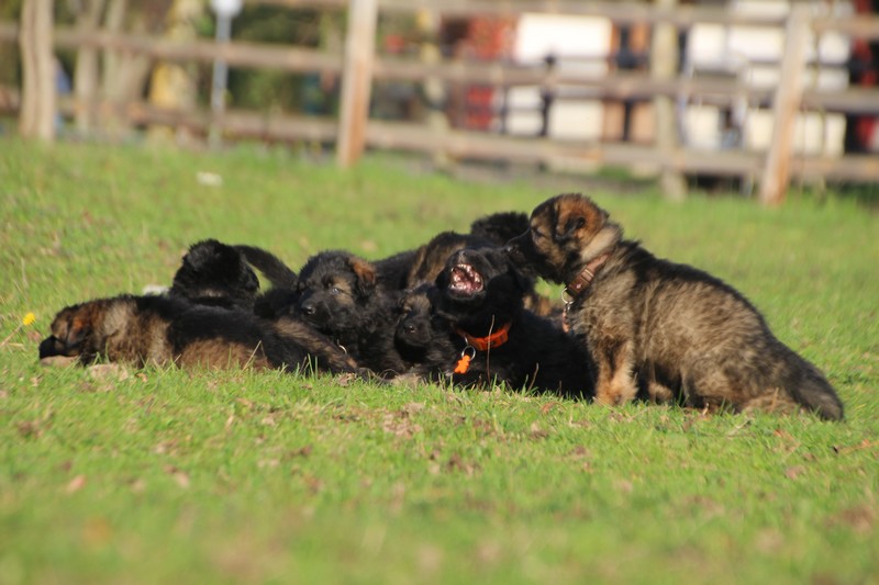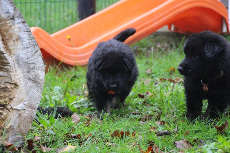 Hé coucou! c’est re nous, vous vous rendez compte ? Nous avons déjà 5 semaines et nous n’en finissons pas de découvrir la vie. Nous parlons très bien le langage canin grâce à la meute qui passe beaucoup de temps avec nous, nous arpentons le domaine par des petites promenades de-ci de-là et nous apprenons à nous repérer dans les grands espaces, bien sûr c’est toujours accompagnés de l’une de nos mamans voir les deux, mais aussi avec la meute entière. Nous savons également parfaitement faire les câlins aux humains et surtout réclamer les bras afin d’avoir nos petits moments privilégiés.
