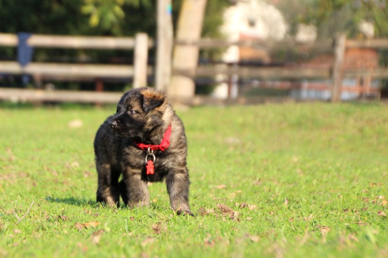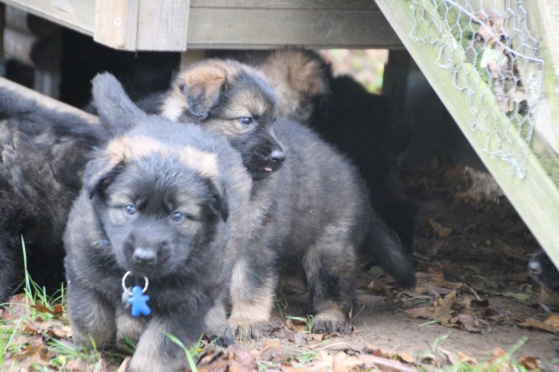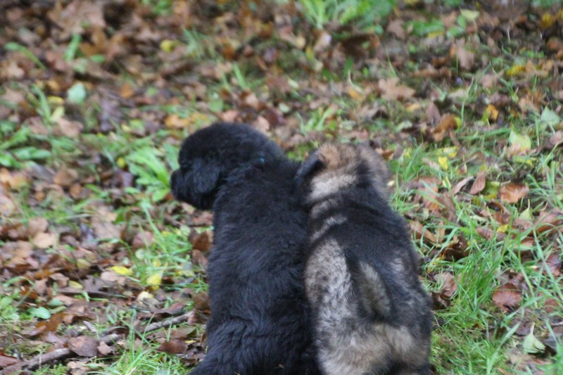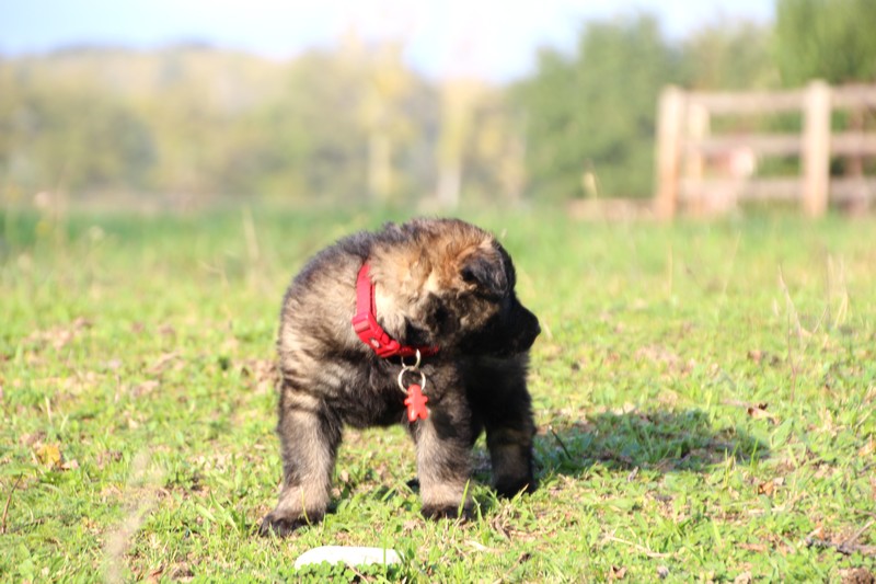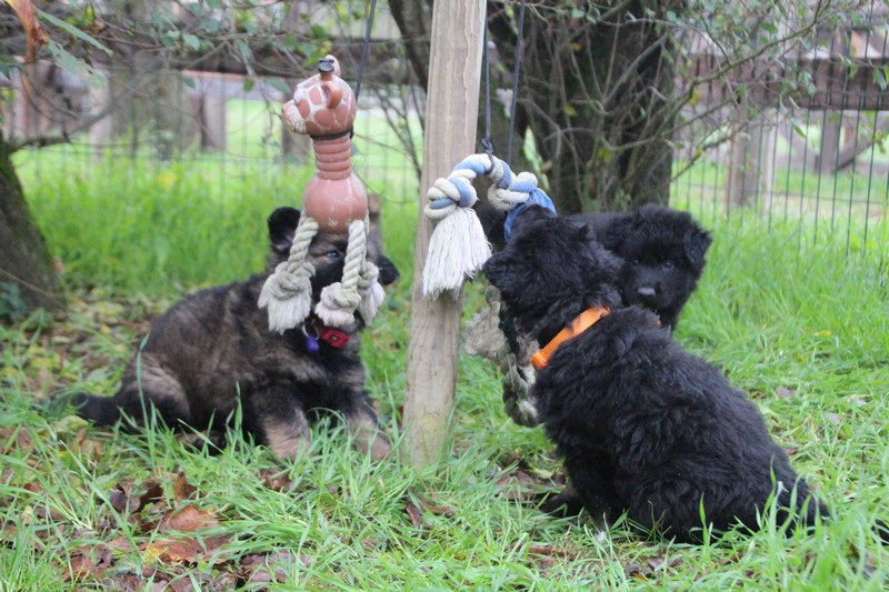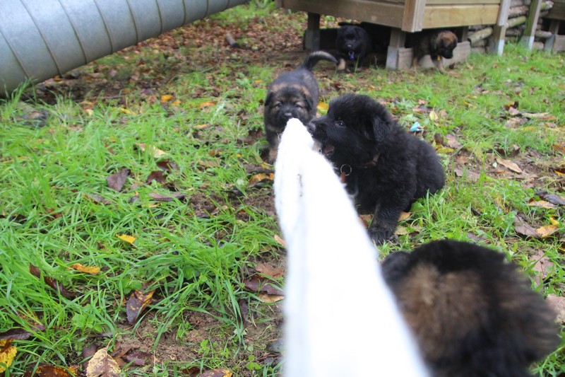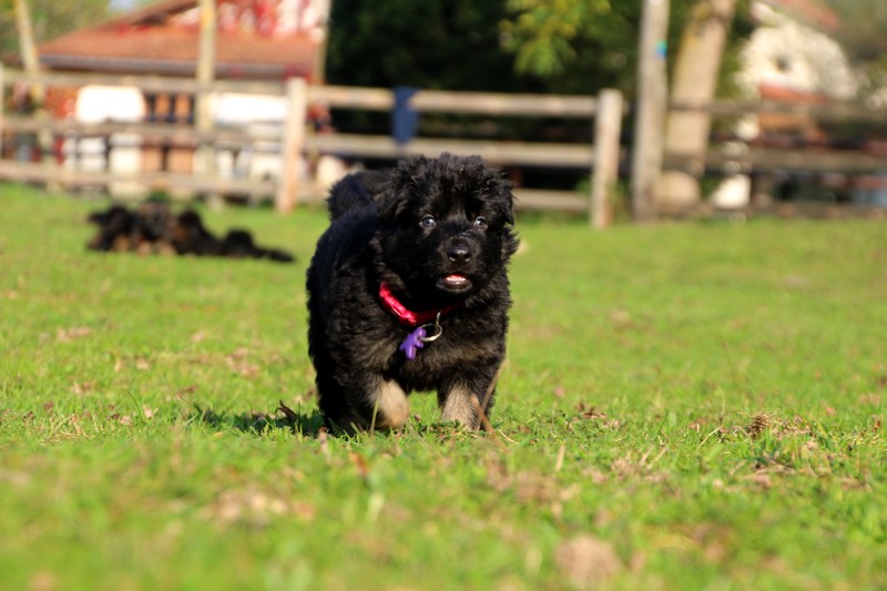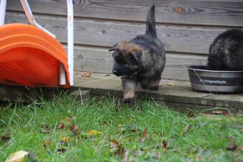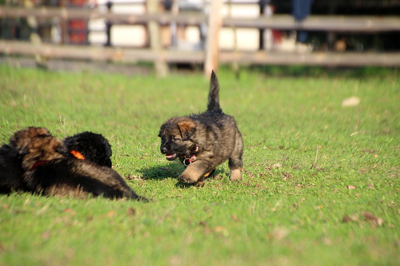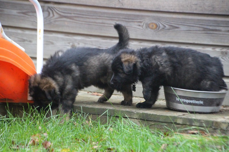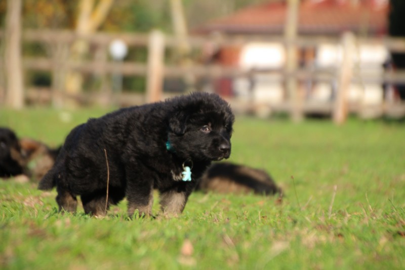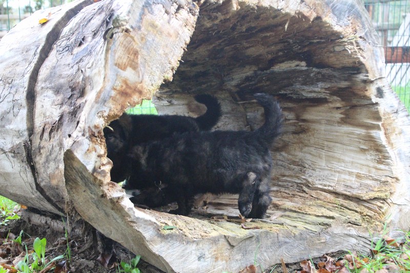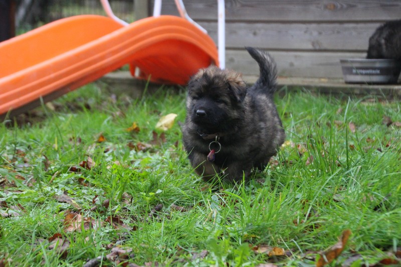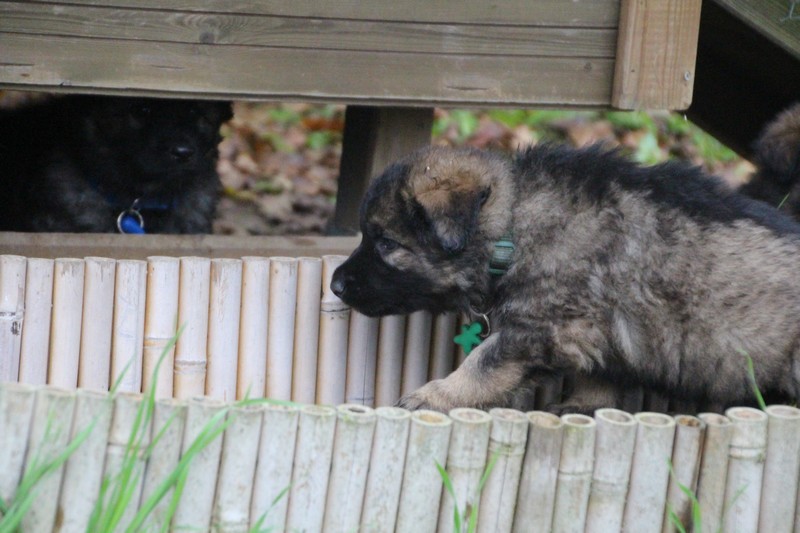 Hé coucou! c’est re nous, vous vous rendez compte ? Nous avons déjà 5 semaines et nous n’en finissons pas de découvrir la vie. Nous parlons très bien le langage canin grâce à la meute qui passe beaucoup de temps avec nous, nous arpentons le domaine par des petites promenades de-ci de-là et nous apprenons à nous repérer dans les grands espaces, bien sûr c’est toujours accompagnés de l’une de nos mamans voir les deux, mais aussi avec la meute entière. Nous savons également parfaitement faire les câlins aux humains et surtout réclamer les bras afin d’avoir nos petits moments privilégiés.