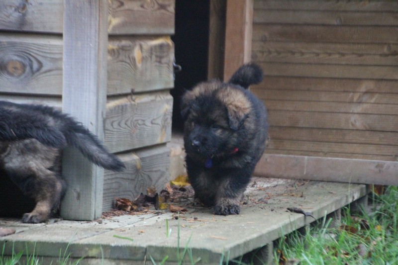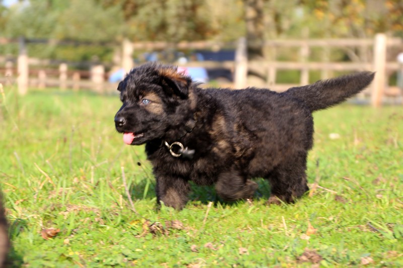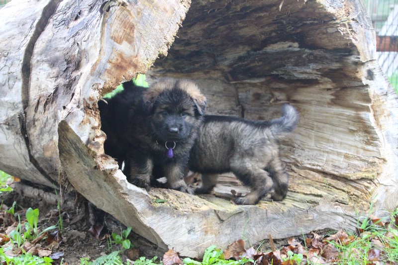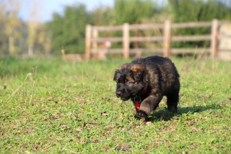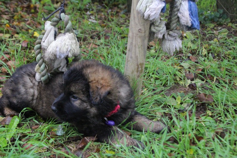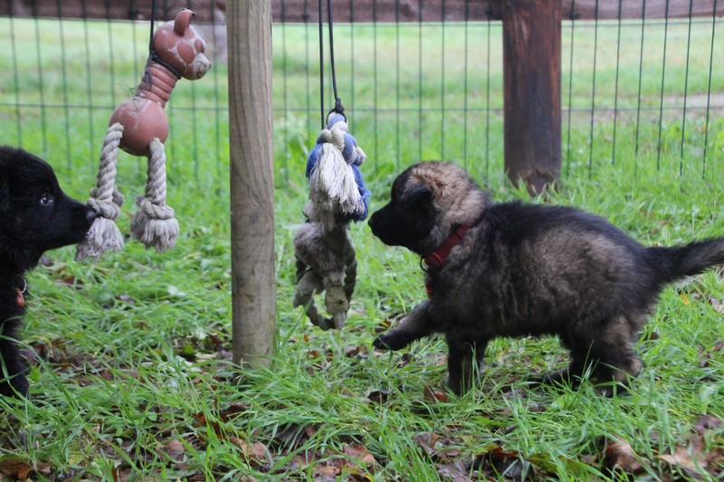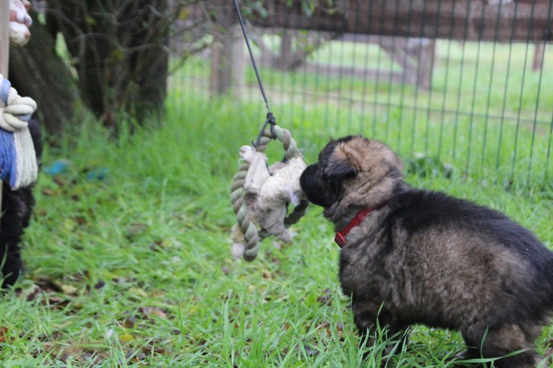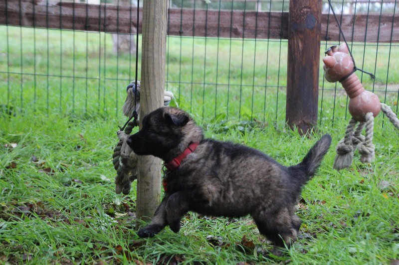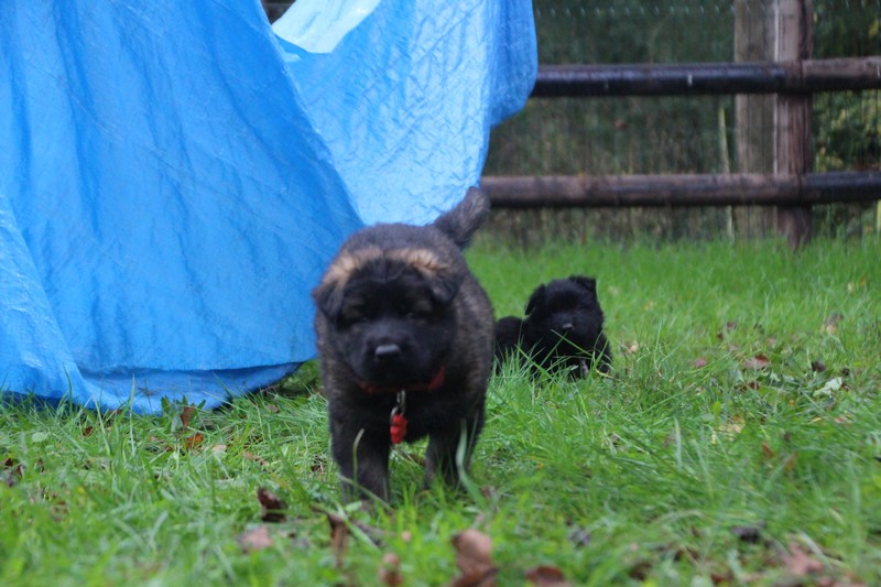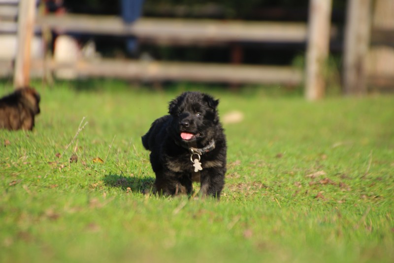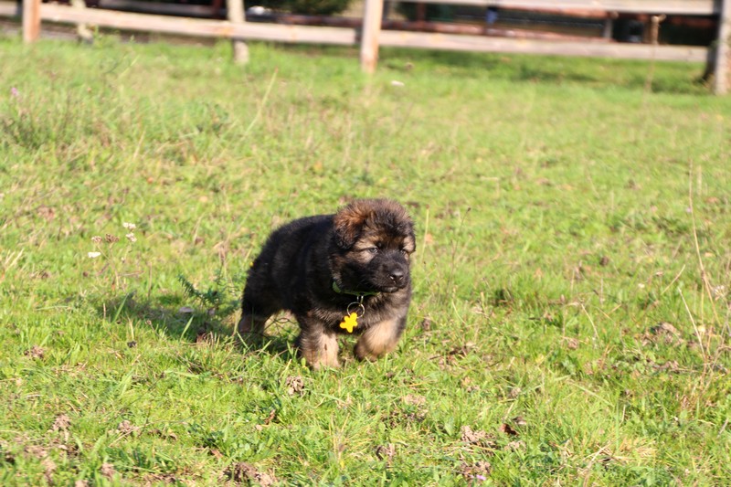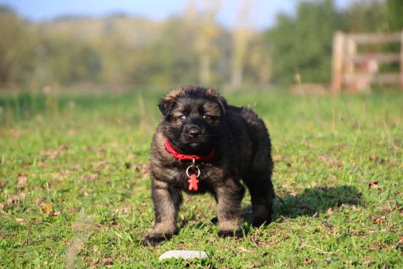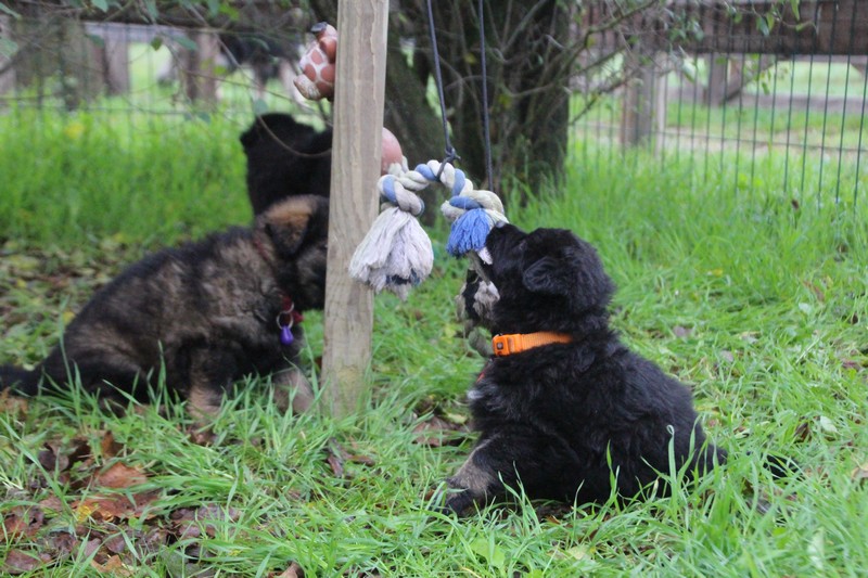 Hé coucou! c’est re nous, vous vous rendez compte ? Nous avons déjà 5 semaines et nous n’en finissons pas de découvrir la vie. Nous parlons très bien le langage canin grâce à la meute qui passe beaucoup de temps avec nous, nous arpentons le domaine par des petites promenades de-ci de-là et nous apprenons à nous repérer dans les grands espaces, bien sûr c’est toujours accompagnés de l’une de nos mamans voir les deux, mais aussi avec la meute entière. Nous savons également parfaitement faire les câlins aux humains et surtout réclamer les bras afin d’avoir nos petits moments privilégiés.