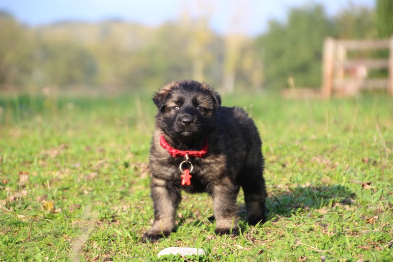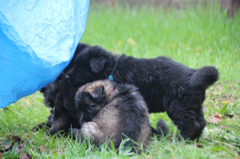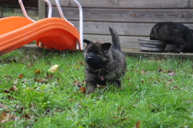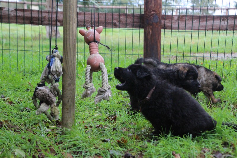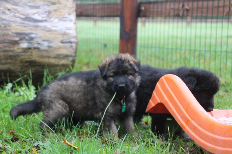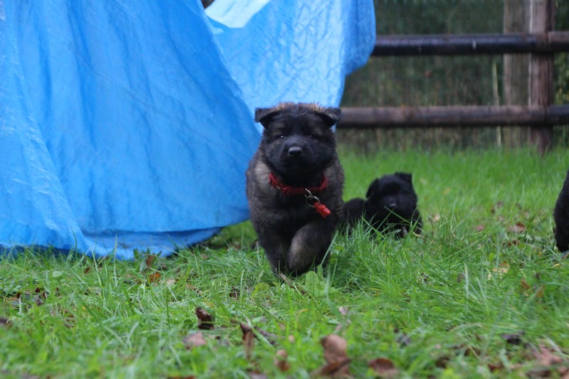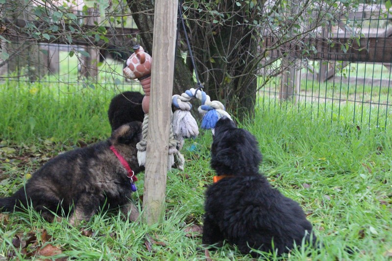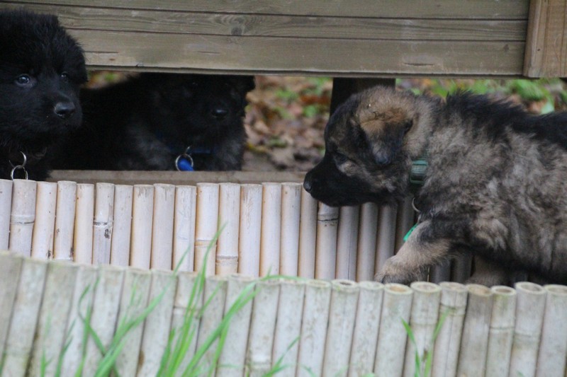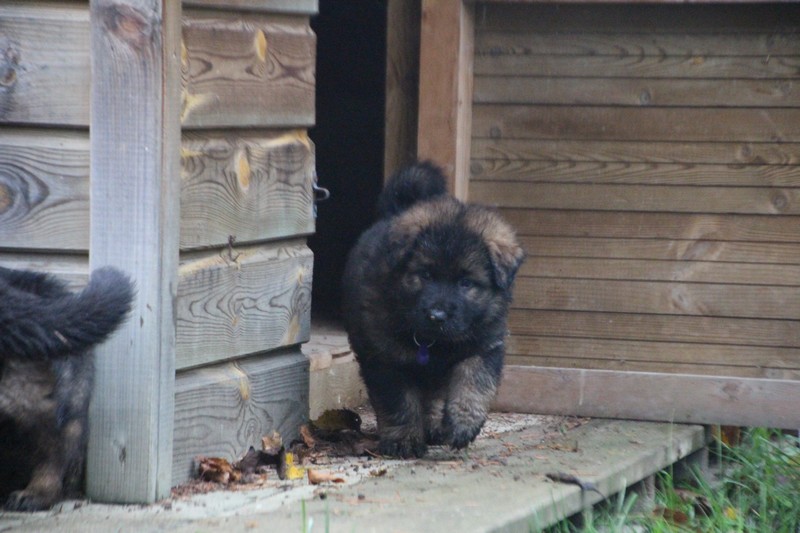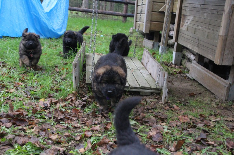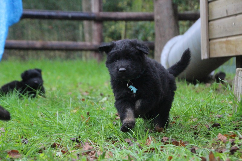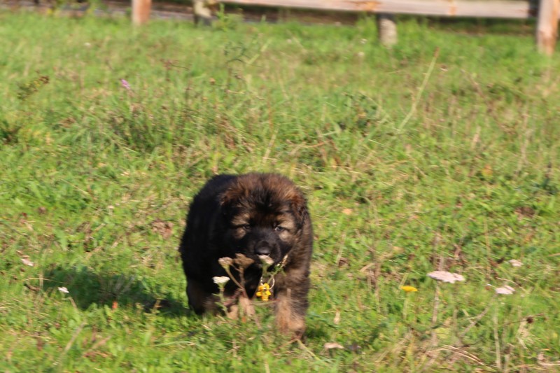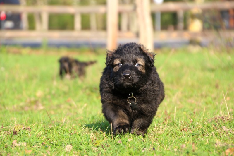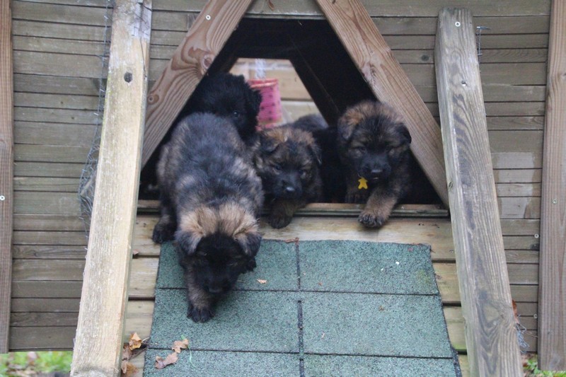 Hé coucou! c’est re nous, vous vous rendez compte ? Nous avons déjà 5 semaines et nous n’en finissons pas de découvrir la vie. Nous parlons très bien le langage canin grâce à la meute qui passe beaucoup de temps avec nous, nous arpentons le domaine par des petites promenades de-ci de-là et nous apprenons à nous repérer dans les grands espaces, bien sûr c’est toujours accompagnés de l’une de nos mamans voir les deux, mais aussi avec la meute entière. Nous savons également parfaitement faire les câlins aux humains et surtout réclamer les bras afin d’avoir nos petits moments privilégiés.