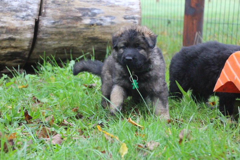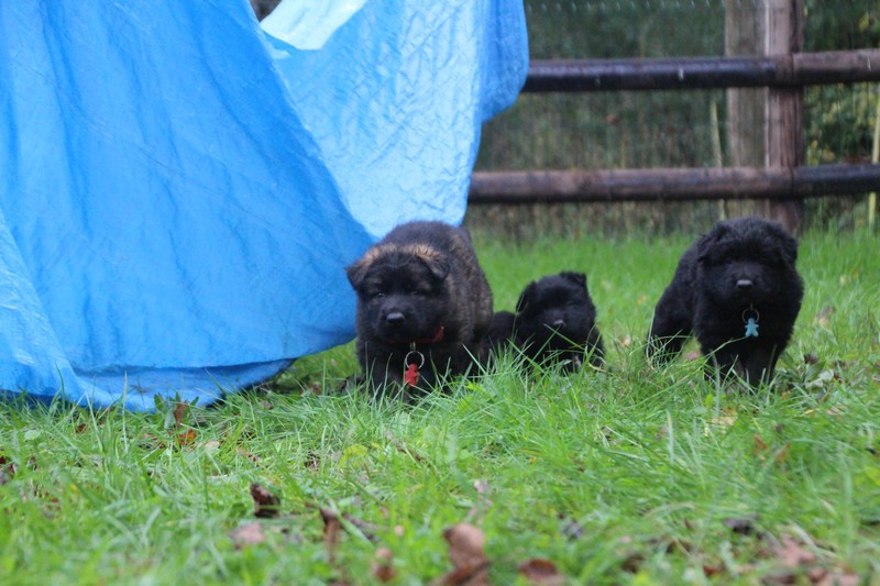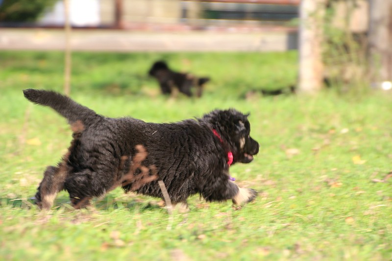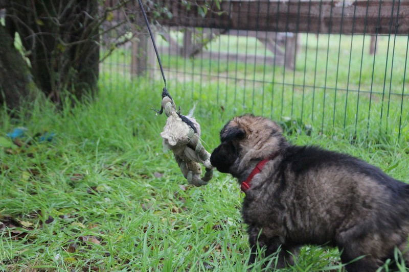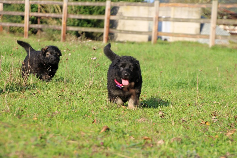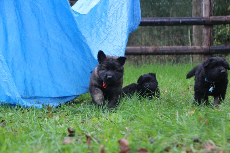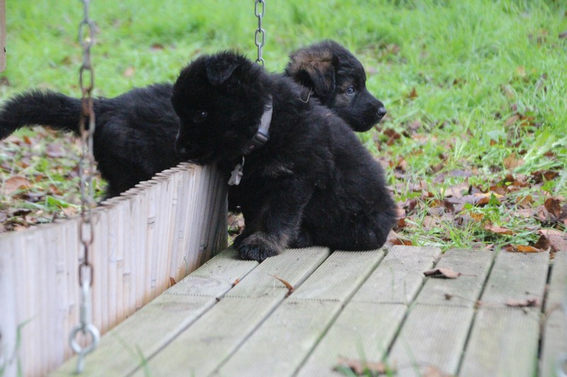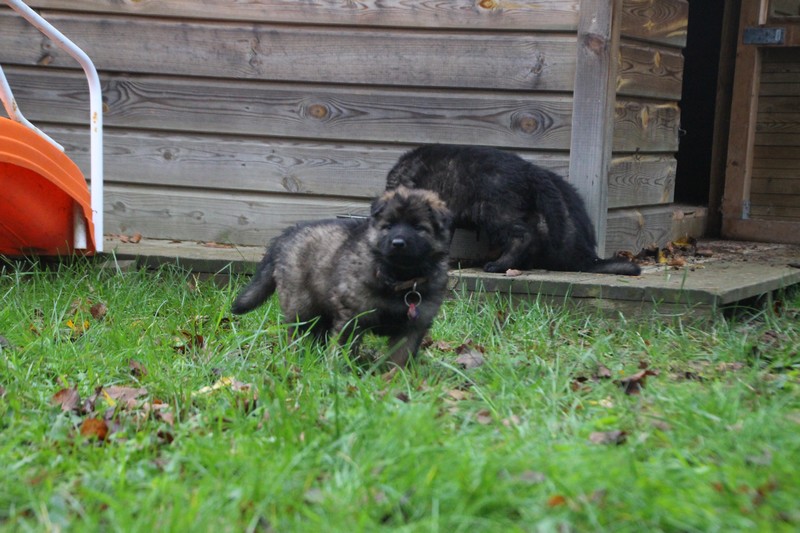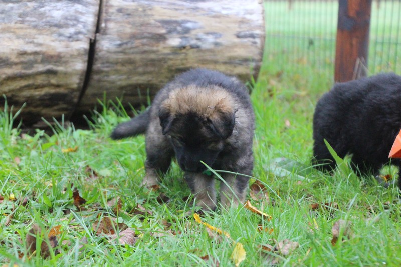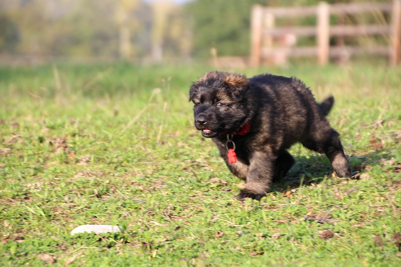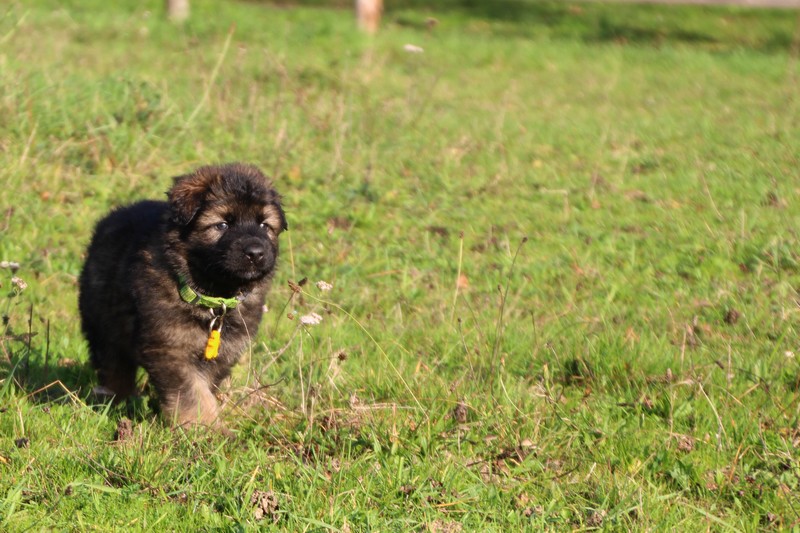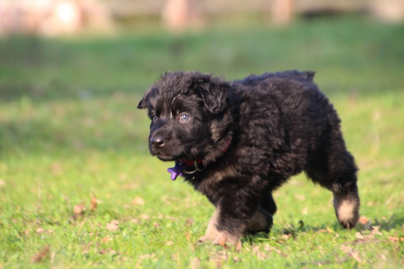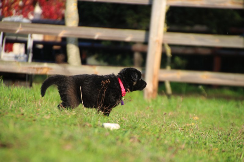 Hé coucou! c’est re nous, vous vous rendez compte ? Nous avons déjà 5 semaines et nous n’en finissons pas de découvrir la vie. Nous parlons très bien le langage canin grâce à la meute qui passe beaucoup de temps avec nous, nous arpentons le domaine par des petites promenades de-ci de-là et nous apprenons à nous repérer dans les grands espaces, bien sûr c’est toujours accompagnés de l’une de nos mamans voir les deux, mais aussi avec la meute entière. Nous savons également parfaitement faire les câlins aux humains et surtout réclamer les bras afin d’avoir nos petits moments privilégiés.