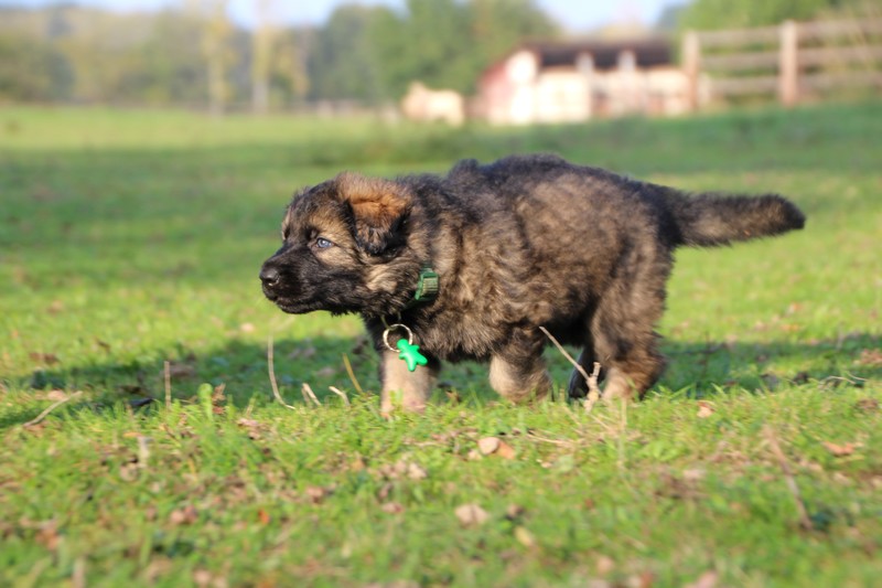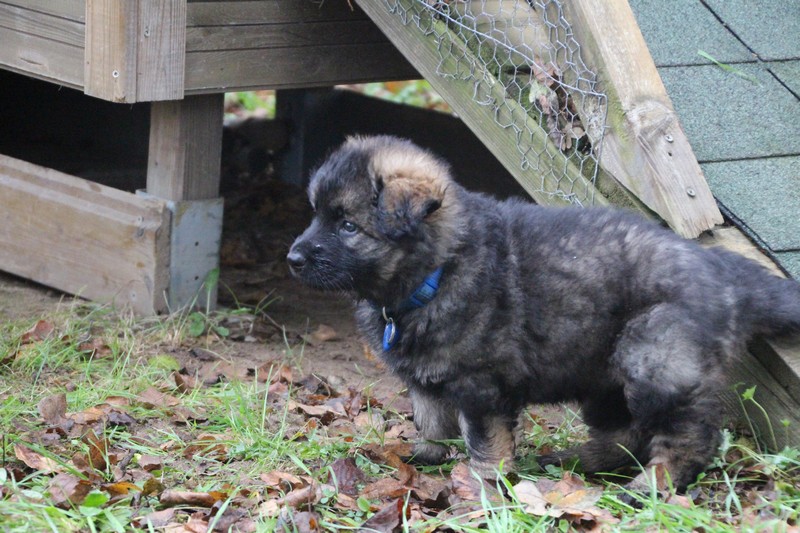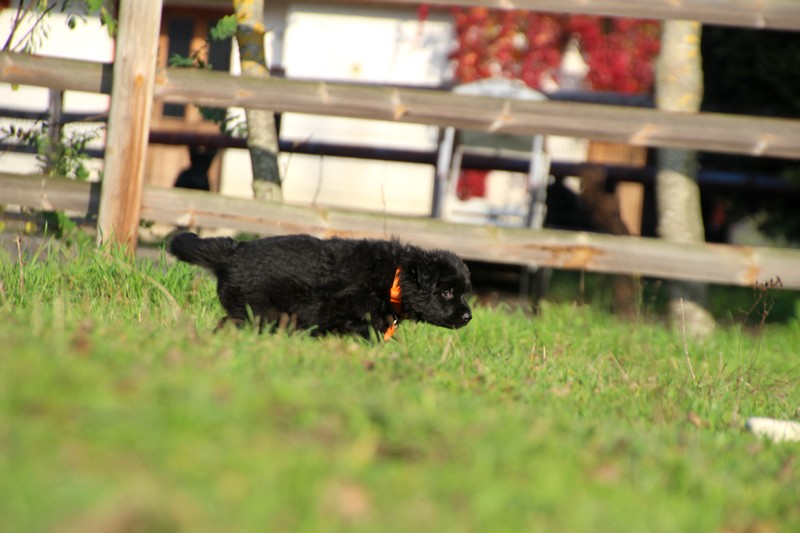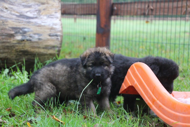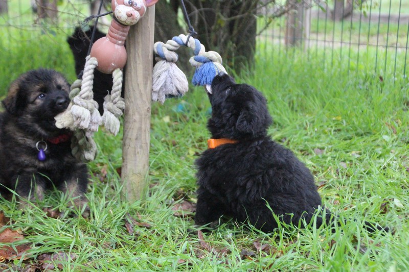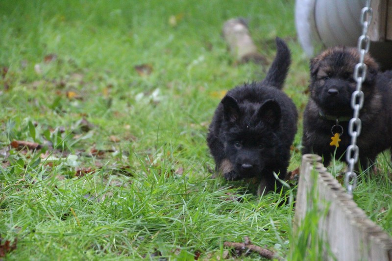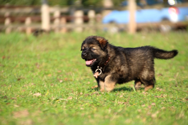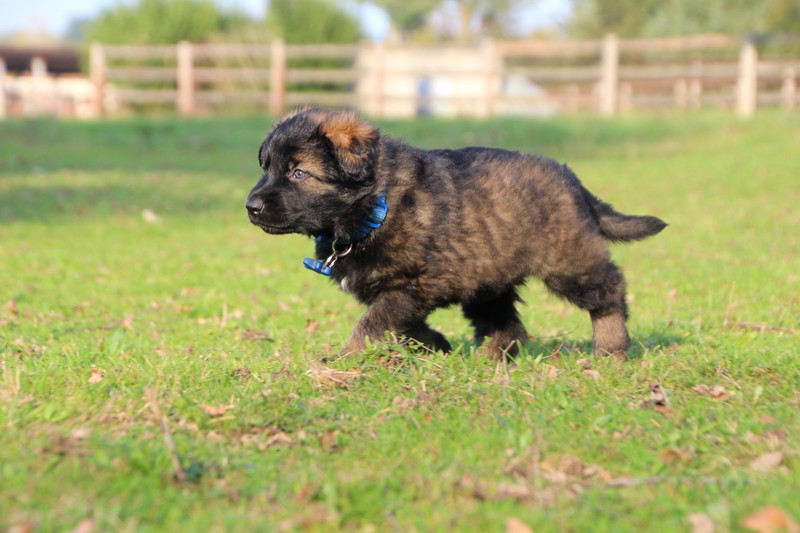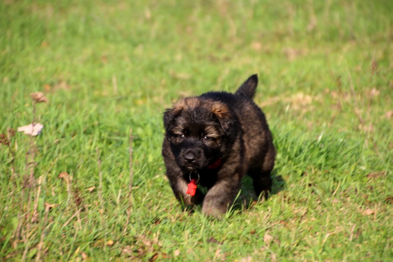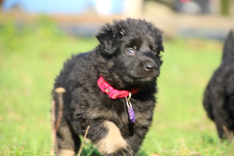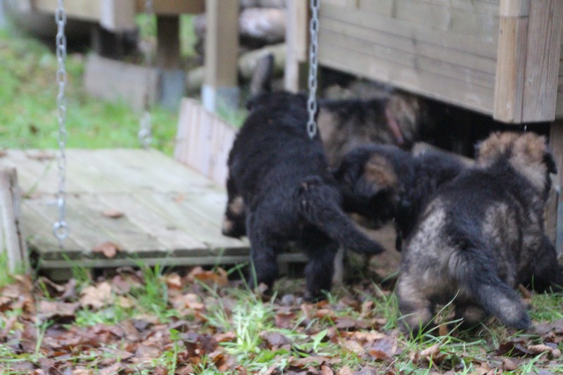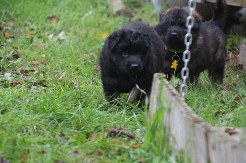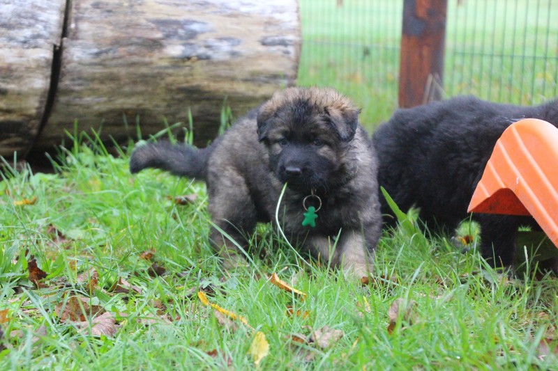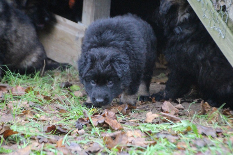 Hé coucou! c’est re nous, vous vous rendez compte ? Nous avons déjà 5 semaines et nous n’en finissons pas de découvrir la vie. Nous parlons très bien le langage canin grâce à la meute qui passe beaucoup de temps avec nous, nous arpentons le domaine par des petites promenades de-ci de-là et nous apprenons à nous repérer dans les grands espaces, bien sûr c’est toujours accompagnés de l’une de nos mamans voir les deux, mais aussi avec la meute entière. Nous savons également parfaitement faire les câlins aux humains et surtout réclamer les bras afin d’avoir nos petits moments privilégiés.
