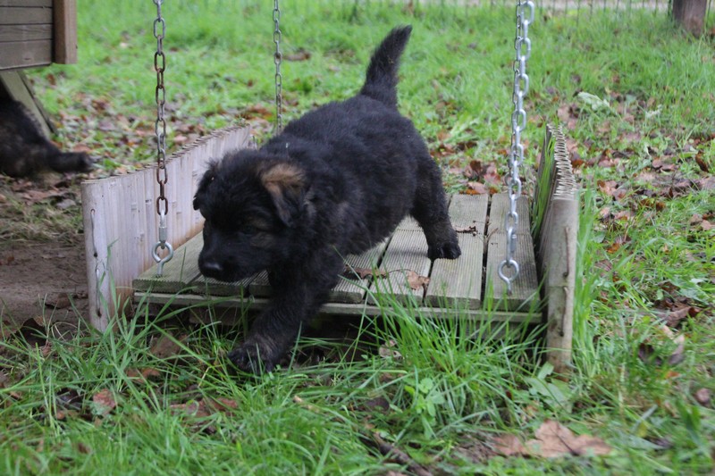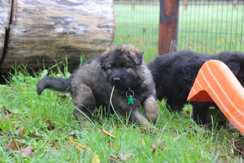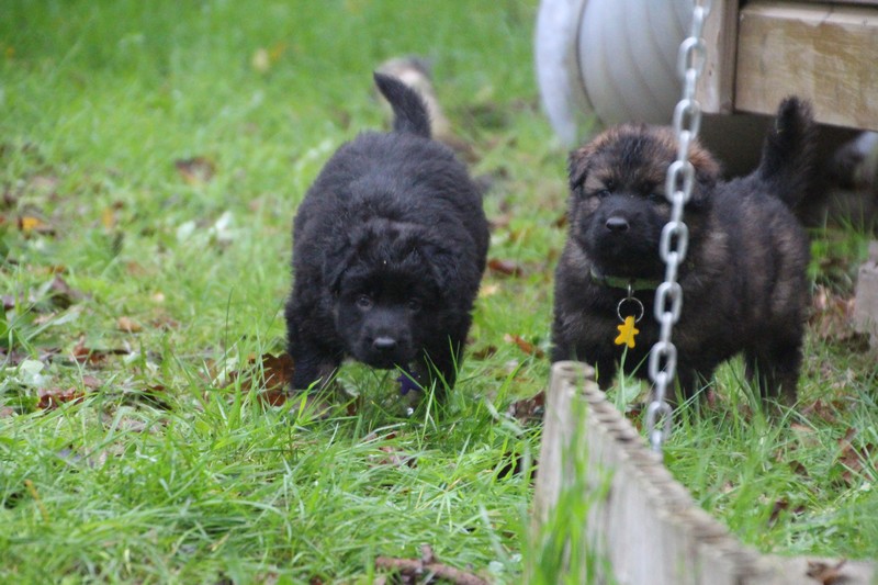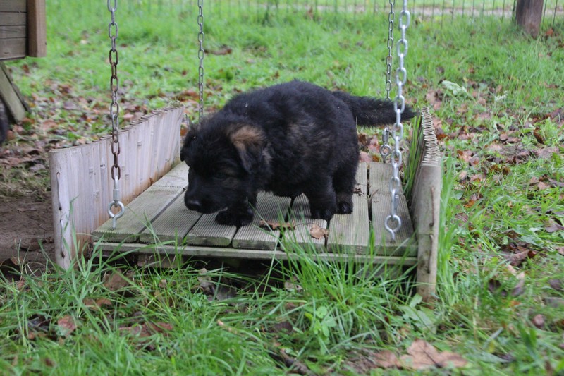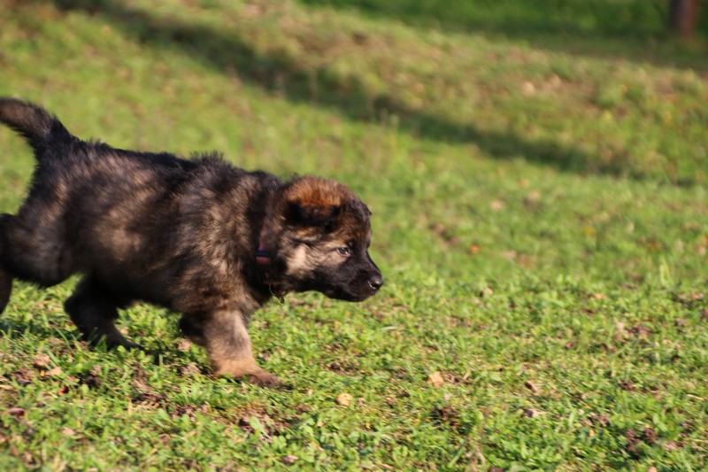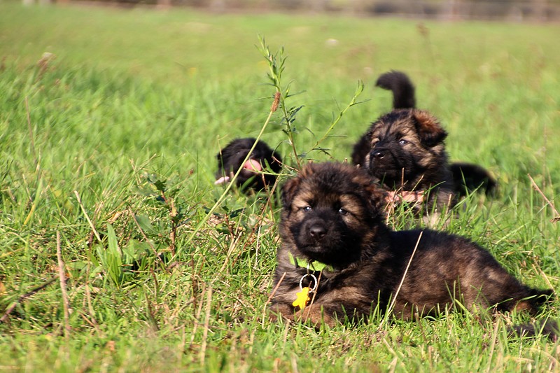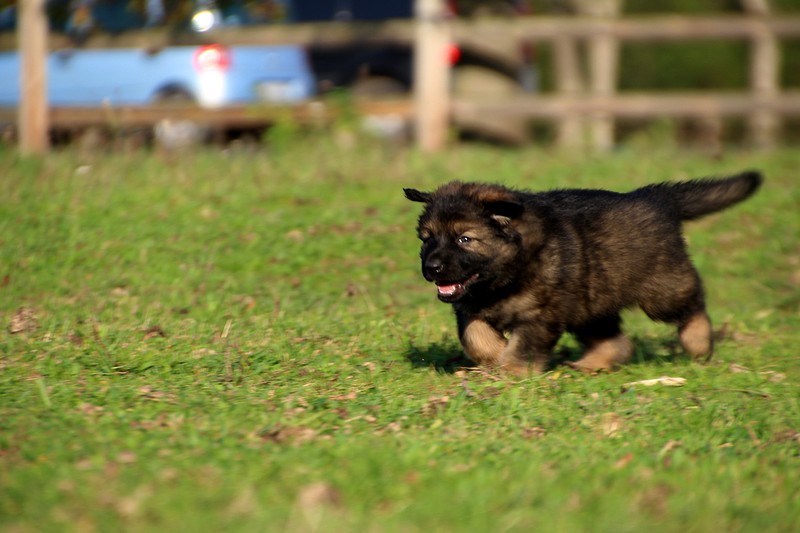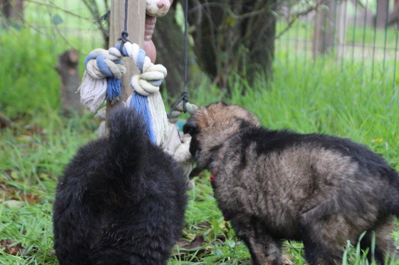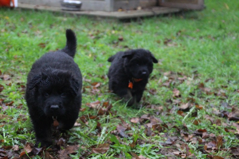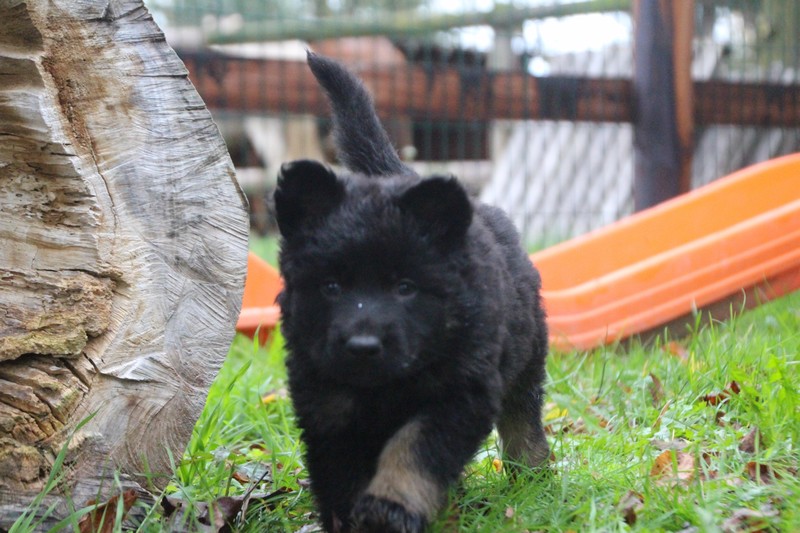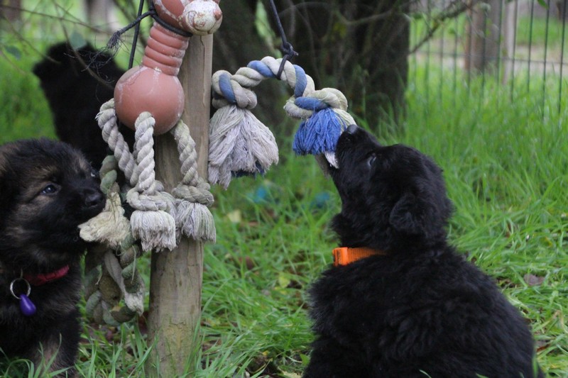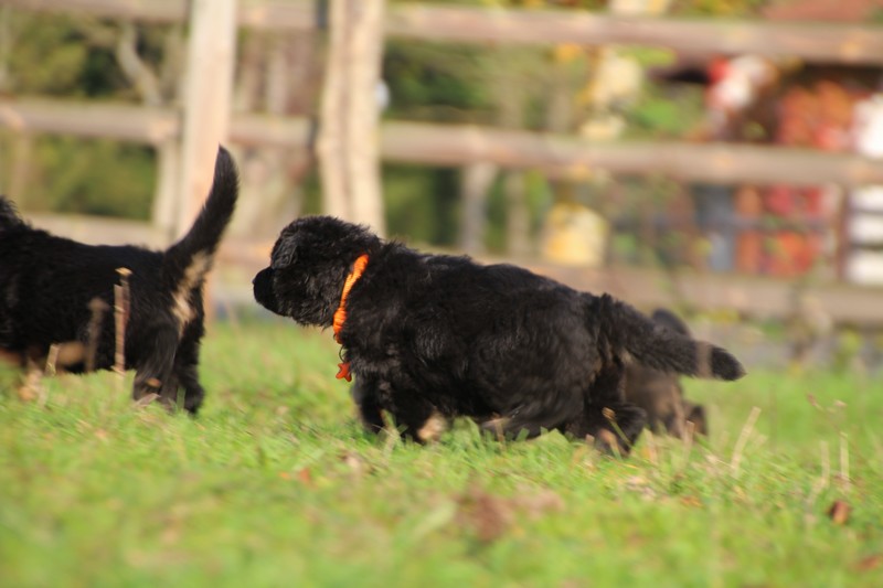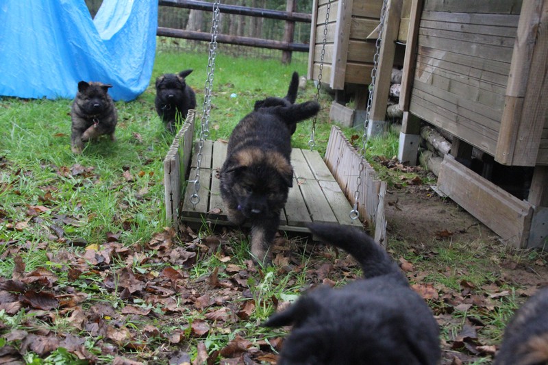 Hé coucou! c’est re nous, vous vous rendez compte ? Nous avons déjà 5 semaines et nous n’en finissons pas de découvrir la vie. Nous parlons très bien le langage canin grâce à la meute qui passe beaucoup de temps avec nous, nous arpentons le domaine par des petites promenades de-ci de-là et nous apprenons à nous repérer dans les grands espaces, bien sûr c’est toujours accompagnés de l’une de nos mamans voir les deux, mais aussi avec la meute entière. Nous savons également parfaitement faire les câlins aux humains et surtout réclamer les bras afin d’avoir nos petits moments privilégiés.