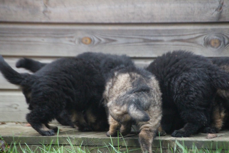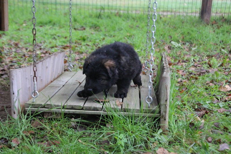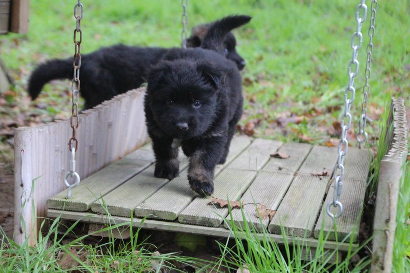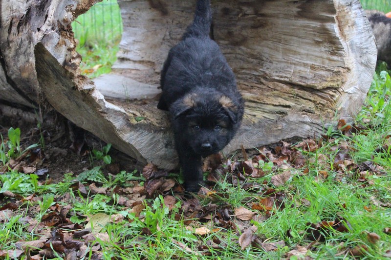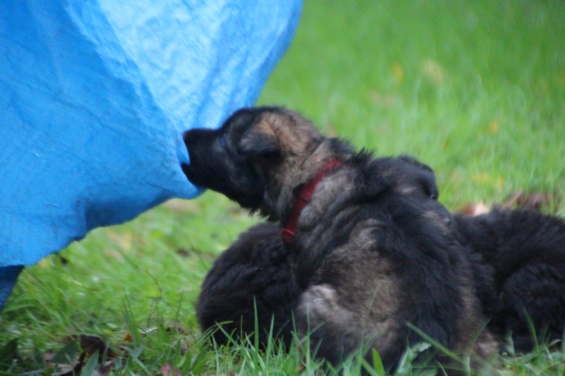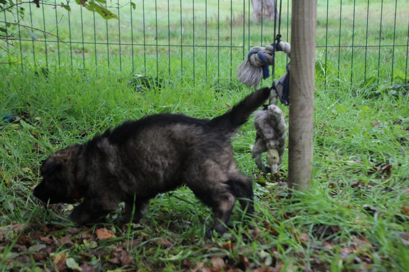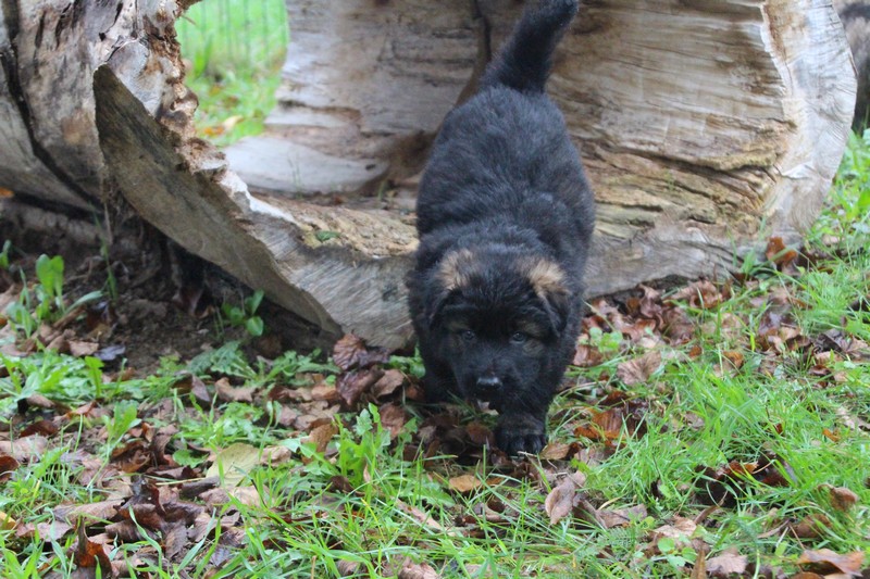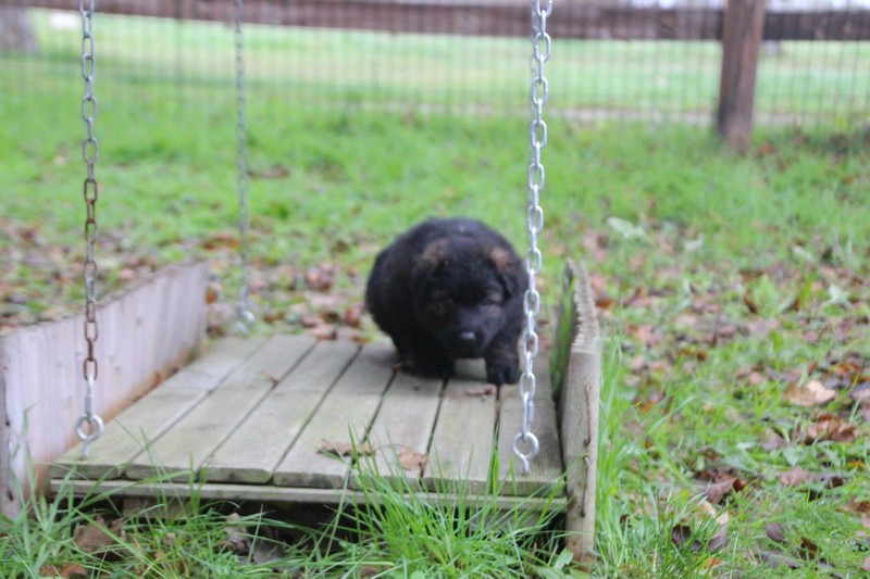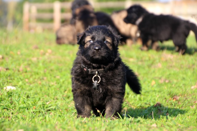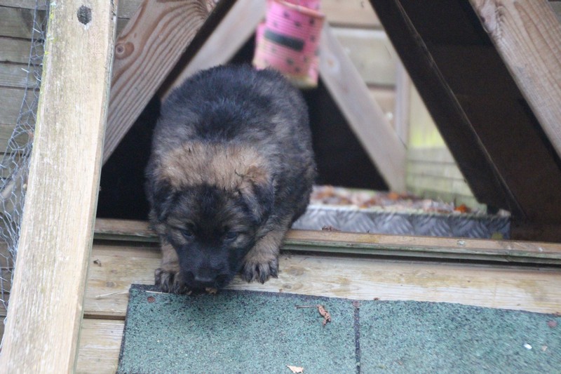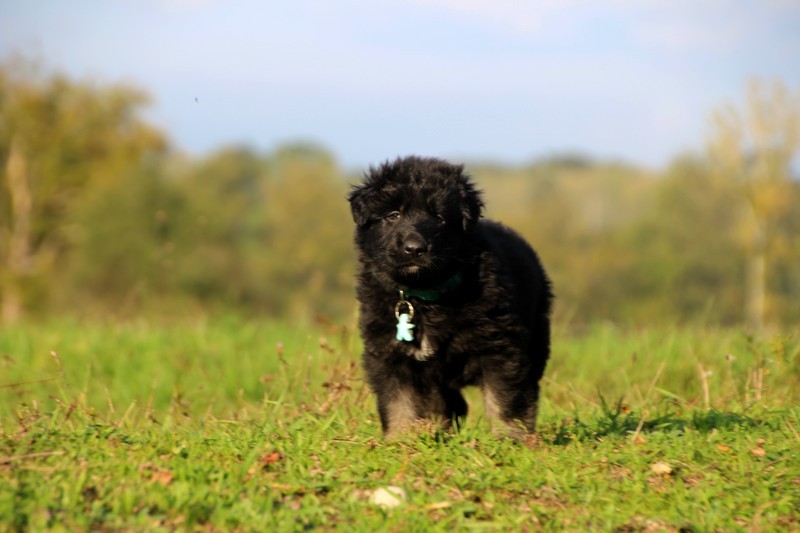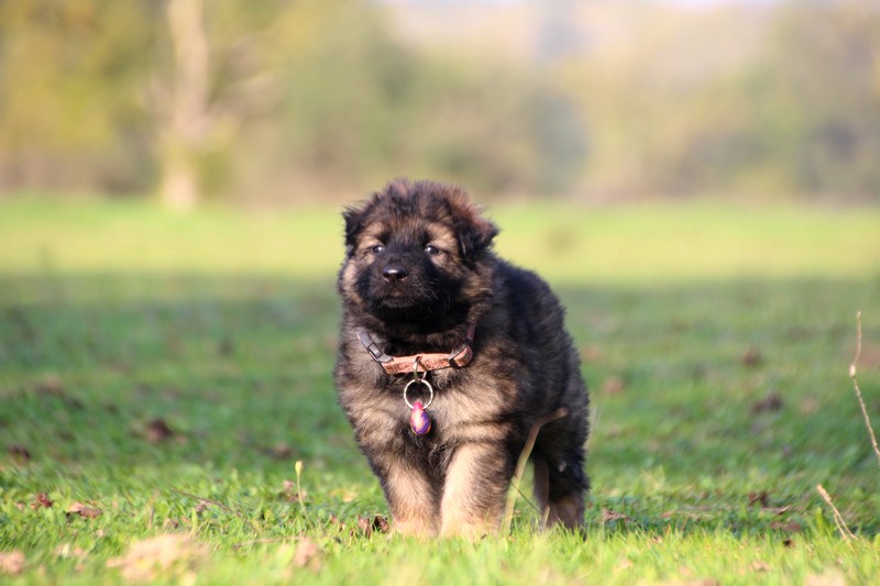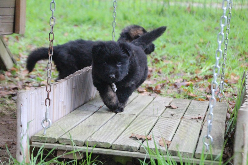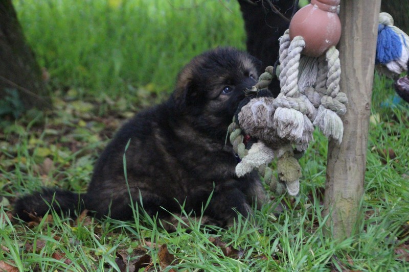 Hé coucou! c’est re nous, vous vous rendez compte ? Nous avons déjà 5 semaines et nous n’en finissons pas de découvrir la vie. Nous parlons très bien le langage canin grâce à la meute qui passe beaucoup de temps avec nous, nous arpentons le domaine par des petites promenades de-ci de-là et nous apprenons à nous repérer dans les grands espaces, bien sûr c’est toujours accompagnés de l’une de nos mamans voir les deux, mais aussi avec la meute entière. Nous savons également parfaitement faire les câlins aux humains et surtout réclamer les bras afin d’avoir nos petits moments privilégiés.