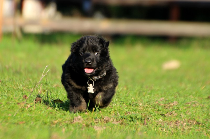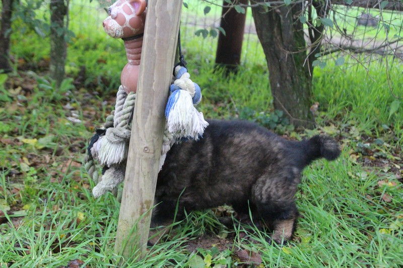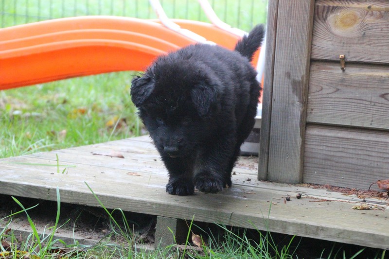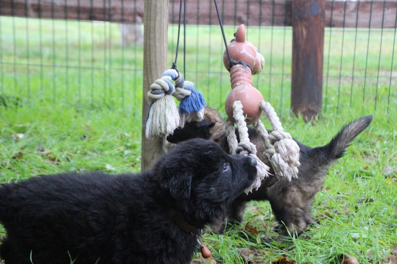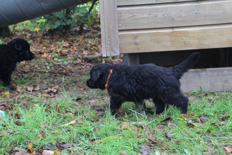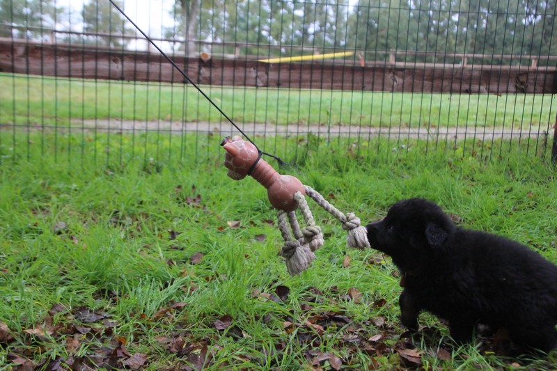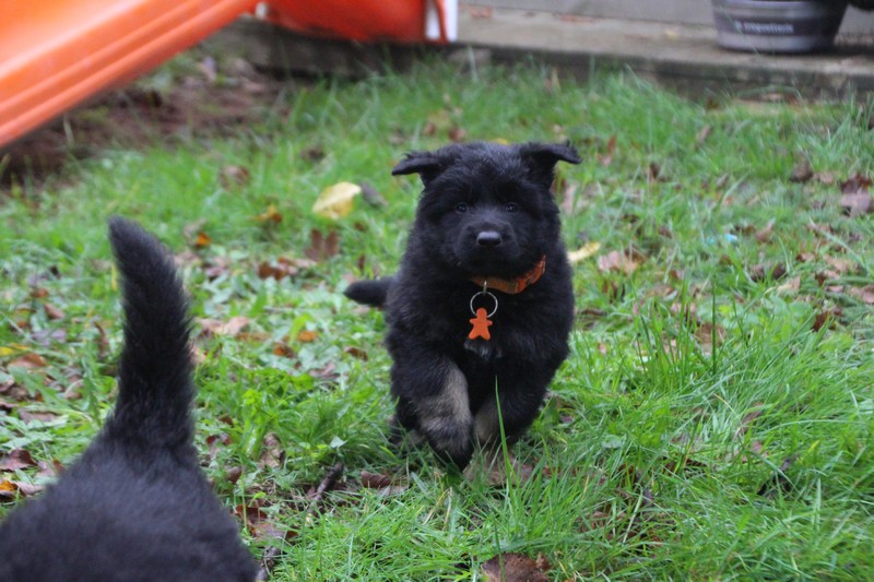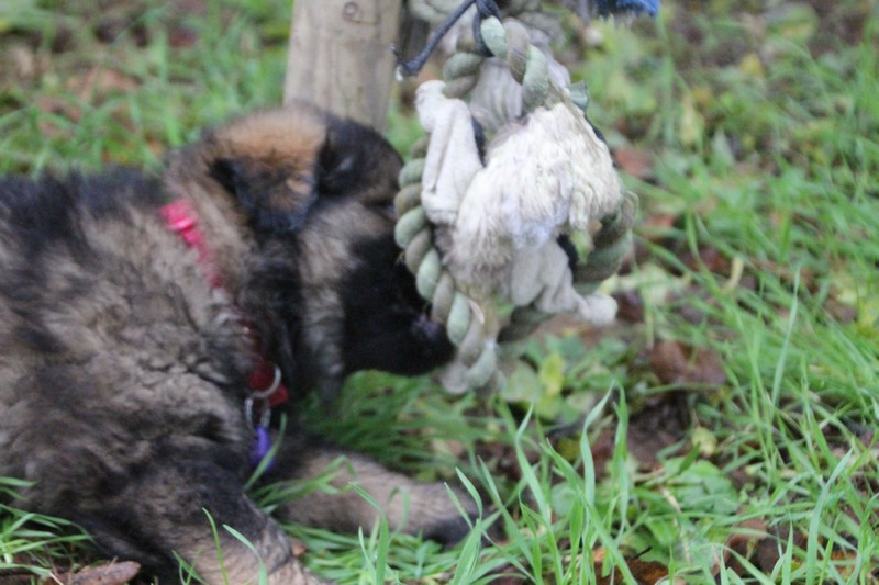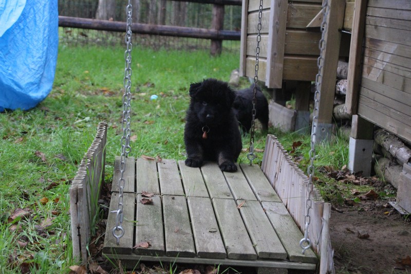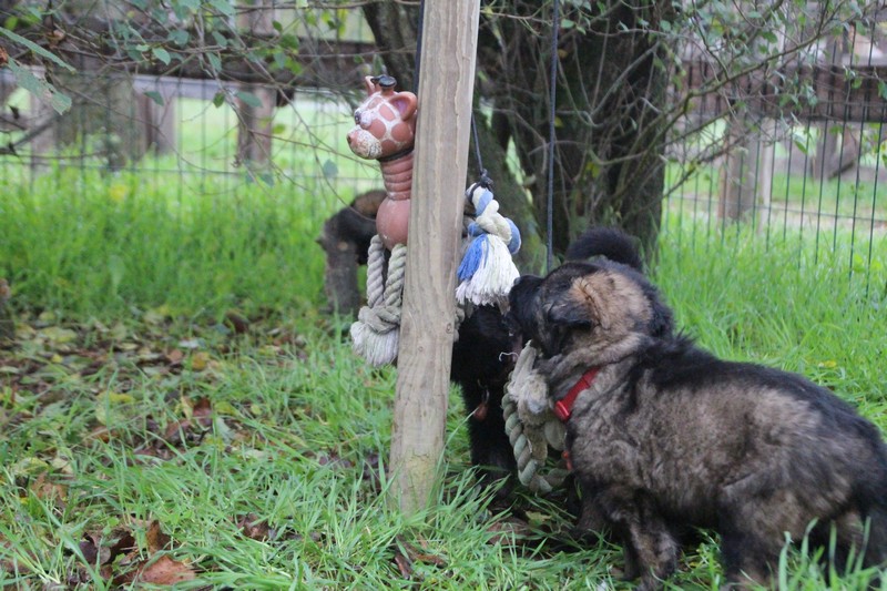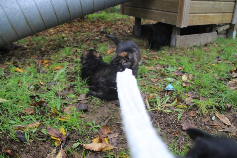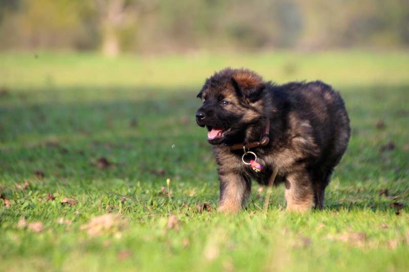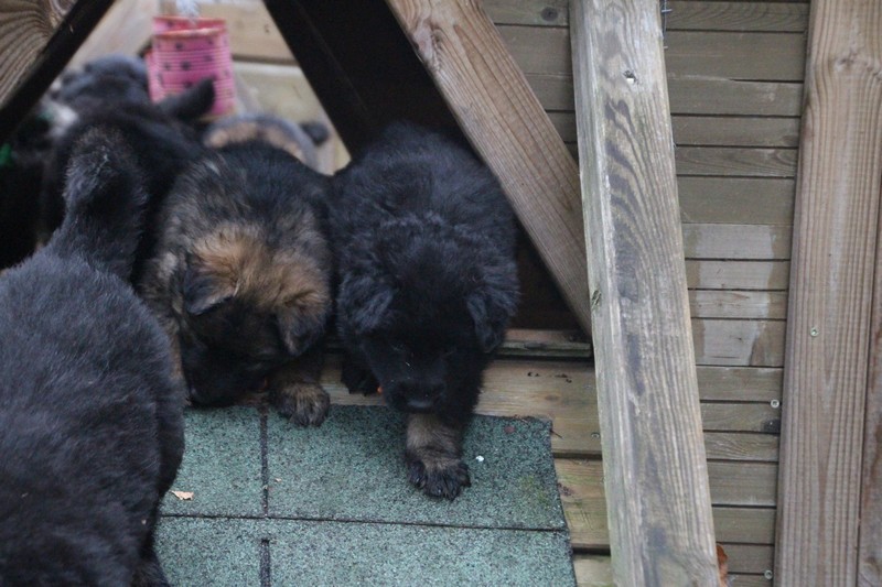 Hé coucou! c’est re nous, vous vous rendez compte ? Nous avons déjà 5 semaines et nous n’en finissons pas de découvrir la vie. Nous parlons très bien le langage canin grâce à la meute qui passe beaucoup de temps avec nous, nous arpentons le domaine par des petites promenades de-ci de-là et nous apprenons à nous repérer dans les grands espaces, bien sûr c’est toujours accompagnés de l’une de nos mamans voir les deux, mais aussi avec la meute entière. Nous savons également parfaitement faire les câlins aux humains et surtout réclamer les bras afin d’avoir nos petits moments privilégiés.