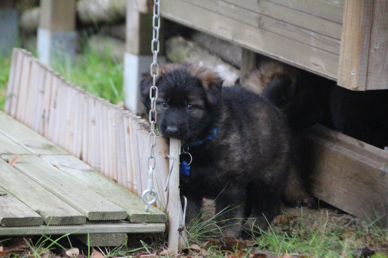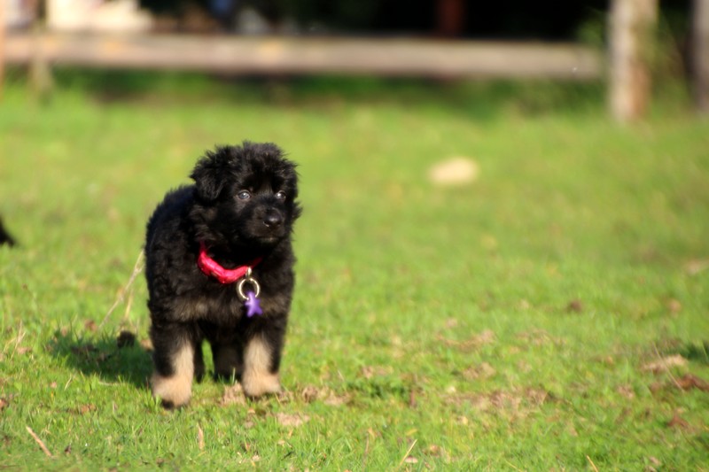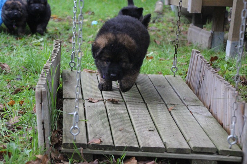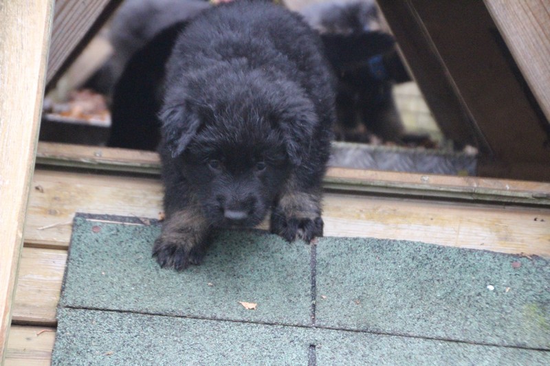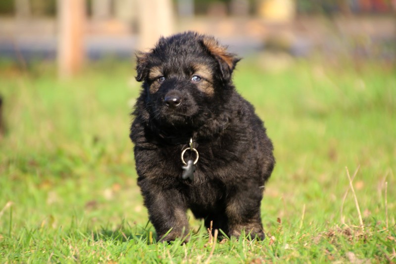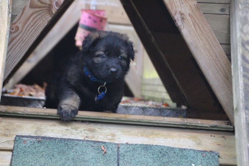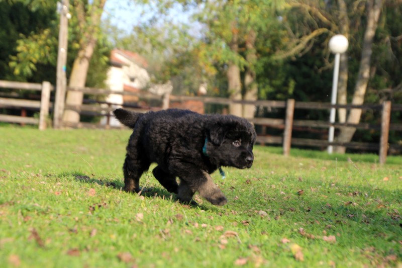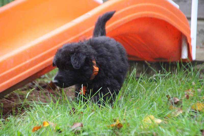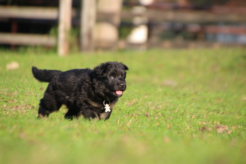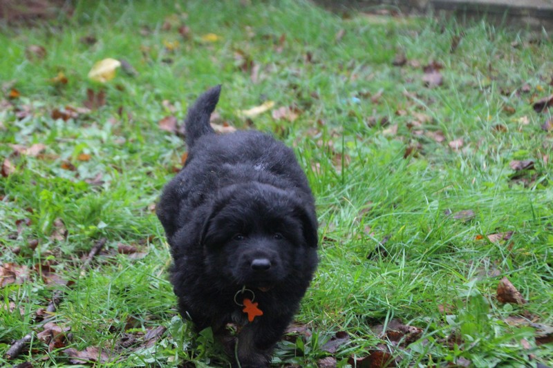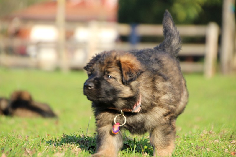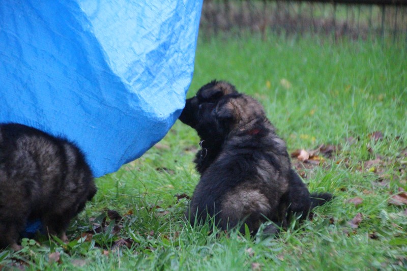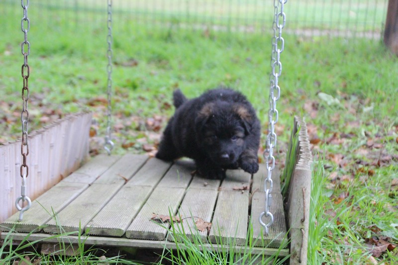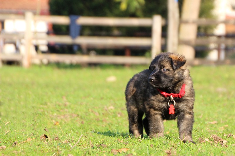 Hé coucou! c’est re nous, vous vous rendez compte ? Nous avons déjà 5 semaines et nous n’en finissons pas de découvrir la vie. Nous parlons très bien le langage canin grâce à la meute qui passe beaucoup de temps avec nous, nous arpentons le domaine par des petites promenades de-ci de-là et nous apprenons à nous repérer dans les grands espaces, bien sûr c’est toujours accompagnés de l’une de nos mamans voir les deux, mais aussi avec la meute entière. Nous savons également parfaitement faire les câlins aux humains et surtout réclamer les bras afin d’avoir nos petits moments privilégiés.