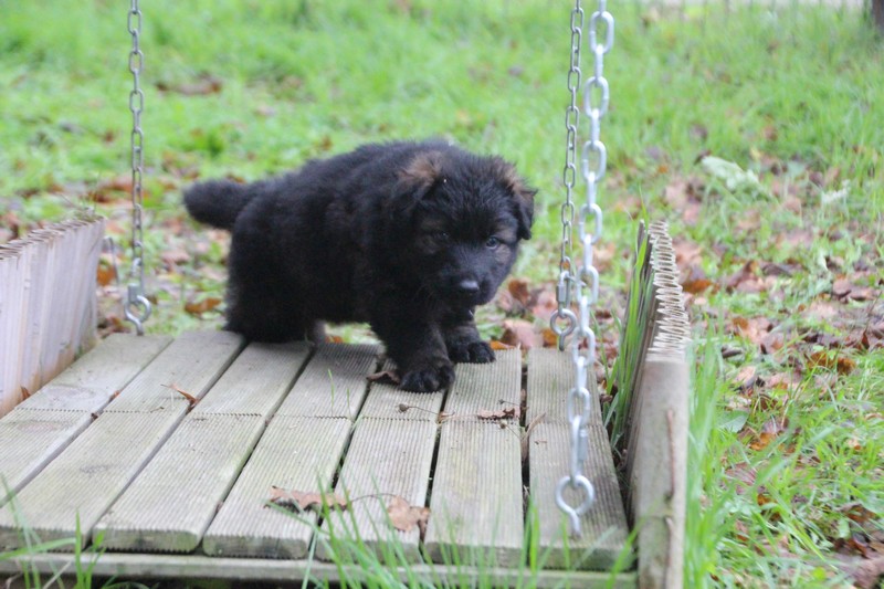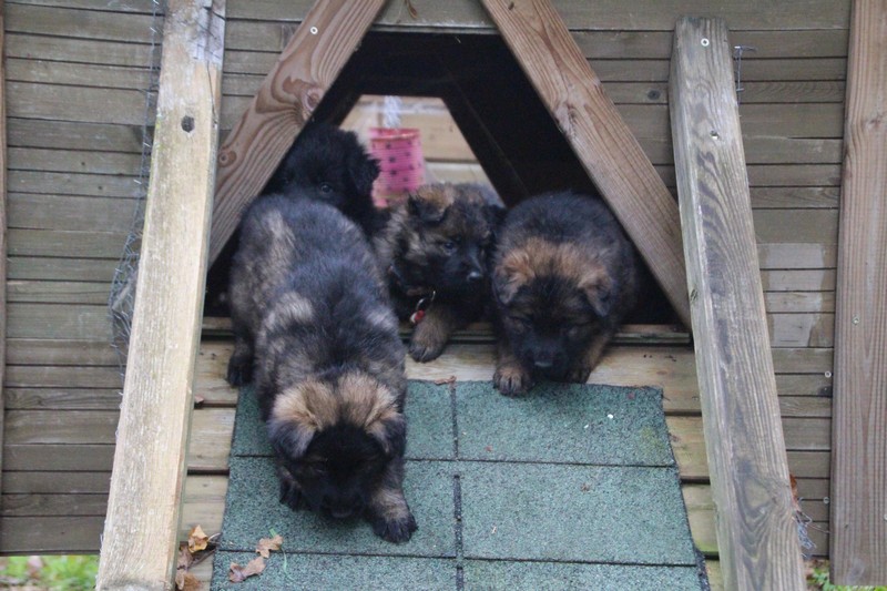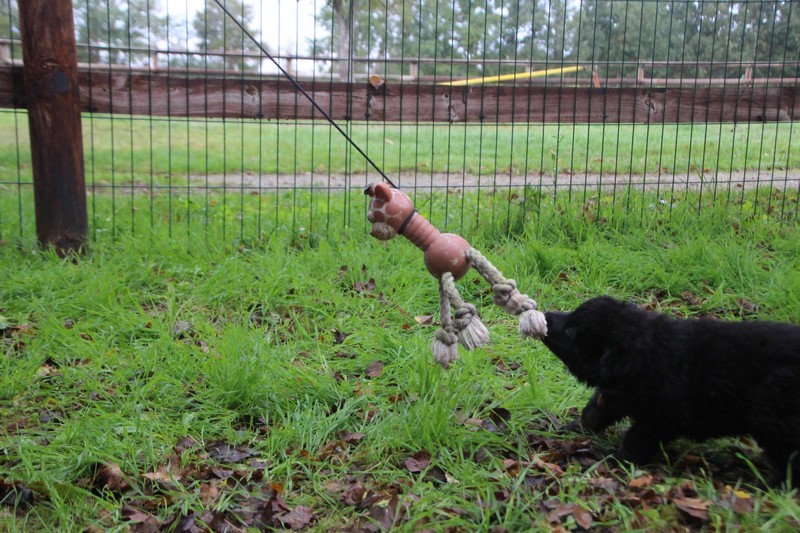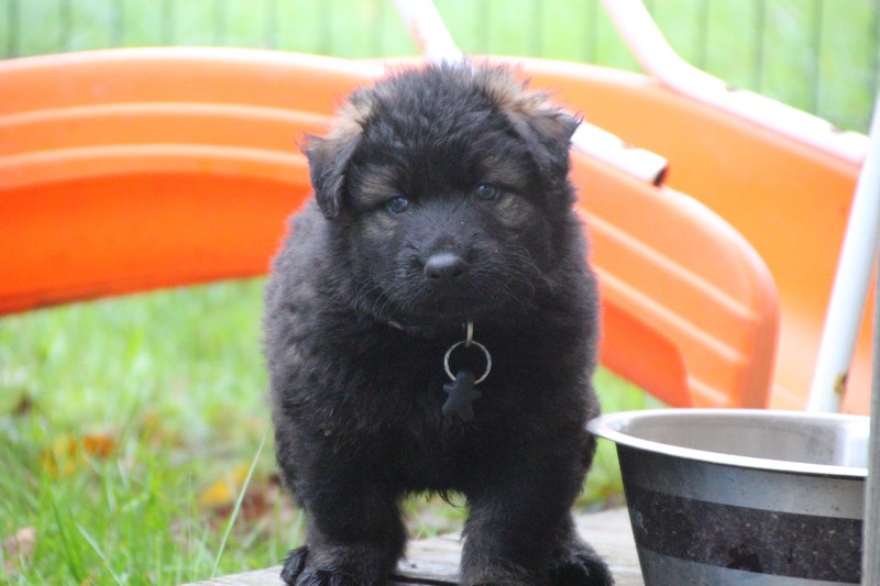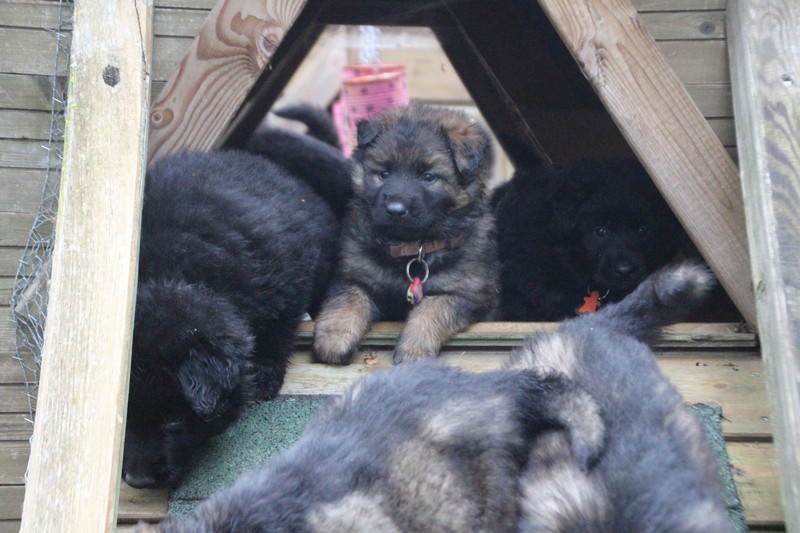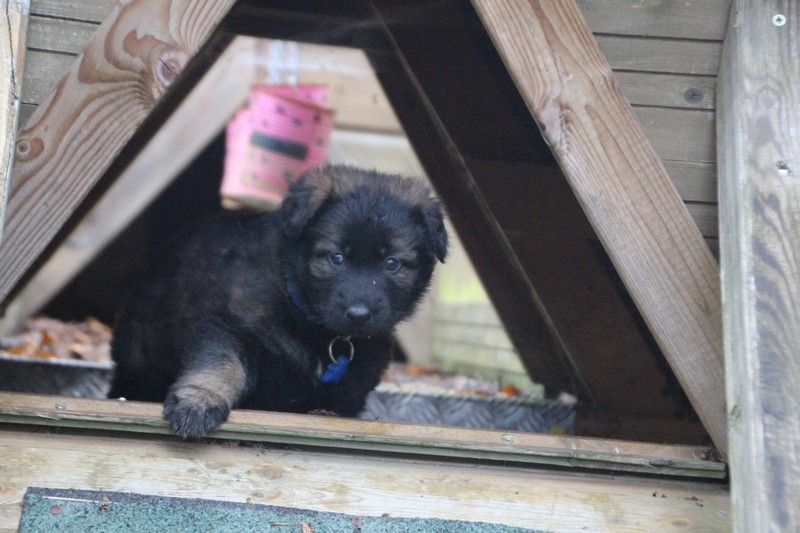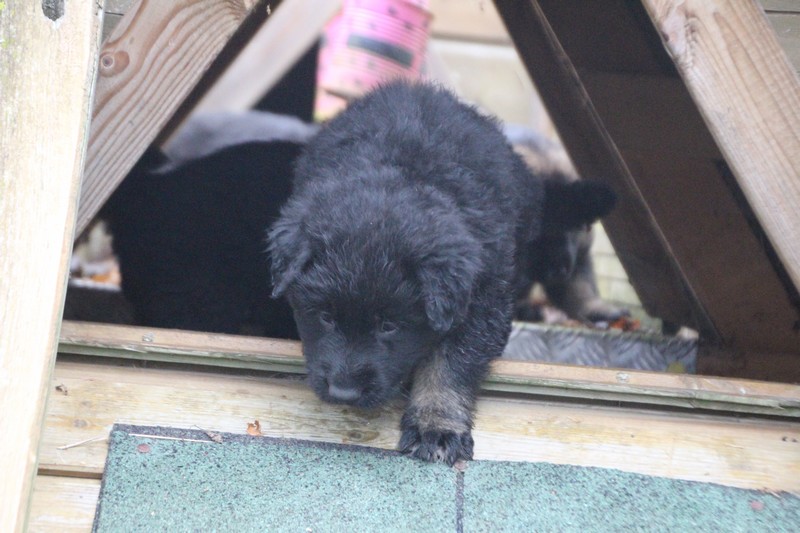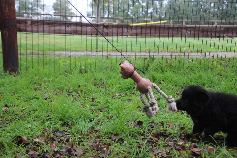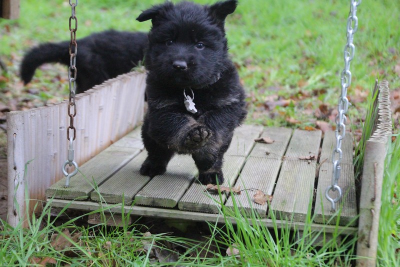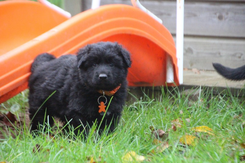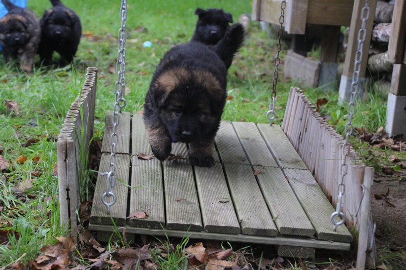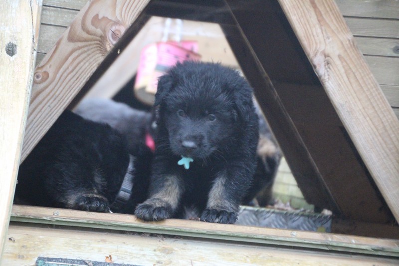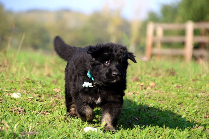 Hé coucou! c’est re nous, vous vous rendez compte ? Nous avons déjà 5 semaines et nous n’en finissons pas de découvrir la vie. Nous parlons très bien le langage canin grâce à la meute qui passe beaucoup de temps avec nous, nous arpentons le domaine par des petites promenades de-ci de-là et nous apprenons à nous repérer dans les grands espaces, bien sûr c’est toujours accompagnés de l’une de nos mamans voir les deux, mais aussi avec la meute entière. Nous savons également parfaitement faire les câlins aux humains et surtout réclamer les bras afin d’avoir nos petits moments privilégiés.