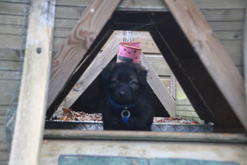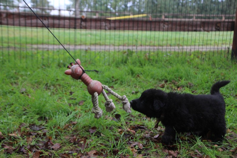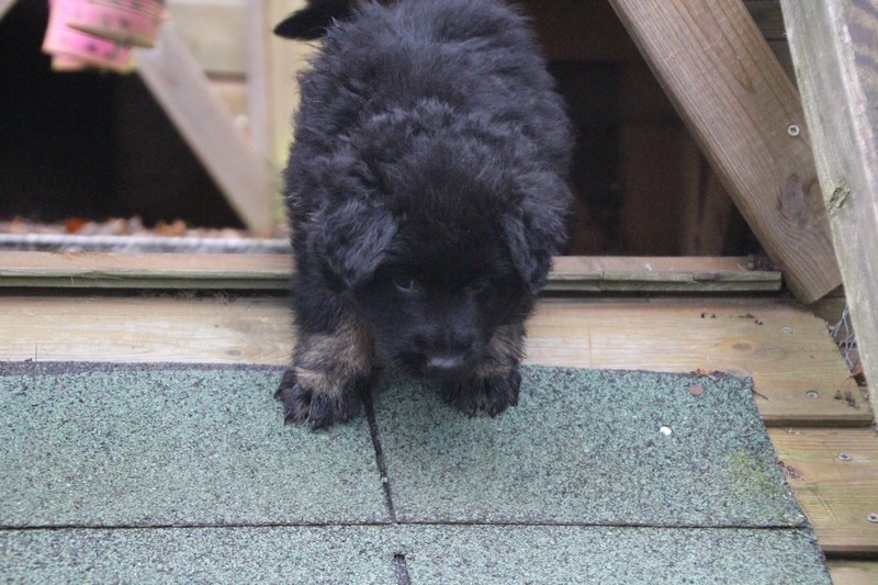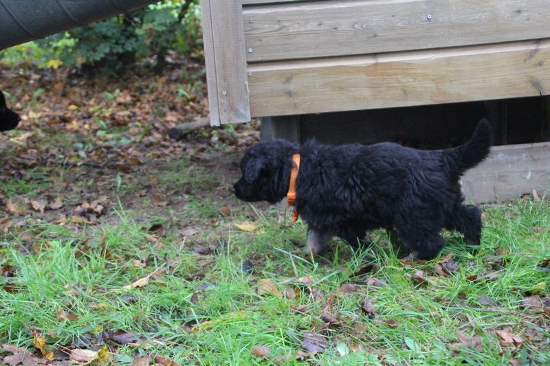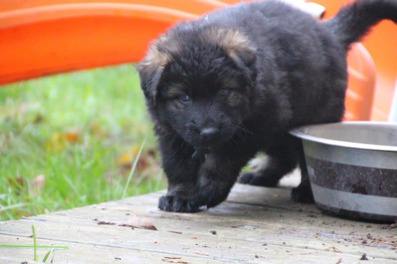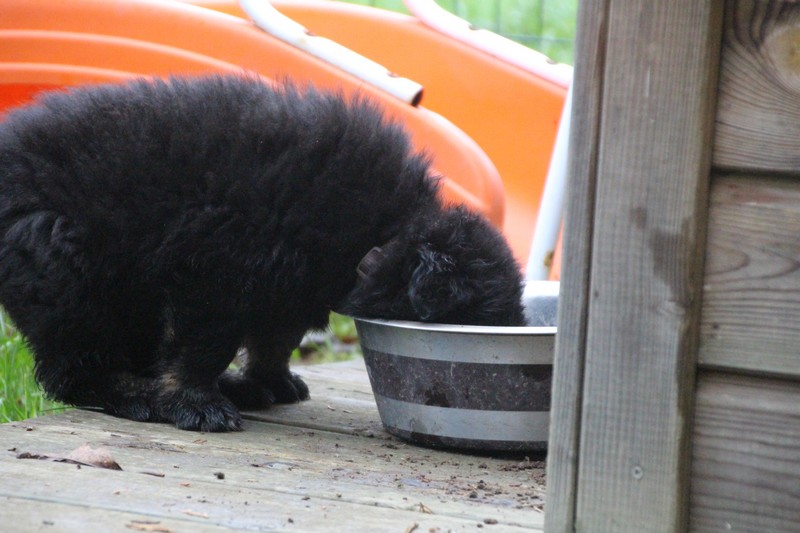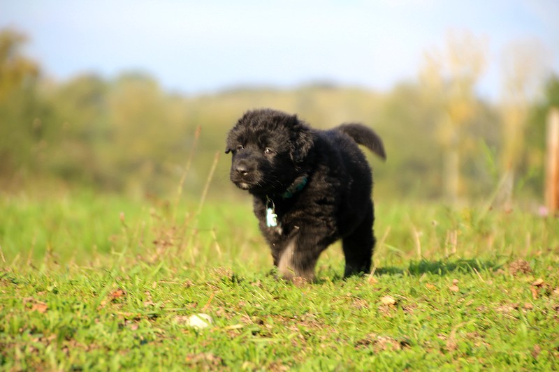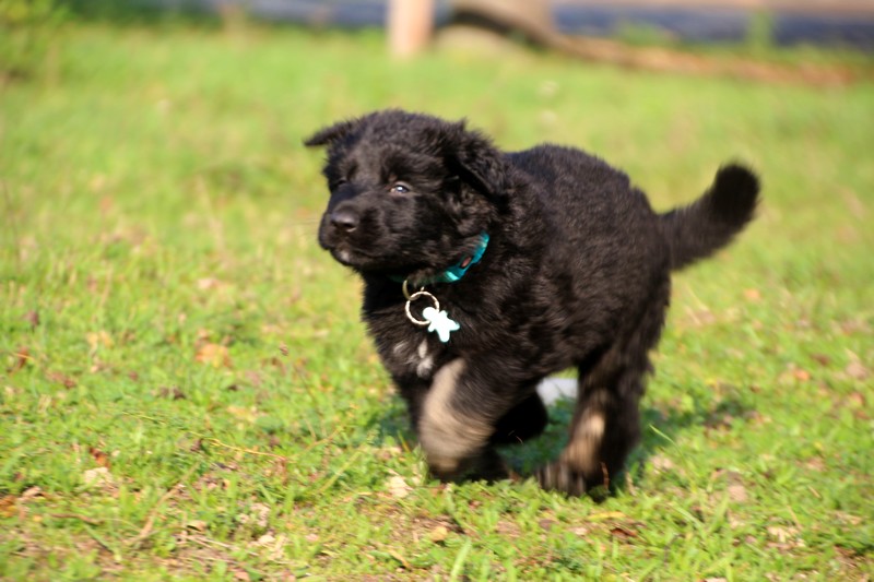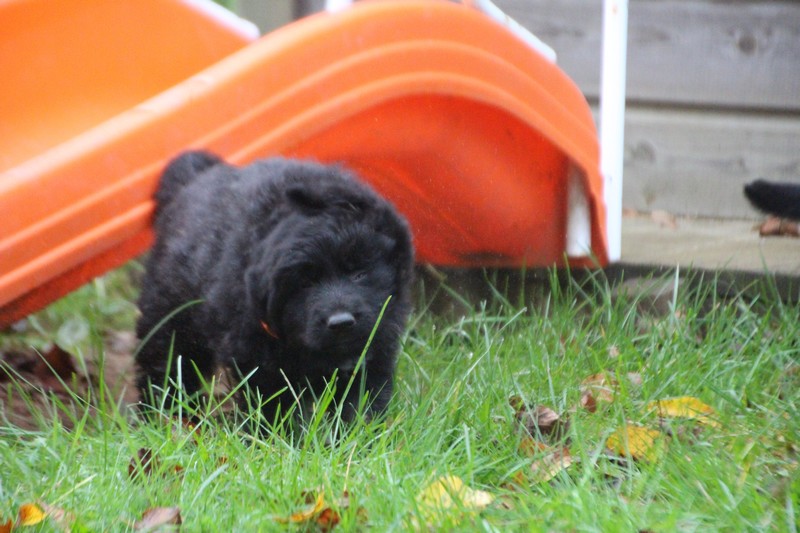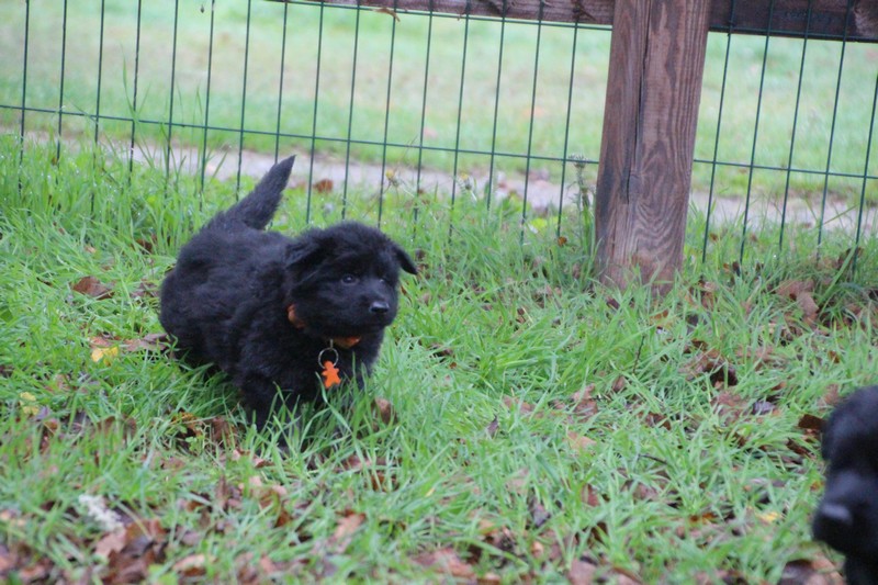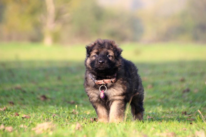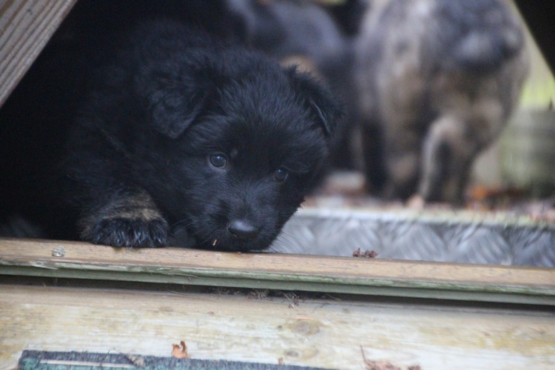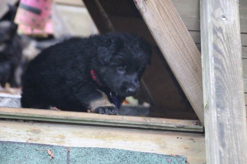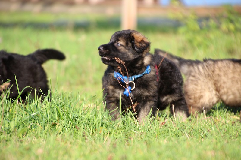 Hé coucou! c’est re nous, vous vous rendez compte ? Nous avons déjà 5 semaines et nous n’en finissons pas de découvrir la vie. Nous parlons très bien le langage canin grâce à la meute qui passe beaucoup de temps avec nous, nous arpentons le domaine par des petites promenades de-ci de-là et nous apprenons à nous repérer dans les grands espaces, bien sûr c’est toujours accompagnés de l’une de nos mamans voir les deux, mais aussi avec la meute entière. Nous savons également parfaitement faire les câlins aux humains et surtout réclamer les bras afin d’avoir nos petits moments privilégiés.