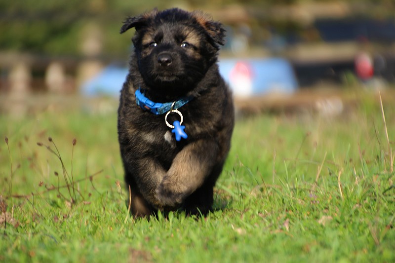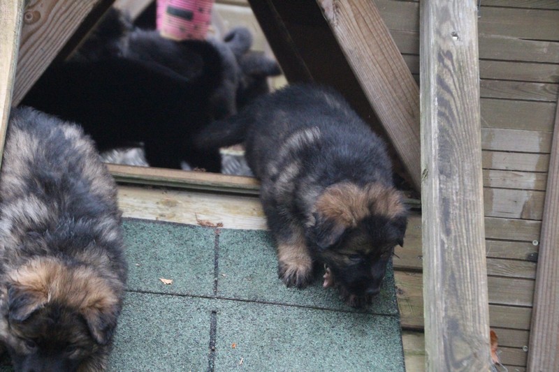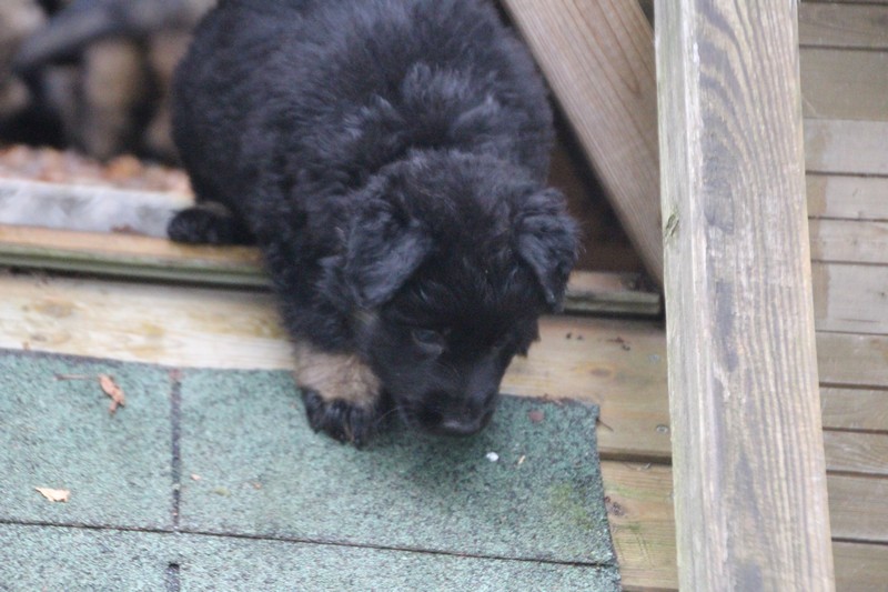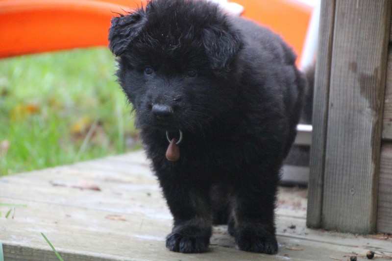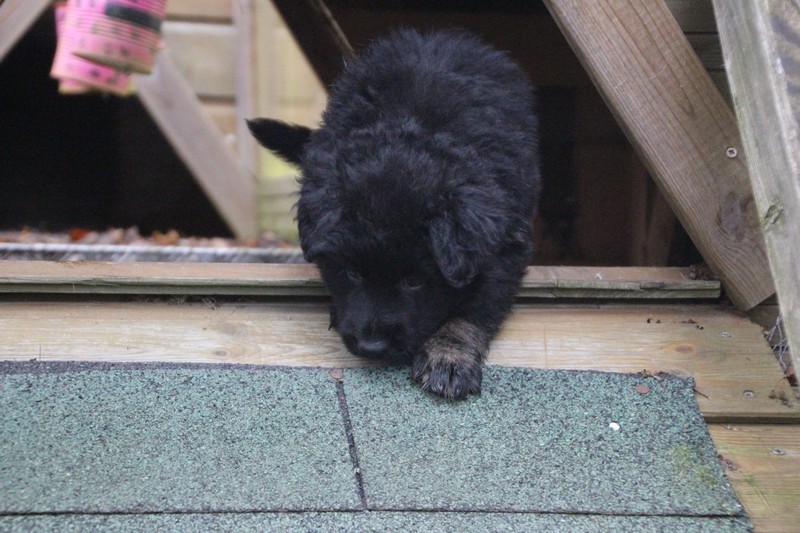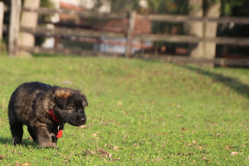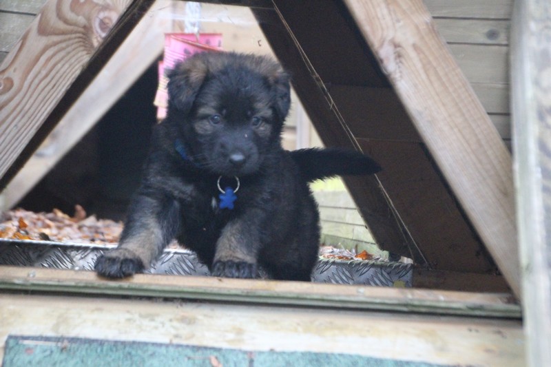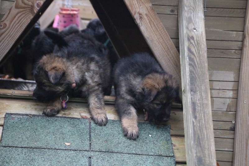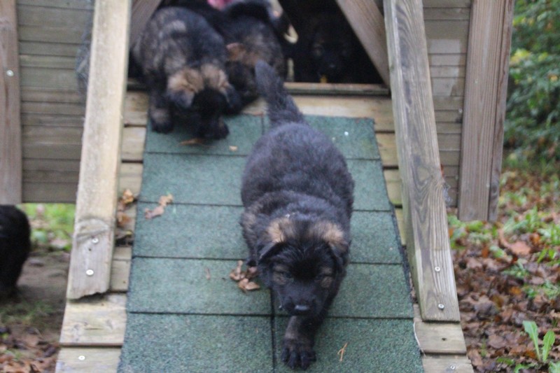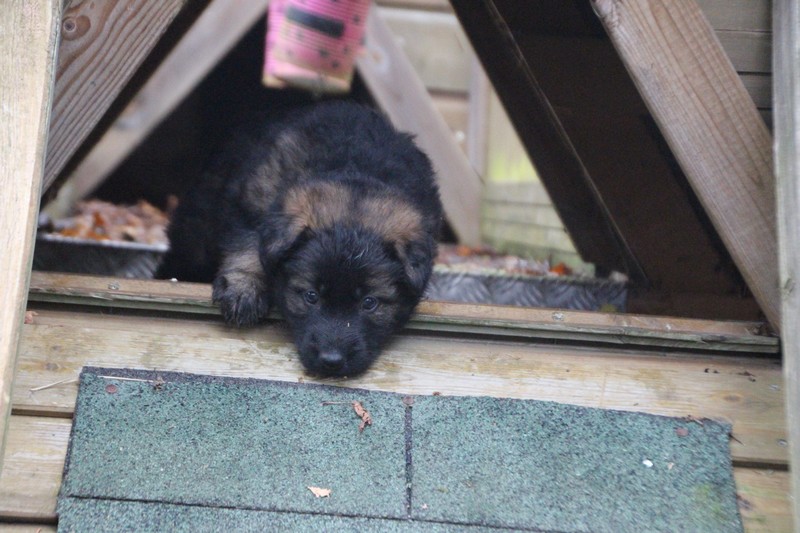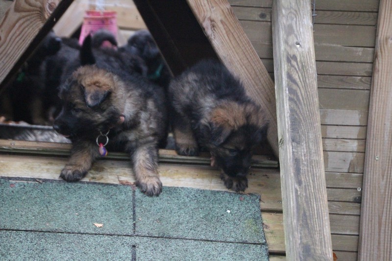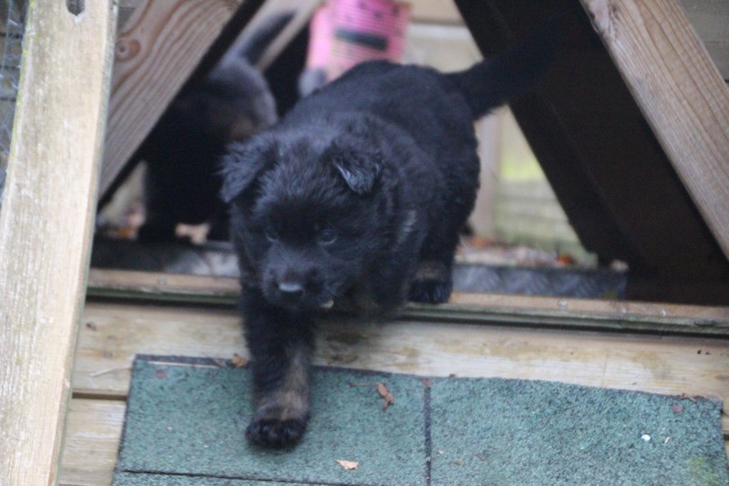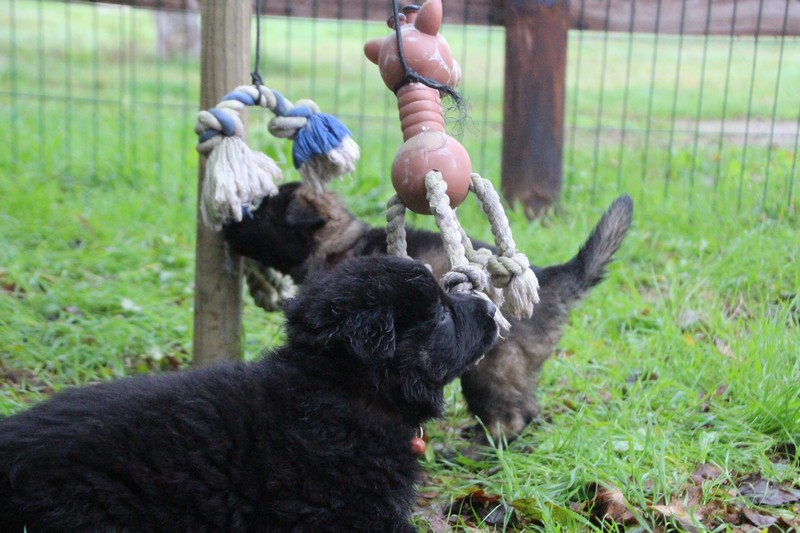 Hé coucou! c’est re nous, vous vous rendez compte ? Nous avons déjà 5 semaines et nous n’en finissons pas de découvrir la vie. Nous parlons très bien le langage canin grâce à la meute qui passe beaucoup de temps avec nous, nous arpentons le domaine par des petites promenades de-ci de-là et nous apprenons à nous repérer dans les grands espaces, bien sûr c’est toujours accompagnés de l’une de nos mamans voir les deux, mais aussi avec la meute entière. Nous savons également parfaitement faire les câlins aux humains et surtout réclamer les bras afin d’avoir nos petits moments privilégiés.