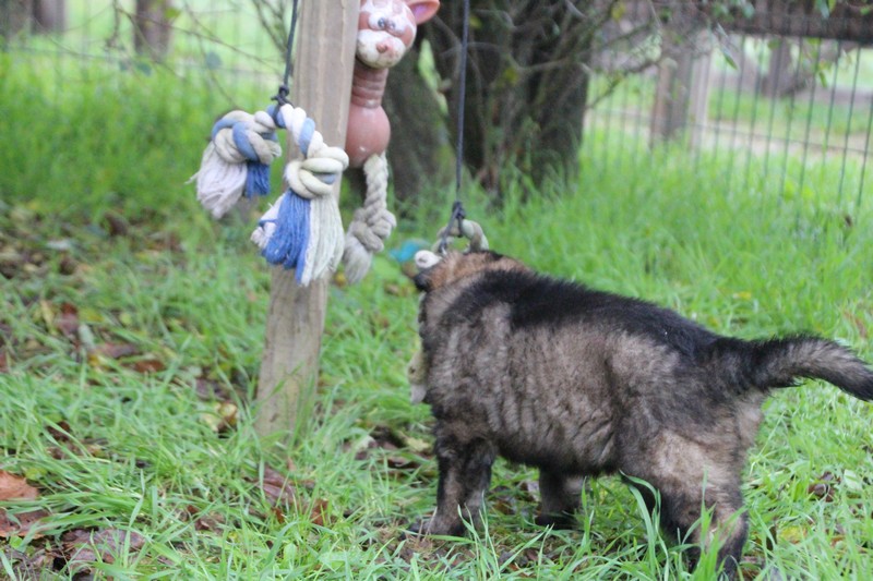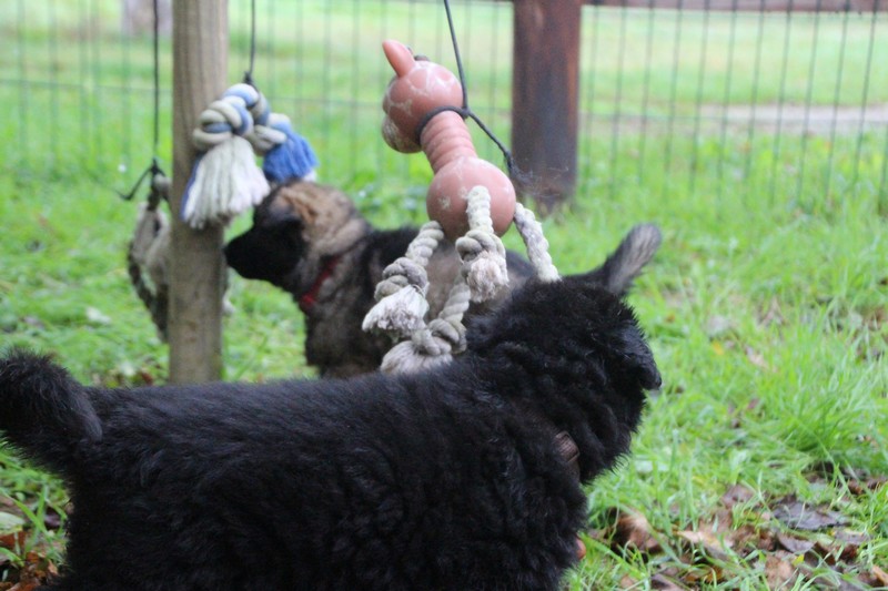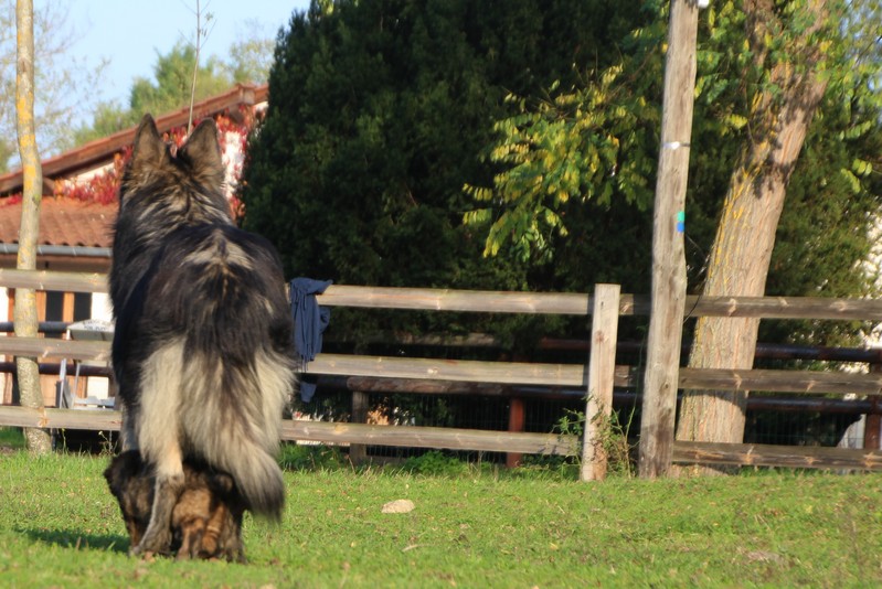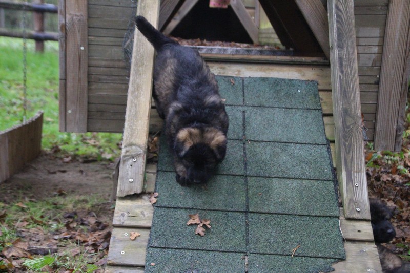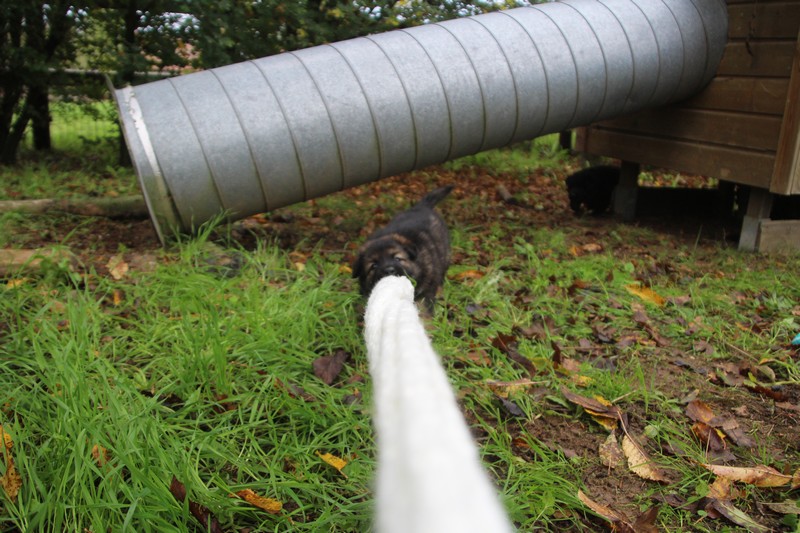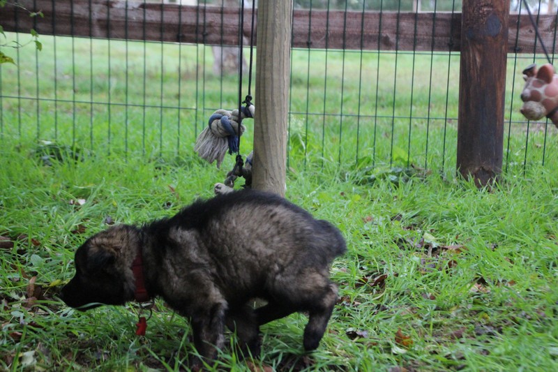 Nous avons changé de parc pour intégrer celui d’activité, c’est un endroit avec des agrès ou nous apprenons à notre rythme à franchir un tunnel, monter sur une passerelle ou sur des surfaces mobiles et surtout côtoyer les chevaux qui se trouvent de l’autre côté des barrières. Nous y passons une partie de nos journées, entrecoupées de la visite de la meute et celle de nos éleveurs qui passent du temps à nous admirer observer.