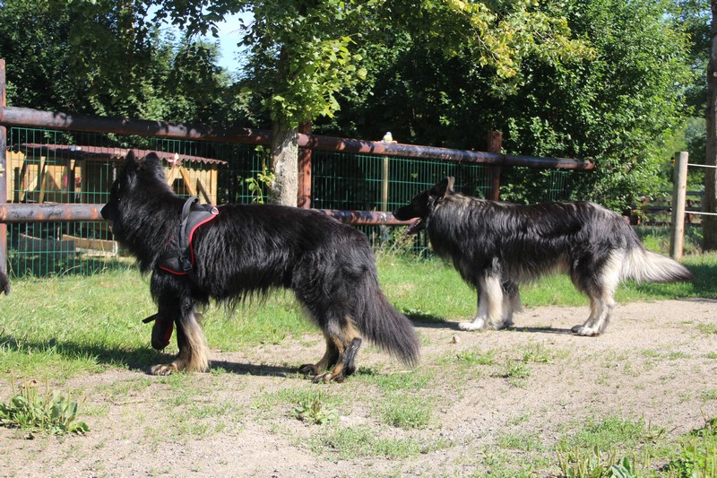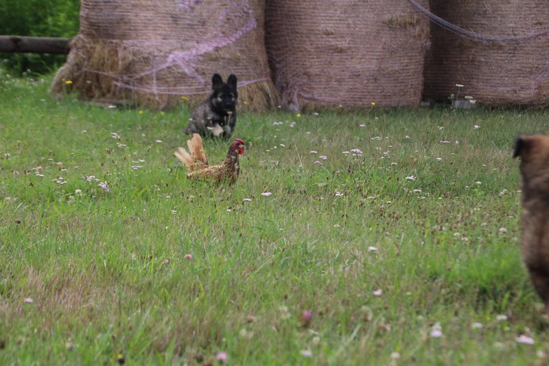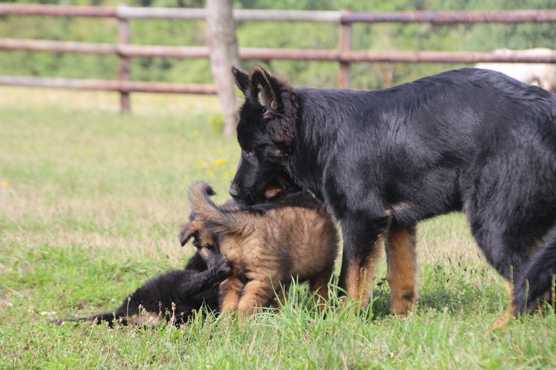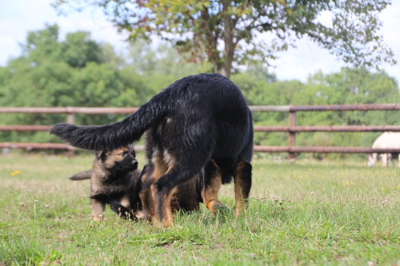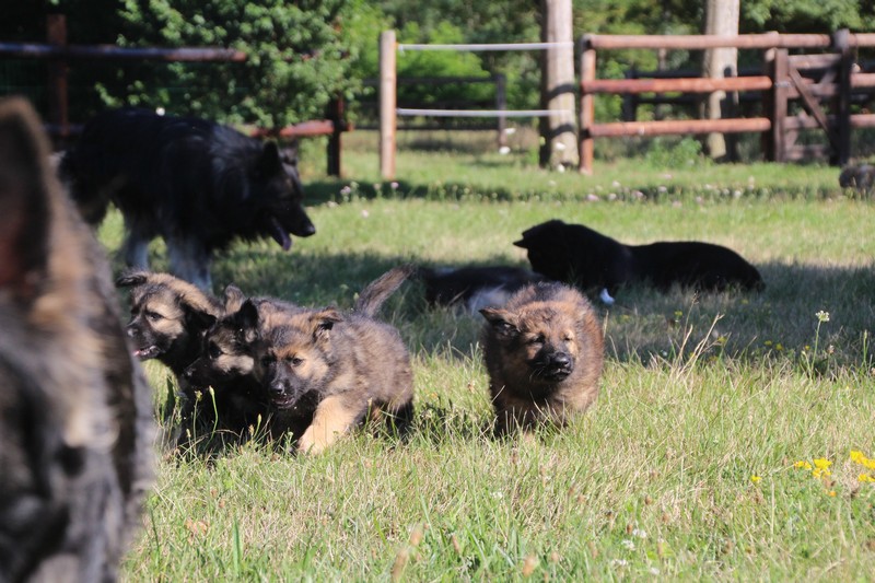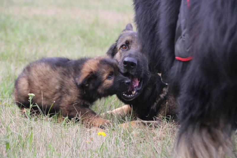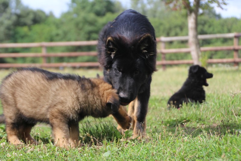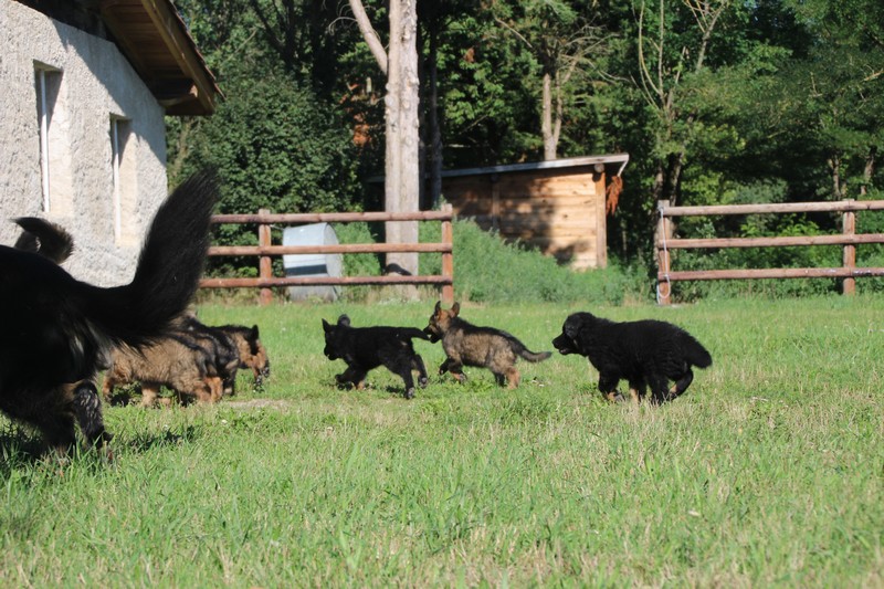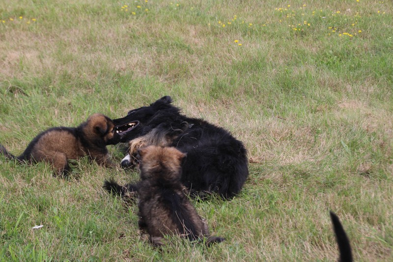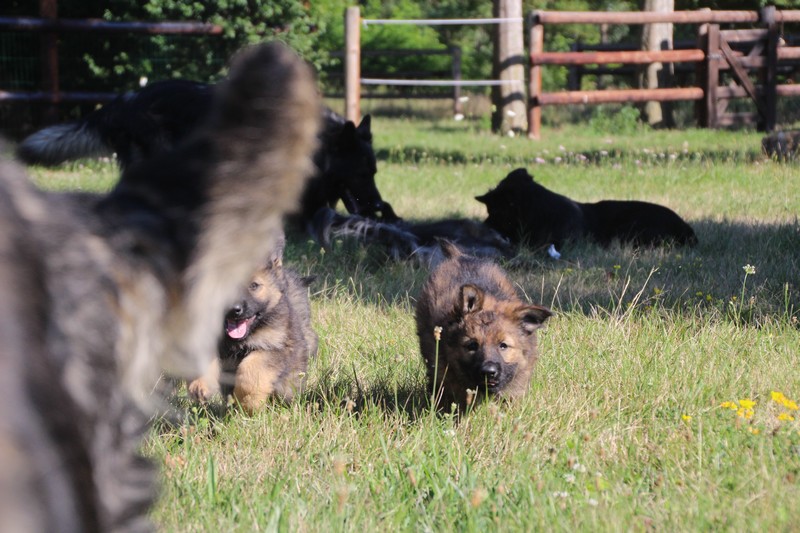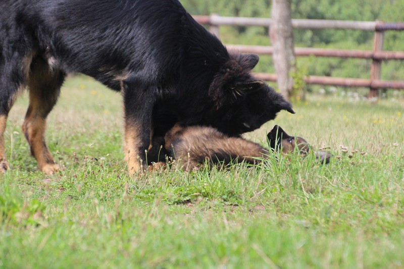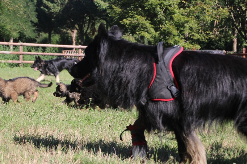 Nos journées se passent essentiellement en compagnie du reste de la meute, nous apprenons au contact des grands que tous les chiens ne sont pas forcément joueurs ou patient, nous devons donc adapter notre comportement suivant les individus, il parait que c’est l’école de la vie ! et bien des fois la vie elle n’est pas très rigolote et un peu autoritaire …