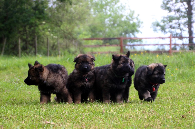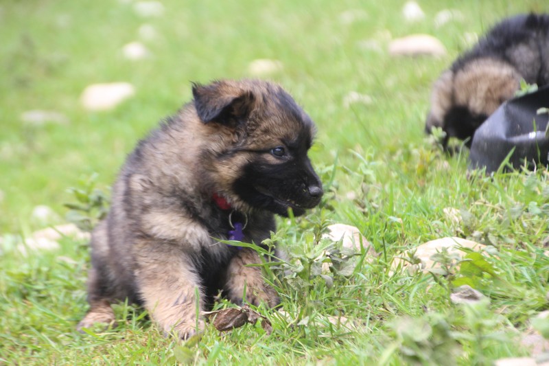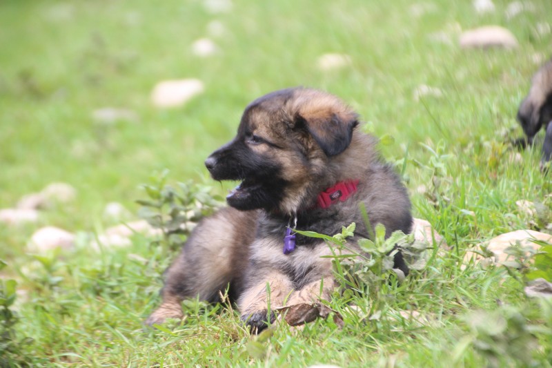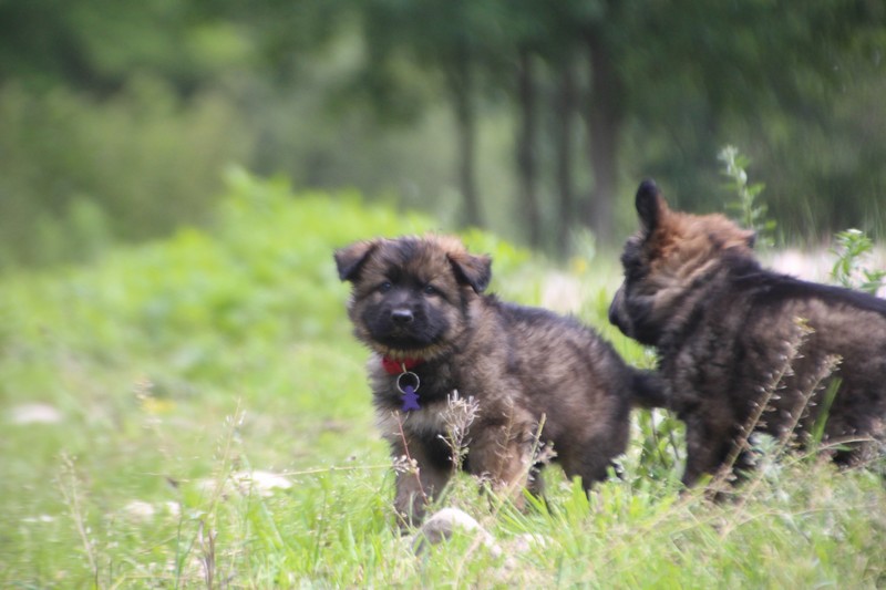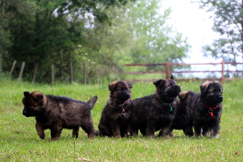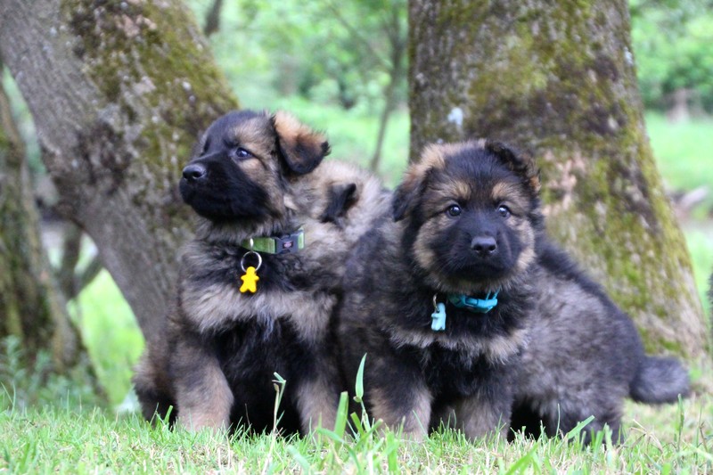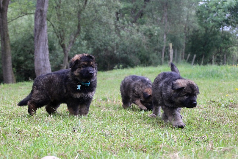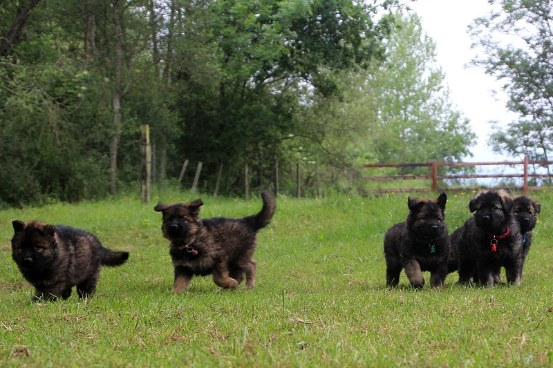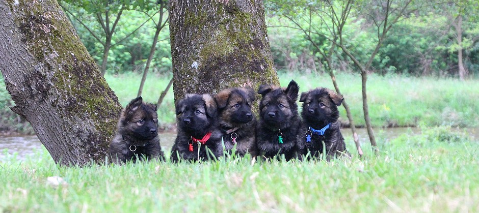 Nous voila arrivé à nos 7 semaines, ça va être le moment de mettre un nom sur nos couleurs de collier et pour cette occasion nous avons posé sous notre meilleurs profil. Enfin presque le meilleur, car les séances photos groupées ou bien alignées ne sont pas de tout repos… Pour cette occasion, nous avons appelé la famille afin de nous venir en aide! on prend, on pose, on part en courant, pendant qu’un troisième, vise, fait la mise au point et déclenche… et oui les séances photo de chiots de 7 semaines, devraient être reconnues discipline sportif des jeux olympiques…