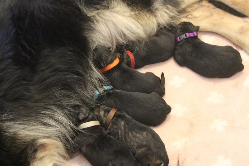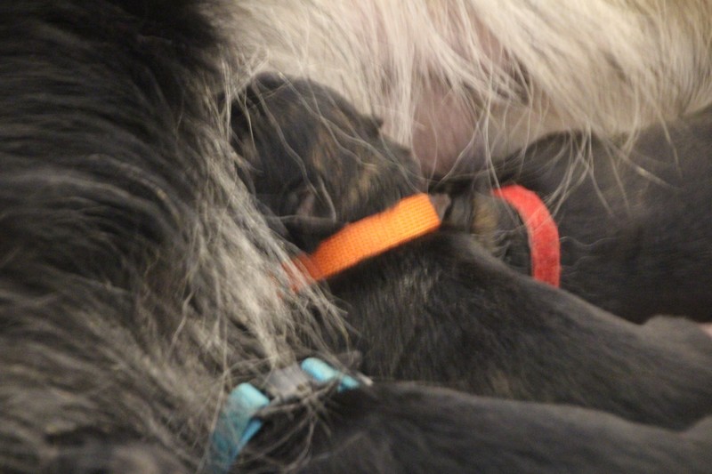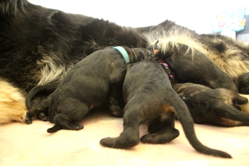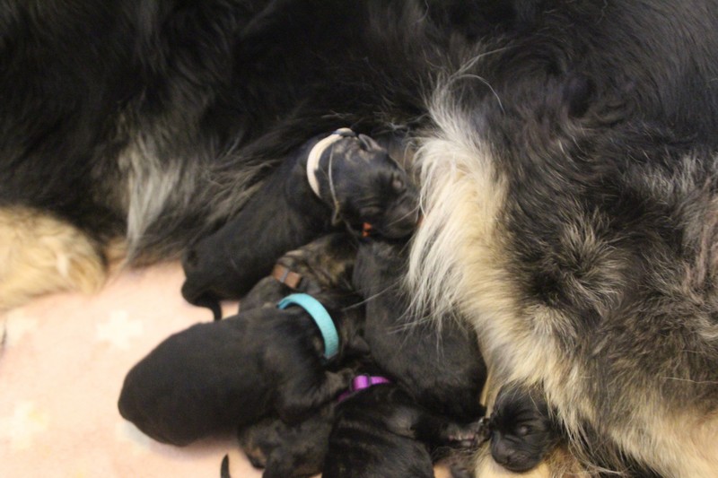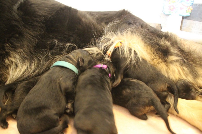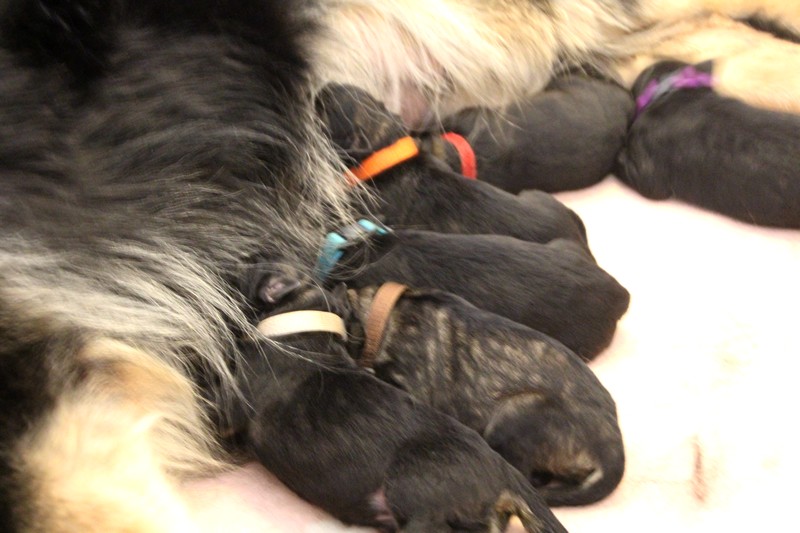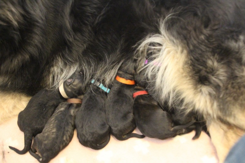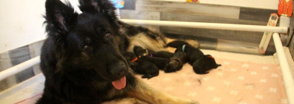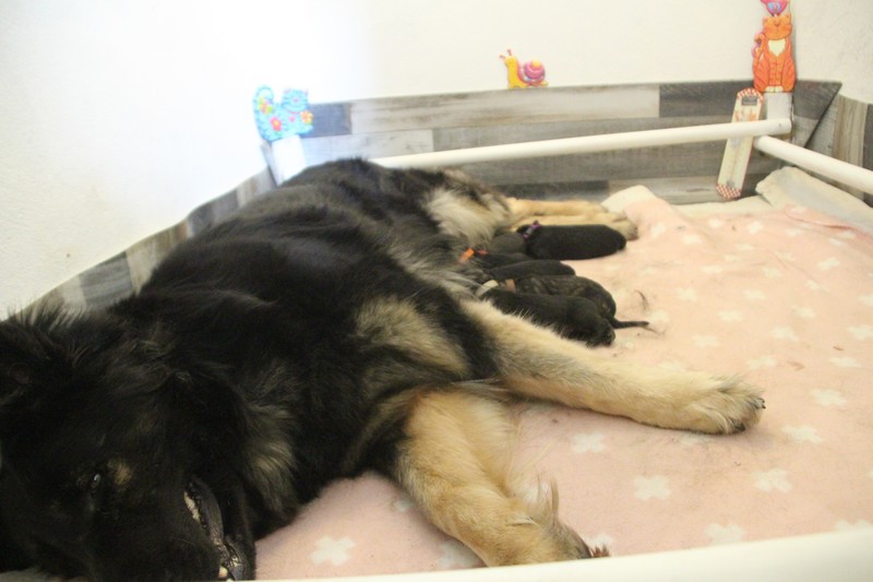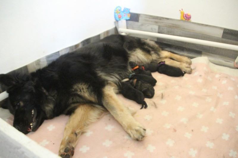 C’est avec beaucoup de calme et de sérénité que Sioux a mis au monde ses 7 merveilles, environs 1 chiot toutes les heures une vraie montre Suisse notre Sioux… Confortablement installée sur son petit matelas de mousse, elle a géré seule l’arrivée de ses petits, il y’a 5 Mâles et 2 femelles, tous très vaillants et d’un joli poids. Je vais avoir encore beaucoup de plaisir à élever ces petits bouts choux et j’espère au travers du site des photos et vidéos vous faire partager ces moments uniques.