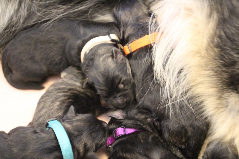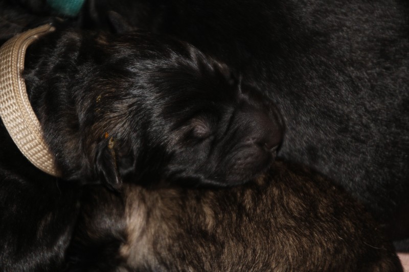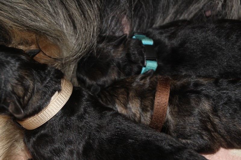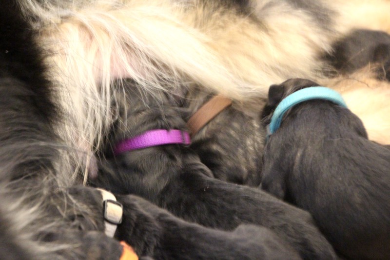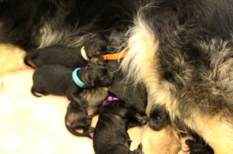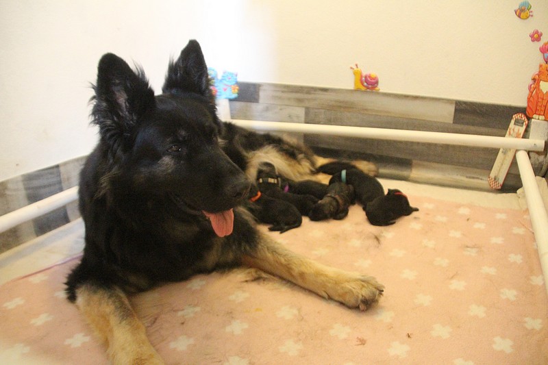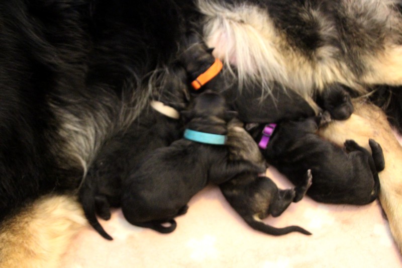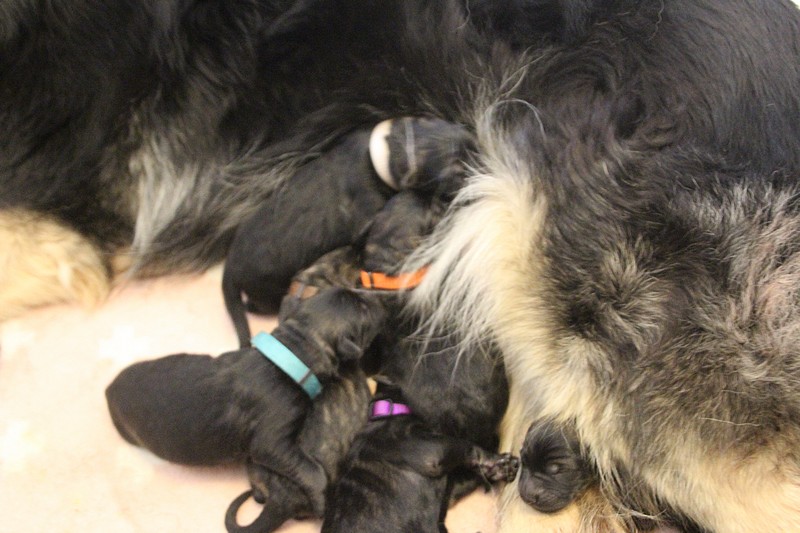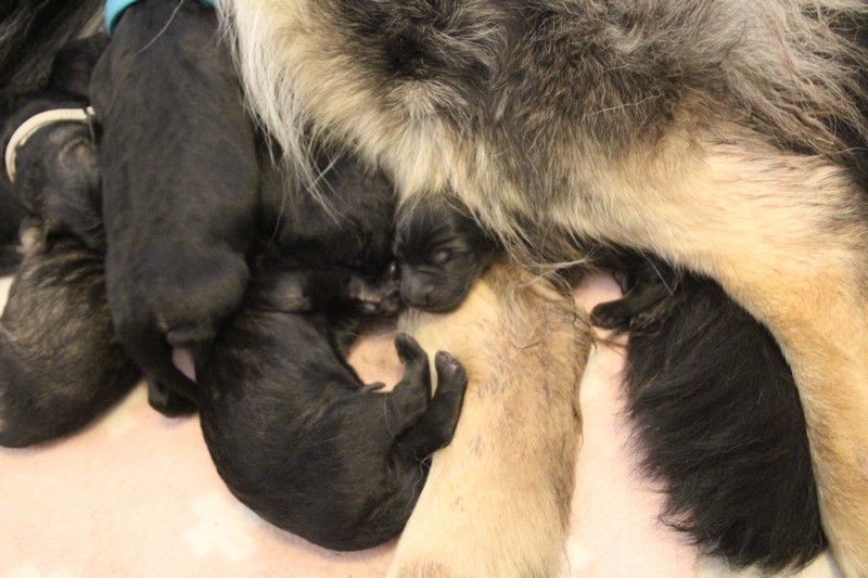 C’est avec beaucoup de calme et de sérénité que Sioux a mis au monde ses 7 merveilles, environs 1 chiot toutes les heures une vraie montre Suisse notre Sioux… Confortablement installée sur son petit matelas de mousse, elle a géré seule l’arrivée de ses petits, il y’a 5 Mâles et 2 femelles, tous très vaillants et d’un joli poids. Je vais avoir encore beaucoup de plaisir à élever ces petits bouts choux et j’espère au travers du site des photos et vidéos vous faire partager ces moments uniques.